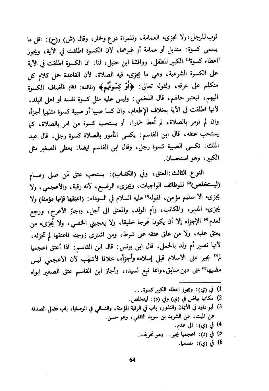 ثَوْبٌ لِلرَّجُلِ وَلَا تُجْزِئُ الْعِمَامَةُ وَلِلْمَرْأَةِ دِرْعٌ وخمار وَقَالَ ش وح أَقَلُّ مَا يُسَمَّى كِسْوَةً مِنْدِيلٌ أَوْ عِمَامَةٌ أَوْ غَيْرُهُمَا لِأَنَّ الْكِسْوَةَ أُطْلِقَتْ فِي الْآيَةِ وَيَجُوزُ إِعْطَاءُ كِسْوَةِ الْكَبِيرِ لِلطِّفْلِ وَوَافَقَنَا ابْنُ حَنْبَلٍ لَنَا أَنَّ الْكِسْوَةَ أُطْلِقَتْ فِي الْآيَةِ عَلَى الْكِسْوَةِ الشَّرْعِيَّةِ وَهِيَ مَا يُجْزِئُ فِيهِ الصَّلَاةُ لِأَنَّ الْقَاعِدَةَ حَمْلُ كَلَامِ كُلِّ مُتَكَلِّمٍ عَلَى عُرْفِهِ وَلِقَوْلِهِ تَعَالَى {أَوْ كِسْوَتُهُمْ} الْمَائِدَة 90 فَأَضَافَ الْكِسْوَةَ إِلَيْهِمْ فَيُعْتَبَرُ حَالُهُمْ قَالَ اللَّخْمِيُّ وَلَيْسَ عَلَيْهِ مِثْلُ كِسْوَةِ نَفْسِهِ أَوْ أَهْلِ الْبَلَدِ لِأَنَّهَا أُطْلِقَتْ فِي الْآيَةِ بِخِلَافِ الْإِطْعَامِ وَإِن كسا صَبيا أَو صبية كسْوَة مثلهمَا أجزاه وَإِن لم تومر بِالصَّلَاةِ لَمْ تُعْطَ خِمَارًا أَوْ يُسْتَحَبُّ كِسْوَةُ من أَمر بِالصَّلَاةِ كَمَا يسْتَحبّ عتقه قَالَ ابْنُ الْقَاسِمِ يُكْسَى الْمَأْمُورُ بِالصَّلَاةِ كِسْوَةَ رَجُلٍ قَالَ عَبْدُ الْمَلِكِ تُكْسَى الصَّبِيَّةُ كِسْوَةَ رَجُلٍ وَقَالَ ابْنُ الْقَاسِمِ أَيْضًا يُعْطَى الصَّغِيرُ مِثْلَ الْكَبِيرِ وَهُوَ اسْتِحْسَانٌ النَّوْعُ الثَّالِثُ الْعِتْقُ وَفِي الْكِتَابِ يُسْتَحَبُّ عِتْقُ مَنْ صَلَّى وَصَامَ ليستخلص للوظائف الْوَاجِبَات وَيُجْزِئُ الرَّضِيعُ لِأَنَّهُ رَقَبَةٌ وَالْأَعْجَمِيُّ وَلَا يُجْزِئُ إِلَّا سَلِيمٌ مُؤْمِنٌ لِقَوْلِهِ عَلَيْهِ السَّلَامُ فِي السَّوْدَاءِ أَعْتِقْهَا فَإِنَّهَا مُؤْمِنَةٌ وَلَا يُجْزِئُ الْمُدَبَّرُ وَالْمَكَاتَبُ وَأُمُّ الْوَلَدِ وَالْمُعْتَقُ إِلَى أَجَلٍ وَأَجَازَ الْأَعْرَجَ وَرَجَعَ لِعَدَمِ الْإِجْزَاءِ إِلَّا أَنْ يَكُونَ عَرَجًا خَفِيفًا وَلَا يُعْجِبُنِي الْخَصِيُّ وَلَا يُجْزِئُ مَنْ يُعْتَقُ عَلَيْهِ وَلَا مَنْ عُلِّقَ عِتْقُهُ عَلَى شَرْطٍ وَمَنِ اشْتَرَى زَوْجَتَهُ فَأَعْتَقَهَا لَمْ تُجْزِئْهُ لِأَنَّهَا تَصِيرُ أُمَّ وَلَدٍ بِالْحَمْلِ قَالَ ابْنُ يُونُسَ قَالَ ابْنُ الْقَاسِمِ إِذَا أَعْتَقَ أَعْجَمِيًّا لَمْ يُجْبَرْ عَلَى الْإِسْلَامِ قَبْلَ إِسْلَامِهِ وأجزأه خلافًا لأَشْهَب لِأَن الأعجمي لَيْسَ مضيها عَلَى دِينٍ سَابِقٍ وَإِنَّمَا تَبَعٌ لِسَيِّدِهِ وَأَجَازَ ابْنُ الْقَاسِمِ عِتْقَ الصَّغِيرِ أَبَوَاهُ