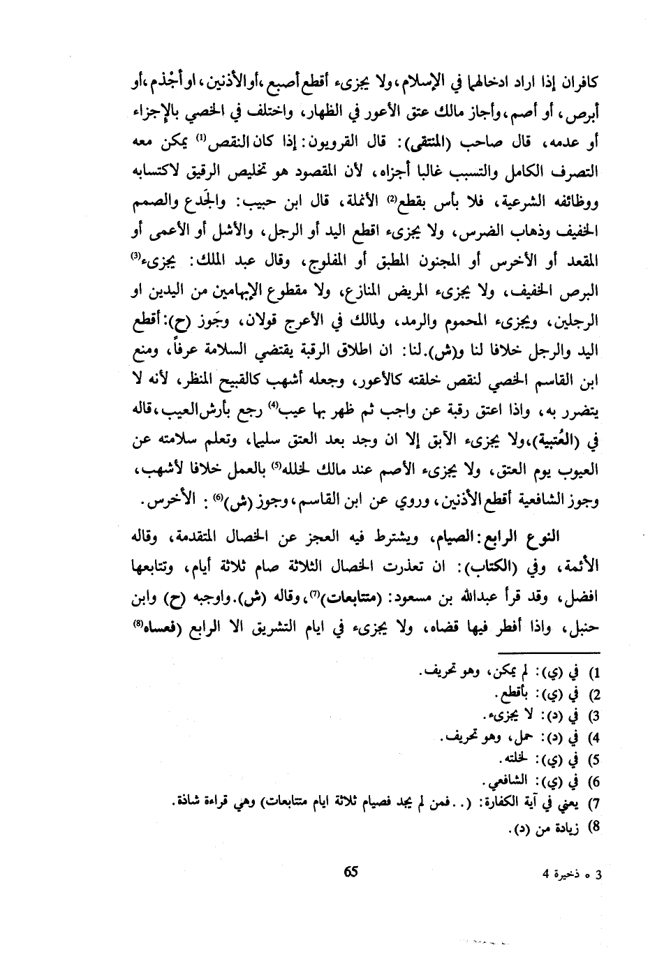كَافِرَانِ إِذَا أَرَادَ إِدْخَالَهُمَا فِي الْإِسْلَامِ وَلَا يُجْزِئُ أَقْطَعُ أُصْبُعٍ أَوِ الْأُذُنَيْنِ أَوْ أَجْذَمُ أَوْ أَبْرَصُ أَوْ أَصَمُّ وَأَجَازَ مَالِكٌ عِتْقَ الْأَعْوَرِ فِي الظِّهَارِ وَاخْتُلِفَ فِي الْخَصِيِّ بِالْإِجْزَاءِ أَوْ عَدَمِهِ قَالَ صَاحِبُ الْمُنْتَقَى قَالَ الْقَرَوِيُّونَ إِذَا كَانَ النَّقْصُ يُمْكِنُ مَعَهُ التَّصَرُّفُ الْكَامِلُ والتسبب غَالِبًا أَجْزَأَهُ لِأَنَّ الْمَقْصُودَ هُوَ تَخْلِيصُ الرَّقِيقِ لِاكْتِسَابِهِ وَوَظَائِفِهِ الشَّرْعِيَّةِ فَلَا بَأْسَ بِقَطْعِ الْأُنْمُلَةِ قَالَ ابْن حبيب والجدع وَالصَّمَمُ الْخَفِيفُ وَذَهَابُ الضِّرْسِ وَلَا يُجْزِئُ أَقْطَعُ الْيَد أَو الرجل والأشل أَوِ الْأَعْمَى أَوِ الْمُقْعَدِ أَوِ الْأَخْرَسِ أَوِ الْمَجْنُونِ الْمُطْبِقِ أَوِ الْمَفْلُوجِ وَقَالَ عَبْدُ الْمَلِكِ يُجزئ البرص الْخَفِيف وَلَا يُجزئ الْمَرِيض النازع وَلَا الْمَقْطُوعُ الْإِبْهَامَيْنِ مِنَ الْيَدَيْنِ أَوِ الرِّجْلَيْنِ وَيُجْزِئُ الْمَحْمُومُ وَالرَّمِدُ وَلِمَالِكٍ فِي الْأَعْرَجِ قَوْلَانِ وَجَوَّزَ ح أَقْطَعَ الْيَدِ وَالرِّجْلِ خِلَافًا لَنَا وش لَنَا أَنَّ إِطْلَاقَ الرَّقَبَةِ يَقْتَضِي السَّلَامَةَ عُرْفًا وَمَنَعَ ابْنُ الْقَاسِمِ الْخَصِيَّ لِنَقْصِ خِلْقَتِهِ كَالْأَعْوَرِ وَجَعَلَهُ أَشْهَبُ كَالْقَبِيحِ الْمَنْظَرِ لِأَنَّهُ لَا يَتَضَرَّرُ بِهِ وَإِذَا أَعْتَقَ رَقَبَةً عَنْ وَاجِبٍ ثُمَّ ظَهَرَ بِهَا عَيْبٌ رَجَعَ بِأَرْشِ الْعَيْبِ قَالَهُ فِي الْعُتْبِيَّةِ وَلَا يُجْزِئُ الْآبِقُ إِلَّا إِنْ وُجِدَ بَعْدَ الْعِتْقِ سَلِيمًا وَتُعْلَمُ سَلَامَتُهُ عَنِ الْعُيُوبِ يَوْمَ الْعِتْقِ وَلَا يُجْزِئُ الْأَصَمُّ عِنْدَ مَالِكٍ لِخَلَلِهِ بِالْعَمَلِ خِلَافًا لِأَشْهَبَ وَجَوَّزَ الشَّافِعِيَّةُ أَقْطَعَ الْأُذُنَيْنِ وَرُوِيَ عَنِ ابْنِ الْقَاسِمِ وَجَوَّزَ ش الْأَخْرَس " النَّوْع الرَّابِع الصّيام ويسترط فِيهِ الْعَجْزُ عَنِ الْخِصَالِ الْمُتَقَدِّمَةِ وَقَالَهُ الْأَئِمَّةُ وَفِي الْكِتَابِ إِنْ تَعَذَّرَتِ الْخِصَالُ الثَّلَاثَةُ صَامَ ثَلَاثَةَ أَيَّامٍ وَتَتَابُعُهَا أَفْضَلُ وَقَدْ قَرَأَ عَبْدُ اللَّهِ بْنُ مَسْعُودٍ مُتَتَابِعَاتٍ وَقَالَهُ ش وَأَوْجَبَهُ ح وَابْنُ حَنْبَلٍ وَإِذَا أَفْطَرَ فِيهَا قَضَاهُ وَلَا يُجْزِئُ فِي أَيَّامِ التَّشْرِيقِ إِلَّا الرَّابِعُ فعساه