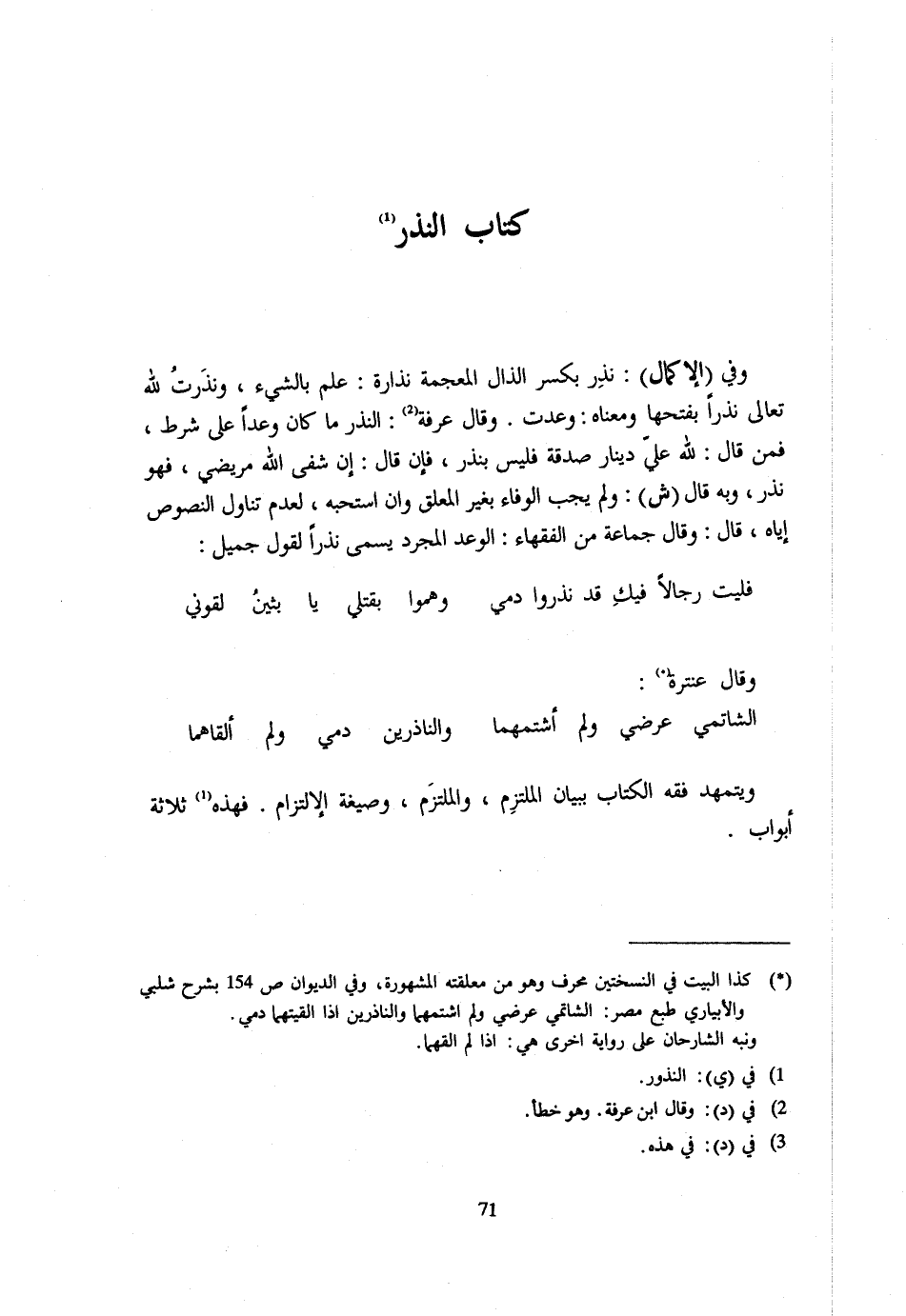 وَفِي الْإِكْمَالِ نَذِرَ بِكَسْرِ الذَّالِ الْمُعْجَمَةِ نِذَارَةً عَلِمَ بِالشَّيْءِ وَنَذَرْتُ لِلَّهِ تَعَالَى نذرا يفتحها وَمَعْنَاهُ وعدت وَقَالَ عَرَفَةُ النَذْرُ مَا كَانَ وَعْدًا عَلَى شَرْطٍ فَمَنْ قَالَ لِلَّهِ عَلَيَّ دِينَارٌ صَدَقَةً فَلَيْسَ بِنَذْرٍ فَإِنْ قَالَ إِنْ شَفَى اللَّهُ مَرِيضِي فَهُوَ نذر وَبِه قَالَ ش وَلم يَجِبِ الْوَفَاءُ بِغَيْرِ الْمُعَلَّقِ وَإِنِ اسْتَحَبَّهُ لِعَدَمِ تَنَاوُلِ النُّصُوصِ إِيَّاهُ قَالَ وَقَالَ جَمَاعَةٌ مِنَ الْفُقَهَاءِ الْوَعْدُ الْمُجَرَّدُ يُسَمَّى نَذْرًا لِقَوْلِ جَمِيلٍ