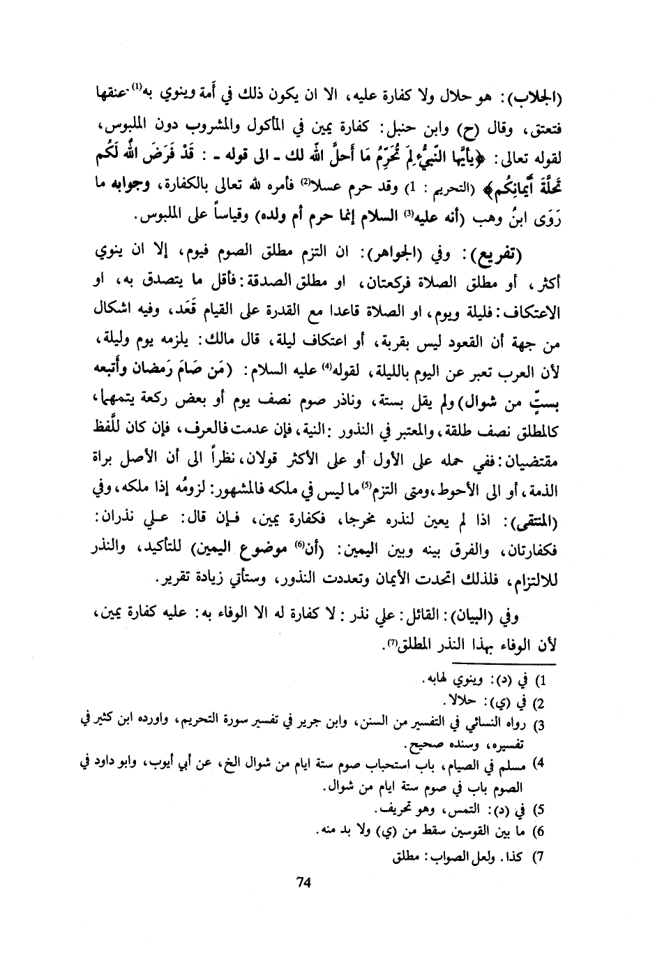 الْجَلَّابِ هُوَ حَلَالٌ وَلَا كَفَّارَةَ عَلَيْهِ إِلَّا أَنْ يَكُونَ ذَلِكَ فِي أَمَةٍ وَيَنْوِيَ بِهِ عُنُقهَا فَتُعْتَقَ وَقَالَ ح وَابْنُ حَنْبَلٍ كَفَّارَةُ يَمِينٍ فِي الْمَأْكُولِ وَالْمَشْرُوبِ دُونَ الْمَلْبُوسِ لِقَوْلِهِ تَعَالَى {ياأيها النَّبِيُّ لِمَ تُحَرِّمُ مَا أَحَلَّ اللَّهُ لَكَ إِلَى قَوْله قد فرض الله لكم تَحِلَّة أَيْمَانكُم} التَّحْرِيم 1 وَقد حرم عسلا فَأمره لله تَعَالَى بِالْكَفَّارَةِ وَجَوَابُهُ مَا رَوَى ابْنُ وَهْبٍ أَنَّهُ عَلَيْهِ السَّلَامُ إِنَّمَا حَرَّمَ أُمَّ وَلَدِهِ وَقِيَاسًا عَلَى الْمَلْبُوسِ تَفْرِيعٌ وَفِي الْجَوَاهِرِ إِنِ الْتَزَمَ مُطْلَقَ الصَّوْمِ فَيَوْمٌ إِلَّا أَنْ يَنْوِيَ أَكْثَرَ أَوْ مُطْلَقَ الصَّلَاةِ فَرَكْعَتَانِ أَوْ مُطْلَقَ الصَّدَقَةِ فَأَقَلُّ مَا يُتَصَدَّقُ بِهِ أَوْ الِاعْتِكَافَ فَلَيْلَةٌ وَيَوْمٌ أَوِ الصَّلَاةَ قَاعِدًا مَعَ الْقُدْرَةِ عَلَى الْقِيَامِ قَعَدَ وَفِيهِ إِشْكَالٌ مِنْ جِهَةِ أَنَّ الْقُعُودَ لَيْسَ بِقُرْبَةٍ أَوِ اعْتِكَافَ لَيْلَةٍ قَالَ مَالِكٌ يَلْزَمُهُ يَوْمٌ وَلَيْلَةٌ لِأَنَّ الْعَرَبَ تُعَبِّرُ عَنِ الْيَوْمِ بِاللَّيْلَةِ لِقَوْلِهِ عَلَيْهِ السَّلَامُ مَنْ صَامَ رَمَضَانَ وَأَتْبَعَهُ بِسِتٍّ مِنْ شَوَّالٍ وَلَمْ يَقُلْ بِسِتَّةٍ وَنَاذِرُ صَوْمِ نِصْفِ يَوْمٍ أَوْ بَعْضِ رَكْعَةٍ يُتِمُّهُمَا كَالْمُطَلِّقِ نِصْفَ طَلْقَةٍ وَالْمُعْتَبَرُ فِي النُّذُورِ النِّيَّةُ فَإِنْ عُدِمَتْ فَالْعُرْفُ فَإِنْ كَانَ لِلَّفْظِ مُقْتَضَيَانِ فَفِي حَمْلِهِ عَلَى الْأَوَّلِ أَوْ عَلَى الْأَكْثَرِ قَوْلَانِ نَظَرًا إِلَى أَن الأَصْل براة الذِّمَّةِ أَوْ إِلَى الْأَحْوَطِ وَمَتَى الْتَزَمَ مَا لَيْسَ فِي مِلْكِهِ فَالْمَشْهُورُ لُزُومُهُ إِذَا مَلَكَهُ وَفِي الْمُنْتَقَى إِذَا لَمْ يُعَيِّنْ لِنَذْرِهِ مَخْرَجًا فَكَفَّارَةُ يَمِينٍ فَإِنْ قَالَ عَلَيَّ نَذْرَانِ فَكَفَّارَتَانِ وَالْفَرْقُ بَيْنَهُ وَبَيْنَ الْيَمِينِ أَنَّ مَوْضُوعَ الْيَمِينِ لِلتَّأْكِيدِ وَالنَذْرَ لِلِالْتِزَامِ فَلِذَلِكَ اتَّحَدَتِ الْأَيْمَانُ وَتَعَدَّدَتِ النذور وَسَتَأْتِي زِيَادَة تَقْرِير وَفِي الْبَيَان اقائل عَلَيَّ نَذْرٌ لَا كَفَّارَةَ لَهُ إِلَّا الْوَفَاءُ بِهِ عَلَيْهِ كَفَّارَةُ يَمِينٍ لِأَنَّ الْوَفَاءُ بِهَذَا النّذر الْمُطلق