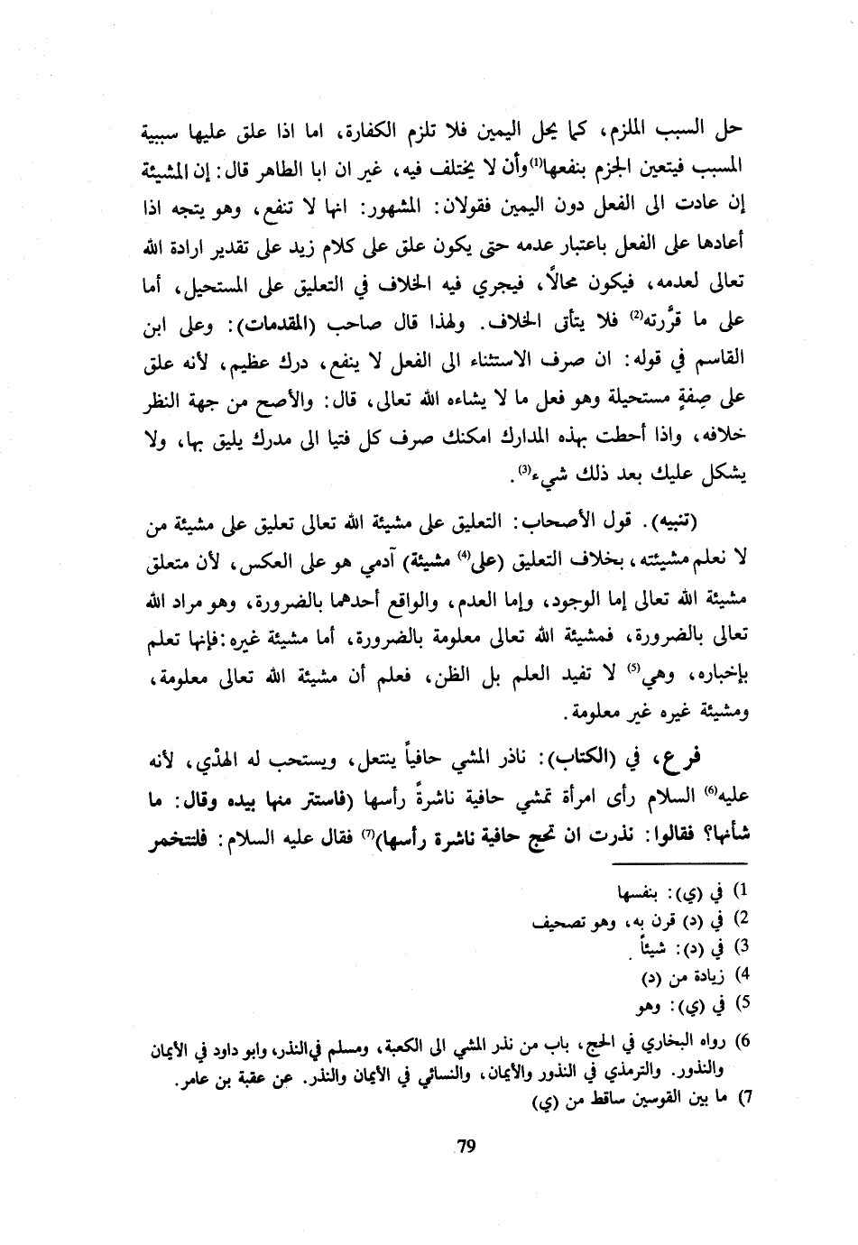 حَلِّ السَّبَبِ الْمُلْزَمِ كَمَا يُحِلُّ الْيَمِينُ فَلَا تَلْزَمُ الْكَفَّارَةُ أَمَّا إِذَا عَلَّقَ عَلَيْهَا سَبَبَيْةَ الْمُسَبّب فَيتَعَيَّن الْجَزْم بنفعها وان لَا يُخْتَلَفَ فِيهِ غَيْرَ أَنَّ أَبَا الطَّاهِرِ قَالَ إِنَّ الْمَشِيئَةَ إِنْ عَادَتْ إِلَى الْفِعْلِ دُونَ الْيَمِينِ فَقَوْلَانِ الْمَشْهُورُ أَنَّهَا لَا تَنْفَعُ وَهُوَ يَتَّجِهُ إِذَا أَعَادَهَا عَلَى الْفِعْلِ بِاعْتِبَارِ عَدَمِهِ حَتَّى يَكُونَ عُلِّقَ عَلَى كَلَامِ زَيْدٍ عَلَى تَقْدِيرِ إِرَادَةِ اللَّهِ تَعَالَى لِعَدَمِهِ فَيَكُونُ مُحَالًا فيجزي فِيهِ الْخِلَافُ فِي التَّعْلِيقِ عَلَى الْمُسْتَحِيلِ أَمَّا عَلَى مَا قَرَّرْتُهُ فَلَا يَتَأَتَّى الْخِلَافُ وَلِهَذَا قَالَ صَاحِبُ الْمُقَدَّمَاتِ وَعَلَى ابْنِ الْقَاسِمِ فِي قَوْلِهِ إِنَّ صَرْفَ الِاسْتِثْنَاءِ إِلَى الْفِعْلِ لَا يَنْفَعُ دَرْكٌ عَظِيمٌ لِأَنَّهُ عُلِّقَ عَلَى صِفَةٍ مستحيلة وَهُوَ فعل مَا لَا يشاءه اللَّهُ تَعَالَى قَالَ وَالْأَصَحُّ مِنْ جِهَةِ النَّظَرِ خِلَافُهُ وَإِذَا أَحَطْتَ بِهَذِهِ الْمَدَارِكِ أَمْكَنَكَ صَرْفُ كُلِّ فُتْيَا إِلَى مَدْرَكٍ يَلِيقُ بِهَا وَلَا يَشْكُلُ عَلَيْكَ بَعْدَ ذَلِكَ شَيْءٌ تَنْبِيهٌ قَوْلُ الْأَصْحَابِ التَّعْلِيقُ عَلَى مَشِيئَةِ اللَّهِ تَعَالَى تَعْلِيقٌ على مَشِيئَة من لَا نعلم مشئيته بِخِلَافِ التَّعْلِيقِ عَلَى مَشِيئَةِ آدَمِيٍّ هُوَ عَلَى الْعَكْسِ لِأَنَّ مُتَعَلِّقَ مَشِيئَةِ اللَّهِ تَعَالَى إِمَّا الْوُجُودُ وَإِمَّا الْعَدَمُ وَالْوَاقِعُ أَحَدُهُمَا بِالضَّرُورَةِ وَهُوَ مُرَادُ اللَّهِ تَعَالَى بِالضَّرُورَةِ فَمَشِيئَةُ اللَّهِ تَعَالَى مَعْلُومَةٌ بِالضَّرُورَةِ أَمَّا مَشِيئَةُ غَيْرِهِ فَإِنَّهَا تُعْلَمُ بِإِخْبَارِهِ وَهِيَ لَا تُفِيدُ الْعِلْمَ بَلِ الظَّنَّ فَعُلِمَ أَنَّ مَشِيئَةَ اللَّهِ تَعَالَى مَعْلُومَةٌ وَمَشِيئَةَ غَيْرِهِ غَيْرُ مَعْلُومَةٍ فَرْعٌ فِي الْكِتَابِ نَاذِرُ الْمَشْيِ حَافِيًا يَنْتَعِلُ وَيُسْتَحَبُّ لَهُ الْهَدْيُ لِأَنَّهُ عَلَيْهِ السَّلَامُ رَأَى امْرَأَةً تَمْشِي حَافِيَةً نَاشِرَةً رَأسهَا فاستر مِنْهَا بِيَدِهِ وَقَالَ مَا شَأْنُهَا فَقَالُوا نَذَرَتْ أَنْ تَحُجَّ حَافِيَةً نَاشِرَةً رَأْسَهَا فَقَالَ عَلَيْهِ السَّلَام فلتتخمر