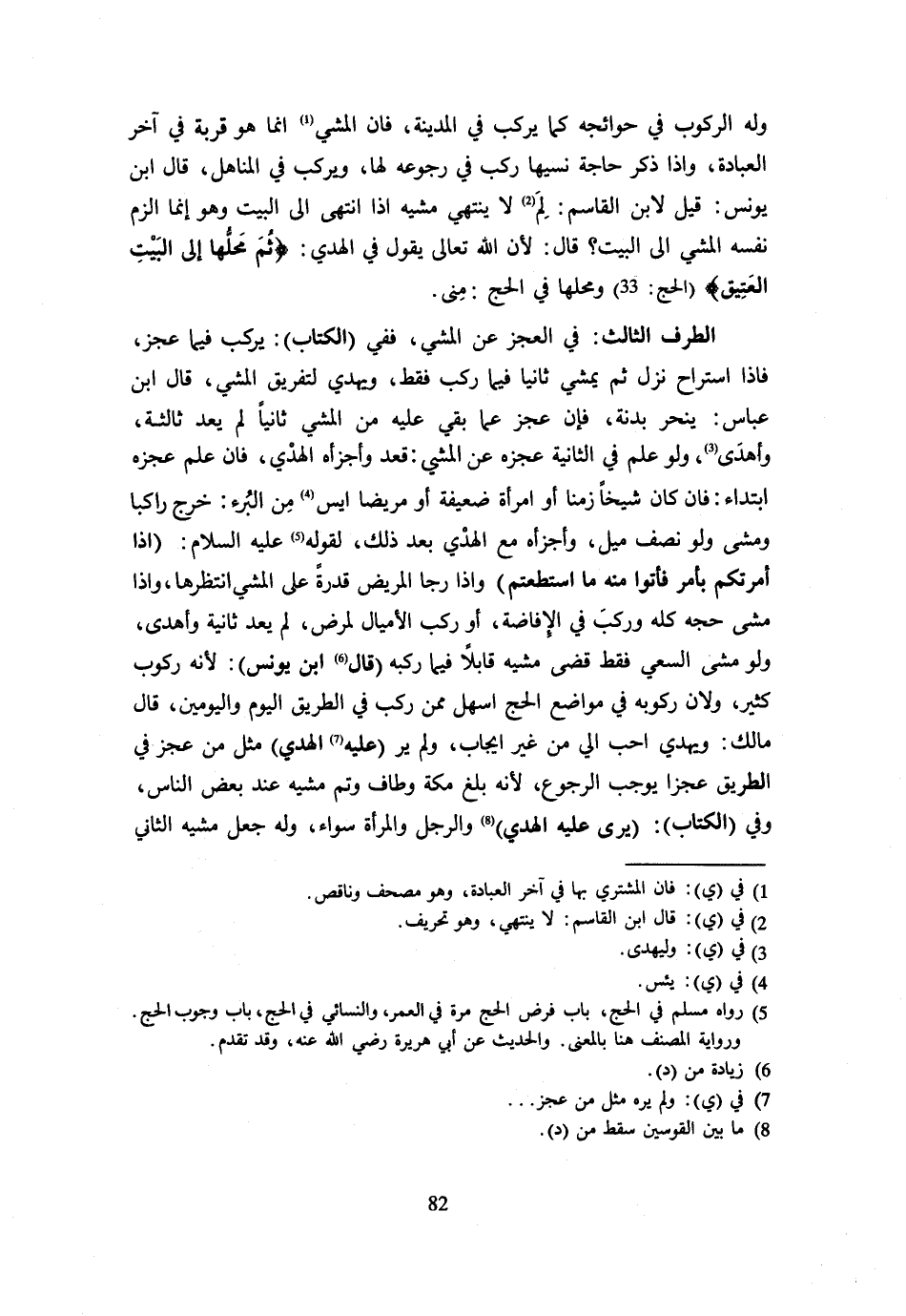 وَلَهُ الرُّكُوبُ فِي حَوَائِجِهِ كَمَا يَرْكَبُ فِي الْمَدِينَةِ فَإِنَّ الْمَشْيَ إِنَّمَا هُوَ قُرْبَةٌ فِي آخِرِ الْعِبَادَةِ وَإِذَا ذَكَرَ حَاجَةً نَسِيَهَا رَكِبَ فِي رُجُوعه لَهَا وَيَرْكَبُ فِي الْمَنَاهِلِ قَالَ ابْنُ يُونُسَ قِيلَ لِابْنِ الْقَاسِمِ لِمَ لَا يَنْتَهِي مَشْيُهُ إِذَا انْتَهَى إِلَى الْبَيْتِ وَهُوَ إِنَّمَا أَلْزَمَ نَفْسَهُ الْمَشْيَ إِلَى الْبَيْتِ قَالَ لِأَنَّ اللَّهَ تَعَالَى يَقُولُ فِي الْهَدْيِ {ثُمَّ مَحِلُّهَا إِلَى الْبَيْتِ الْعَتِيقِ} الْحَج 33 وَمَحِلُّهَا فِي الْحَجِّ مِنًى الطَّرَفُ الثَّالِثُ فِي الْعَجْزِ عَنِ الْمَشْيِ فَفِي الْكِتَابِ يَرْكَبُ فِيمَا عَجَزَ فَإِذَا اسْتَرَاحَ نَزَلَ ثُمَّ يَمْشِي ثَانِيًا فِيمَا رَكِبَ فَقَطْ وَيُهْدِي لِتَفْرِيقِ الْمَشْيِ قَالَ ابْنُ عَبَّاسٍ يَنْحَرُ بَدَنَةً فَإِنْ عَجَزَ عَمَّا بَقِيَ عَلَيْهِ مِنَ الْمَشْيِ ثَانِيًا لم يعد ثَالِثَة وَأهْدى وَلم عَلِمَ فِي الثَّانِيَةِ عَجْزَهُ عَنِ الْمَشْيِ قَعَدَ وَأَجْزَأَهُ الْهَدْيُ فَإِنْ عَلِمَ عَجْزَهُ ابْتِدَاءً فَإِنْ كَانَ شَيخا وَمنا أَوِ امْرَأَةً ضَعِيفَةً أَوْ مَرِيضًا أَيِسَ مِنَ الْبُرْءِ خَرَجَ رَاكِبًا وَمَشَى وَلَوْ نِصْفَ مِيلٍ وأجزأه مَعَ الْهَدْيِ بَعْدَ ذَلِكَ لِقَوْلِهِ عَلَيْهِ السَّلَامُ إِذَا أَمَرْتُكُمْ بِأَمْرٍ فَأْتُوا مِنْهُ مَا اسْتَطَعْتُمْ وَإِذَا رَجَا الْمَرِيضُ قُدْرَةً عَلَى الْمَشْيِ انْتَظَرَهَا وَإِذَا مَشَى حَجَّهُ كُلَّهُ وَرَكِبَ فِي الْإِفَاضَةِ أَوْ رَكِبَ الْأَمْيَالَ لِمَرَضٍ لَمْ يُعِدْ ثَانِيَةً وَأَهْدَى وَلَوْ مَشَى السَّعْيَ فَقَطْ قَضَى مَشْيَهُ قَابِلًا فِيمَا رَكِبَهُ قَالَ ابْنُ يُونُسَ لِأَنَّهُ رُكُوبٌ كَثِيرٌ وَلِأَنَّ رُكُوبَهُ فِي مَوَاضِعِ الْحَجِّ أَسْهَلُ مِمَّنْ رَكِبَ فِي الطَّرِيقِ الْيَوْمَ وَالْيَوْمَيْنِ قَالَ مَالك وَيهْدِي أحب لي مِنْ غَيْرِ إِيجَابٍ وَلَمْ يَرَ عَلَيْهِ الْهَدْيَ مِثْلَ مَنْ عَجَزَ فِي الطَّرِيقِ عَجْزًا يُوجِبُ الرُّجُوعَ لِأَنَّهُ بَلَغَ مَكَّةَ وَطَافَ وَتَمَّ مَشْيُهُ عِنْدَ بَعْضِ النَّاسِ وَفِي الْكِتَابِ يَرَى عَلَيْهِ الْهَدْيَ وَالرَّجُلُ وَالْمَرْأَةُ سَوَاءٌ وَلَهُ جَعْلُ مَشْيِهِ الثَّانِي