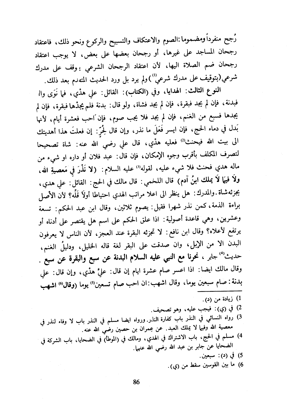 رُجِّحَ مُنْفَرِدًا وَمَضْمُومًا الصَّوْمُ وَالِاعْتِكَافُ وَالتَّسْبِيحُ وَالرُّكُوعُ وَنَحْوُ ذَلِكَ فَاعْتِقَادُ رُجْحَانِ الْمَسَاجِدِ عَلَى غَيْرِهَا أَوْ رُجْحَانُ بَعْضِهَا عَلَى بَعْضٍ لَا يُوجِبُ اعْتِقَادَ رُجْحَانِ ضَمِّ الصَّلَاةِ إِلَيْهَا لِأَنَّ اعْتِقَادَ الرجحان الشَّرْعِيّ يُوقف على مدرك شَرْعِي بتوقيف عَلَى مَدْرَكٍ شَرْعِيٍّ وَلَمْ يَرِدْ بَلْ وَرَدَ الْحَدِيثُ الْمُتَقَدِّمُ بَعْدَ ذَلِكَ النَّوْعُ الثَّالِثُ الْهَدَايَا وَفِي الْكِتَابِ الْقَائِلُ عَلَيَّ هَدْيٌ فَمَا نَوَى وَإِلَّا فَبَدَنَةٌ فَإِنْ لَمْ يَجِدْ فَبَقَرَةٌ فَإِنْ لَمْ يَجِدْ فَشَاةٌ وَلَوْ قَالَ بَدَنَةٌ فَلَمْ يَجِدْهَا فَبَقَرَةٌ فَإِنْ لَمْ يَجِدْهَا فَسَبْعٌ مِنَ الْغنم فَإِن لم يجد فَلَا يحب صَوْمٌ فَإِنْ أَحَبَّ فَعَشَرَةُ أَيَّامٍ لِأَنَّهَا بَدَلٌ فِي دِمَاءِ الْحَجِّ فَإِنْ أَيْسَرَ فَعَلَ مَا نَذَرَ وَإِنْ قَالَ لِحُرٍّ إِنْ فَعَلْتَ هَذَا أَهْدَيْتُكَ إِلَى بَيْتِ اللَّهِ فَيَحْنَثُ فَعَلَيْهِ هَدْيٌ قَالَ عَلِيٌّ رَضِيَ اللَّهُ عَنْهُ شَاةٌ تَصْحِيحًا لِتَصَرُّفِ الْمُكَلَّفِ بِأَقْرَبِ وُجُوهِ الْإِمْكَانِ فَإِنْ قَالَ عَبْدُ فُلَانٍ أَوْ دَارُهُ أَوْ شَيْءٌ مِنْ مَالِهِ هَدْيٌ فَحَنِثَ فَلَا شَيْءَ عَلَيْهِ لِقَوْلِهِ عَلَيْهِ السَّلَامُ لَا نَذْرَ فِي مَعْصِيَةِ اللَّهِ وَلَا فِيمَا لَا يَمْلِكُ ابْنُ آدَمَ قَالَ اللَّخْمِيُّ قَالَ مَالِكٌ فِي الْحَجِّ الْقَائِلُ عَلَيَّ هَدْيٌ يُجْزِئُهُ شَاةٌ وَالْمَدْرَكُ هَلْ يُنْظَرُ إِلَى أعلا مَرَاتِبِ الْهَدْيِ احْتِيَاطًا أَوْ لِأَقَلِّهِ لِأَنَّ الْأَصْلَ بَرَاءَةُ الذِّمَّةِ كَمَنْ نَذَرَ شَهْرًا فَقِيلَ يَصُومُ ثَلَاثِينَ وَقَالَ ابْنُ عَبْدِ الْحَكَمِ تِسْعَةً وَعِشْرِينَ وَهِيَ قَاعِدَةٌ أُصُولِيَّةٌ إِذَا عَلَّقَ الْحُكْمَ عَلَى اسْم هَل يقْتَصر على أدناه أَو يَرْتَفِعُ لِأَعْلَاهُ وَقَالَ ابْنُ نَافِعٍ لَا تُجْزِئُهُ الْبَقَرَةُ عِنْدَ الْعَجْزِ لِأَنَّ النَّاسَ لَا يَعْرِفُونَ الْبُدْنَ إِلَّا مِنَ الْإِبِلِ وَإِنْ صَدَقَتْ عَلَى الْبَقَرِ لُغَةً قَالَهُ الْخَلِيلُ وَدَلِيلُ الْغَنَمِ حَدِيثُ جَابِرٍ نَحَرْنَا مَعَ النَّبِيِّ عَلَيْهِ السَّلَامُ الْبَدَنَةَ عَنْ سَبْعٍ وَالْبَقَرَةَ عَنْ سَبْعٍ وَقَالَ مَالِكٌ أَيْضًا إِذَا أَعْسَرَ صَامَ عَشَرَةَ أَيَّامٍ إِنْ قَالَ عَليّ هدي وَإِن قَالَ عَليّ بَدَنَة صَاح سبعين يَوْمًا وَقَالَ أَشْهَبُ إِنْ أَحَبَّ صَامَ تسعين يَوْمًا وَقَالَ أَشْهَبُ