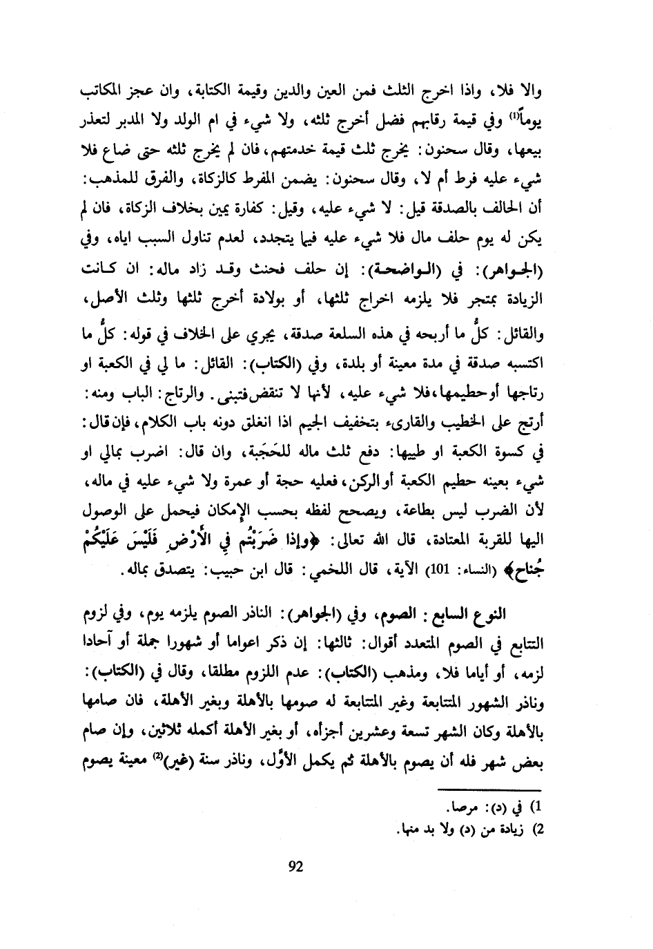 وَإِلَّا فَلَا وَإِذَا أَخْرَجَ الثُّلُثُ فَمِنَ الْعَيْنِ وَالدّين وَقِيمَة الْكِتَابَةِ وَإِنْ عَجَزَ الْمُكَاتِبُ يَوْمًا وَفِي قِيمَةِ رِقَابِهِمْ فَضْلٌ أَخْرَجَ ثُلُثَهُ وَلَا شَيْءَ فِي أُمِّ الْوَلَدِ وَلَا الْمُدَبَّرِ لِتَعَذُّرِ بَيْعِهَا وَقَالَ سَحْنُونٌ يُخْرِجُ ثُلُثَ قِيمَةِ خِدْمَتِهِمْ فَإِنْ لَمْ يُخْرِجْ ثُلُثَهُ حَتَّى ضَاعَ فَلَا شَيْءَ عَلَيْهِ فَرَّطَ أَمْ لَا وَقَالَ سَحْنُونٌ يَضْمَنُ الْمُفَرِّطُ كَالزَّكَاةِ وَالْفرق للْمَذْهَب أَنَّ الْحَالِفَ بِالصَّدَقَةِ قِيلَ لَا شَيْءَ عَلَيْهِ وَقِيلَ كَفَّارَةُ يَمِينٍ بِخِلَافِ الزَّكَاةِ فَإِنْ لَمْ يَكُنْ لَهُ يَوْمَ حَلِفَ مَالٌ فَلَا شَيْءَ عَلَيْهِ فِيمَا يَتَجَدَّدُ لِعَدَمِ تَنَاوُلِ السَّبَبِ إِيَّاهُ وَفِي الْجَوَاهِرِ فِي الْوَاضِحَةِ إِنْ حَلَفَ فَحَنِثَ وَقَدْ زَادَ مَالُهُ إِنْ كَانَتِ الزِّيَادَةُ بِمَتْجَرٍ فَلَا يَلْزَمُهُ إِخْرَاجُ ثُلُثِهَا أَوْ بِوِلَادَةٍ أَخْرَجَ ثُلُثَهَا وَثُلُثَ الْأَصْلِ وَالْقَائِلُ كُلُّ مَا أَرْبَحُهُ فِي هَذِهِ السِّلْعَةِ صَدَقَةٌ يَجْرِي عَلَى الْخِلَافِ فِي قَوْلِهِ كُلُّ مَا أَكْتَسِبُهُ صَدَقَةٌ فِي مُدَّةٍ مُعَيَّنَةٍ أَوْ بَلْدَةٍ وَفِي الْكِتَابِ الْقَائِلُ مَا لي فِي الْكَعْبَةِ أَوْ رِتَاجِهَا أَوْ حَطِيمِهَا فَلَا شَيْءَ عَلَيْهِ لِأَنَّهَا لَا تُنْقَضُ فَتُبْنَى وَالرِّتَاجُ الْبَاب وَمِنْه أرتج على الْخَطِيب والقارئ بتَخْفِيف الْجِيم إِذَا انْغَلَقَ دُونَهُ بَابُ الْكَلَامِ فَإِنْ قَالَ فِي كِسْوَةِ الْكَعْبَةِ أَوْ طِيبِهَا دَفَعَ ثُلُثَ مَاله للحجية وَإِنْ قَالَ أَضْرِبُ بِمَالِي أَوْ شَيْءٍ بِعَيْنِهِ حَطِيمَ الْكَعْبَةِ أَوِ الرُّكْنَ فَعَلَيْهِ حِجَّةٌ أَوْ عُمْرَةٌ وَلَا شَيْءَ عَلَيْهِ فِي مَالِهِ لِأَنَّ الضَّرْبَ لَيْسَ بِطَاعَةٍ وَيُصَحَّحُ لَفْظُهُ بِحَسْبَ الْإِمْكَانِ فَيُحْمَلُ عَلَى الْوُصُولِ إِلَيْهَا لِلْقُرْبَةِ الْمُعْتَادَةِ قَالَ اللَّهُ تَعَالَى {وَإِذَا ضَرَبْتُمْ فِي الأَرْضِ فَلَيْسَ عَلَيْكُمْ جنَاح} النِّسَاء 101 الْآيَة قَالَ اللَّخْمِيُّ قَالَ ابْنُ حَبِيبٍ يَتَصَدَّقُ بِمَالِهِ النَّوْع السَّابِع الصَّوْم وَفِي الْجَوَاهِرِ النَّاذِرُ الصَّوْمَ يَلْزَمُهُ يَوْمٌ وَفِي لُزُومِ التَّتَابُعِ فِي الصَّوْمِ الْمُتَعَدِّدِ أَقْوَالٌ ثَالِثُهَا إِنْ ذَكَرَ أَعْوَامًا أَوْ شُهُورًا جُمْلَةً أَوْ آحَاد لَزِمَهُ أَوْ أَيَّامًا فَلَا وَمَذْهَبُ الْكِتَابِ عَدَمُ اللُّزُومِ مُطْلَقًا وَقَالَ فِي الْكِتَابِ وَنَاذِرُ الشُّهُورِ الْمُتَتَابِعَةِ وَغَيْرِ الْمُتَتَابِعَةِ لَهُ صَوْمُهَا بِالْأَهِلَّةِ وَبِغَيْرِ الْأَهِلَّةِ فَإِنْ صَامَهَا بِالْأَهِلَّةِ وَكَانَ الشَّهْرُ تِسْعَةً وَعشْرين أَجزَأَهُ أَو بِغَيْر الْأَهِلَّةِ أَكْمَلَهُ ثَلَاثِينَ وَإِنْ صَامَ بَعْضَ شَهْرٍ فَلَهُ أَنْ يَصُومَ بِالْأَهِلَّةِ ثُمَّ يُكْمِلُ الْأَوَّلَ وَنَاذِرُ سَنَةٍ غَيْرِ مُعَيَّنَةٍ يَصُومُ