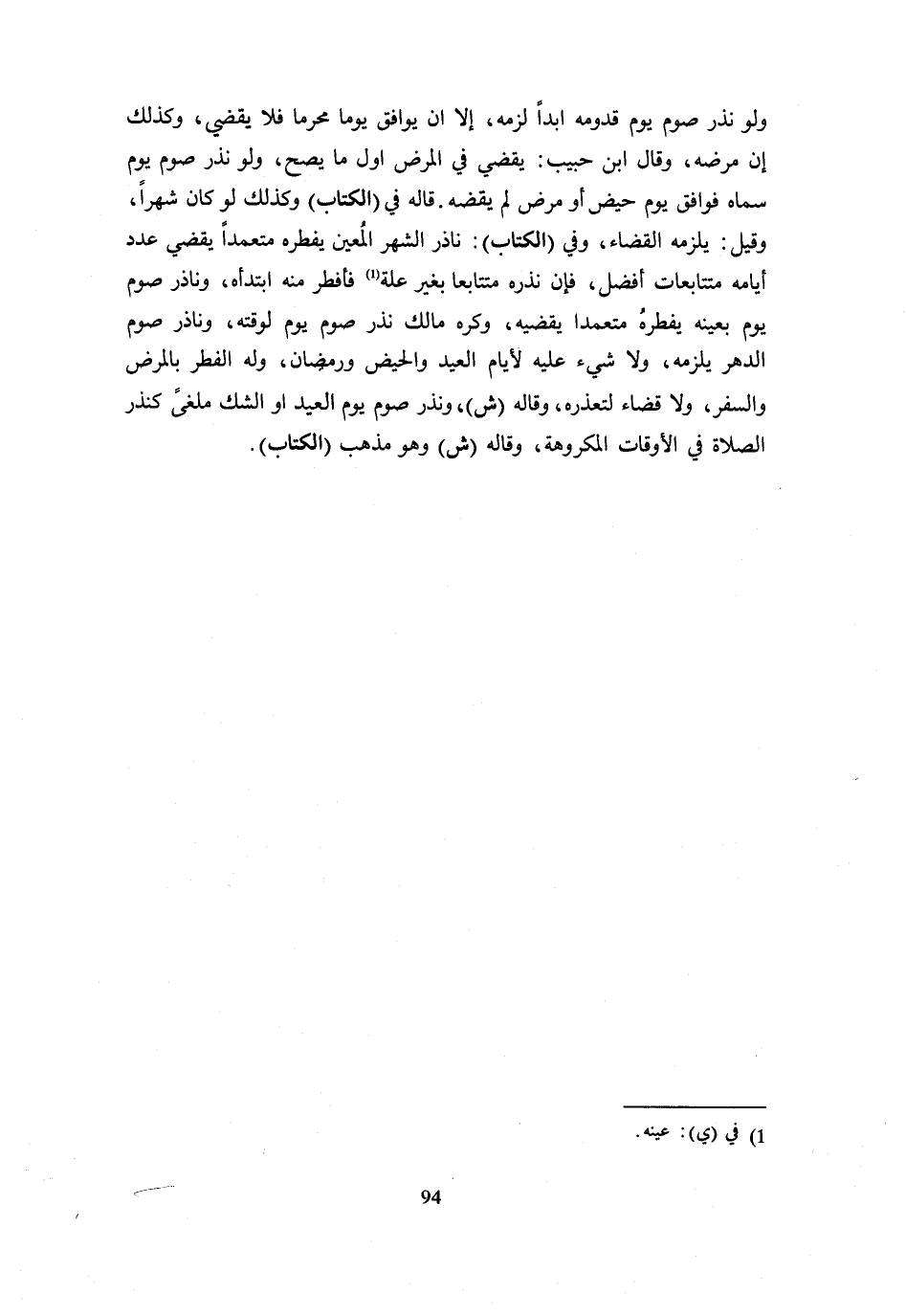وَلَوْ نَذَرَ صَوْمَ يَوْمِ قُدُومِهِ أَبَدًا لَزِمَهُ إِلَّا أَنْ يُوَافِقَ يَوْمًا مُحَرَّمًا فَلَا يَقْضِي وَكَذَلِكَ إِن مَرضه وَقَالَ ابْنُ حَبِيبٍ يَقْضِي فِي الْمَرَضِ أَوَّلَ مَا يَصِحُّ وَلَوْ نَذَرَ صَوْمَ يَوْمٍ سَمَّاهُ فَوَافَقَ يَوْم حيض أَو مرض لَمْ يَقْضِهِ قَالَهُ فِي الْكِتَابِ وَكَذَلِكَ لَوْ كَانَ شَهْرًا وَقِيلَ يَلْزَمُهُ الْقَضَاءُ وَفِي الْكِتَابِ نَاذِرُ الشَّهْرِ الْمُعَيَّنِ يُفْطِرُهُ مُتَعَمِّدًا يَقْضِي عَدَدَ أَيَّامِهِ مُتَتَابِعَاتٍ أَفْضَلُ فَإِنْ نَذَرَهُ مُتَتَابِعًا بِغَيْرِ عِلَّةٍ فَأَفْطَرَ مِنْهُ ابْتَدَأَهُ وَنَاذِرُ صَوْمِ يَوْمٍ بِعَيْنِه يقطره مُتَعَمِّدًا يَقْضِيهِ وَكَرِهَ مَالِكٌ نَذْرَ صَوْمِ يَوْمٍ لِوَقْتِهِ وَنَاذِرُ صَوْمِ الدَّهْرِ يَلْزَمُهُ وَلَا شَيْءَ عَلَيْهِ لأيام الْعِيدِ وَالْحَيْضِ وَرَمَضَانَ وَلَهُ الْفِطْرُ بِالْمَرَضِ وَالسِّفْرِ وَلَا قَضَاءَ لِتَعَذُّرِهِ وَقَالَهُ ش وَنَذْرُ صَوْمِ يَوْمِ الْعِيدِ أَوِ الشَّكِّ مُلْغًى كَنَذْرِ الصَّلَاةِ فِي الْأَوْقَاتِ الْمَكْرُوهَةِ وَقَالَهُ ش وَهُوَ مَذْهَبُ الْكتاب