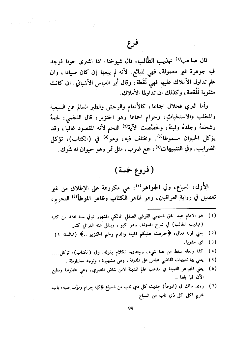 قَالَ صَاحِبُ تَهْذِيبِ الطَّالِبِ قَالَ شُيُوخُنَا إِذَا اشْتَرَى حُوتًا فَوَجَدَ فِيهِ جَوْهَرَةً غَيْرَ مَعْمُولَةٍ فَهِيَ لِلْبَائِعِ لِأَنَّهُ لَمْ يَبِعْهَا إِنْ كَانَ صَيَّادًا وَإِنْ عَلِمَ تَدَاوُلَ الْأَمْلَاكِ عَلَيْهَا فَهِيَ لُقَطَةٌ وَقَالَ أَبُو الْعَبَّاسِ الْأَشْبَانِيُّ إِنْ كَانَتْ مَثْقُوبَةً فَلُقَطَةٌ وَكَذَلِكَ إِنْ تَدَاوَلَهَا الْأَمْلَاكُ وَأَمَّا الْبَرِّيُّ فَحَلَالٌ إِجْمَاعًا كَالْأَنْعَامِ وَالْوَحْشِ وَالطَّيْرِ السَّالِمِ عَنِ السَّبُعِيَّةِ وَالْمِخْلَبِ وَالِاسْتِخْبَاثِ وَحَرَامٌ إِجْمَاعًا وَهُوَ الْخِنْزِير قَالَ اللَّخْمِيّ لَحْمه وسحمه وَجِلْدُهُ وَلَبَنُهُ وَخَصَّصَتِ الْآيَةُ اللَّحْمَ لِأَنَّهُ الْمَقْصُودُ غَالِبًا وَقَدْ يُؤْكَلُ الْحَيَوَانُ مَسْمُوطًا وَمُخْتَلَفٌ فِيهِ وَهُوَ فِي الْكتاب تُؤْكَل الضرايب وَفِي التَّنْبِيهَات جَمِيع ضرب مثل ثَمَر وَهُوَ حَيَوَان لَهُ شوك