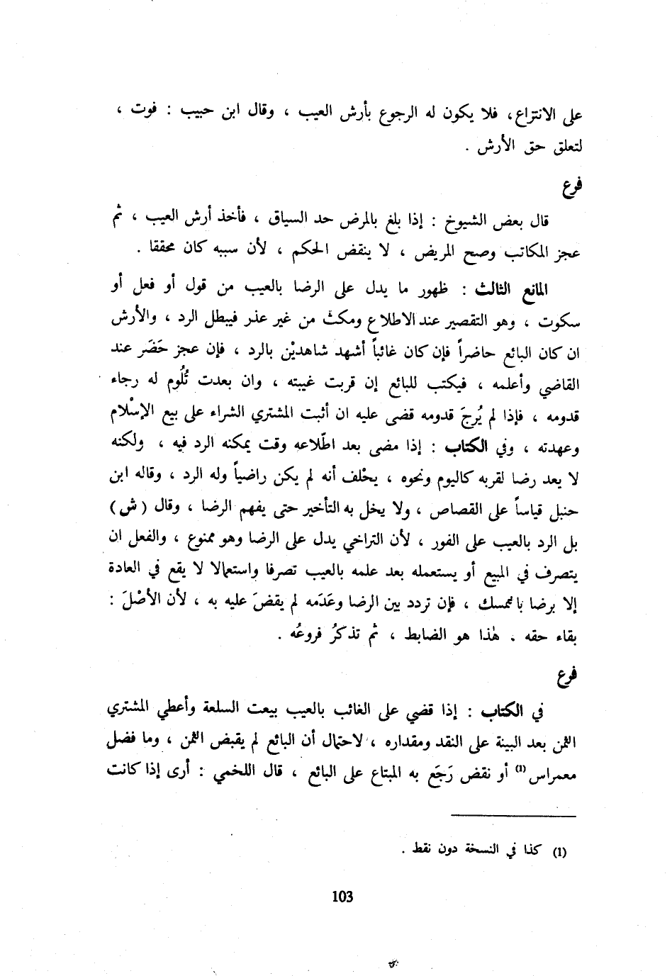 فَرْعٌ قَالَ بَعْضُ الشُّيُوخِ: إِذَا بَلَغَ بِالْمَرَضِ حَدَّ السِّيَاقِ فَأَخَذَ أَرْشَ الْعَيْبِ ثُمَّ عَجَزَ الْمُكَاتَبُ وَصَحَّ الْمَرِيضُ لَا يُنْقَضُ الْحُكْمُ لَان سيبه كَانَ مُحَقَّقًا الْمَانِعُ الثَّالِثُ: ظُهُورُ مَا يَدُلُّ عَلَى الرِّضَا بِالْعَيْبِ مِنْ قَوْلٍ أَوْ فِعْلٍ سُكُوتٍ وَهُوَ التَّقْصِيرُ عِنْدَ الِاطِّلَاعِ وَمُكْثٌ مِنْ غَيْرِ عُذْرٍ فَيَبْطُلُ الرَّدُّ وَالْأَرْشُ إِنْ كَانَ الْبَائِعُ حَاضِرًا فَإِنْ كَانَ غَائِبًا أَشْهَدَ شَاهِدَيْنِ بِالرَّدِّ فَإِنْ عَجَزَ حَضَرَ عِنْدَ الْقَاضِي وَأَعْلَمَهُ فَيَكْتُبُ لِلْبَائِعِ إِنْ قَرُبَتْ غَيْبَتُهُ وَإِنْ بَعُدَتْ تُلُوِّمَ لَهُ رَجَاءَ قُدُومِهِ فَإِذَا لَمْ يُرْجَ قُدُومُهُ قَضَى عَلَيْهِ إِنْ أَثْبَتَ الْمُشْتَرِي الشِّرَاءَ عَلَى بَيْعِ الْإِسْلَامِ وَعُهْدَتِهِ وَفِي الْكِتَابِ إِذَا مَضَى بَعْدَ اطِّلَاعِهِ وَقْتٌ يُمْكِنُهُ الرَّدُّ فِيهِ وَلَكِنَّهُ لَا يُعَدُّ رِضًا لِقُرْبِهِ كَالْيَوْمِ وَنَحْوِهِ يَحْلِفُ أَنَّهُ لَمْ يَكُنْ رَاضِيًا وَلَهُ الرَّدُّ وَقَالَهُ ابْنُ حَنْبَلٍ قِيَاسًا عَلَى الْقِصَاصِ وَلَا يُخِلُّ بِهِ التَّأْخِيرُ حَتَّى يُفْهَمَ الرِّضَا وَقَالَ (ش) بَلِ الرَّدُّ بِالْعَيْبِ عَلَى الْفَوْرِ لِأَنَّ التَّرَاخِيَ يَدُلُّ عَلَى الرِّضَا وَهُوَ مَمْنُوعٌ وَالْفِعْلُ أَنْ يَتَصَرَّفَ فِي الْمَبِيعِ أَوْ يَسْتَعْمِلَهُ بَعْدَ عِلْمِهِ بِالْعَيْبِ تَصَرُّفًا وَاسْتِعْمَالًا لَا يَقَعُ فِي الْعَادَةِ إِلَّا بِرِضًا بِالتَّمَسُّكِ فَإِنْ تَرَدَّدَ بَيْنَ الرِّضَا وَعَدَمِهِ لَمْ يَقْضِ عَلَيْهِ بِهِ لِأَنَّ الْأَصْلَ بَقَاءُ حَقِّهِ هَذَا هُوَ الضَّابِطُ ثُمَّ تُذْكَرُ فُرُوعُهُ