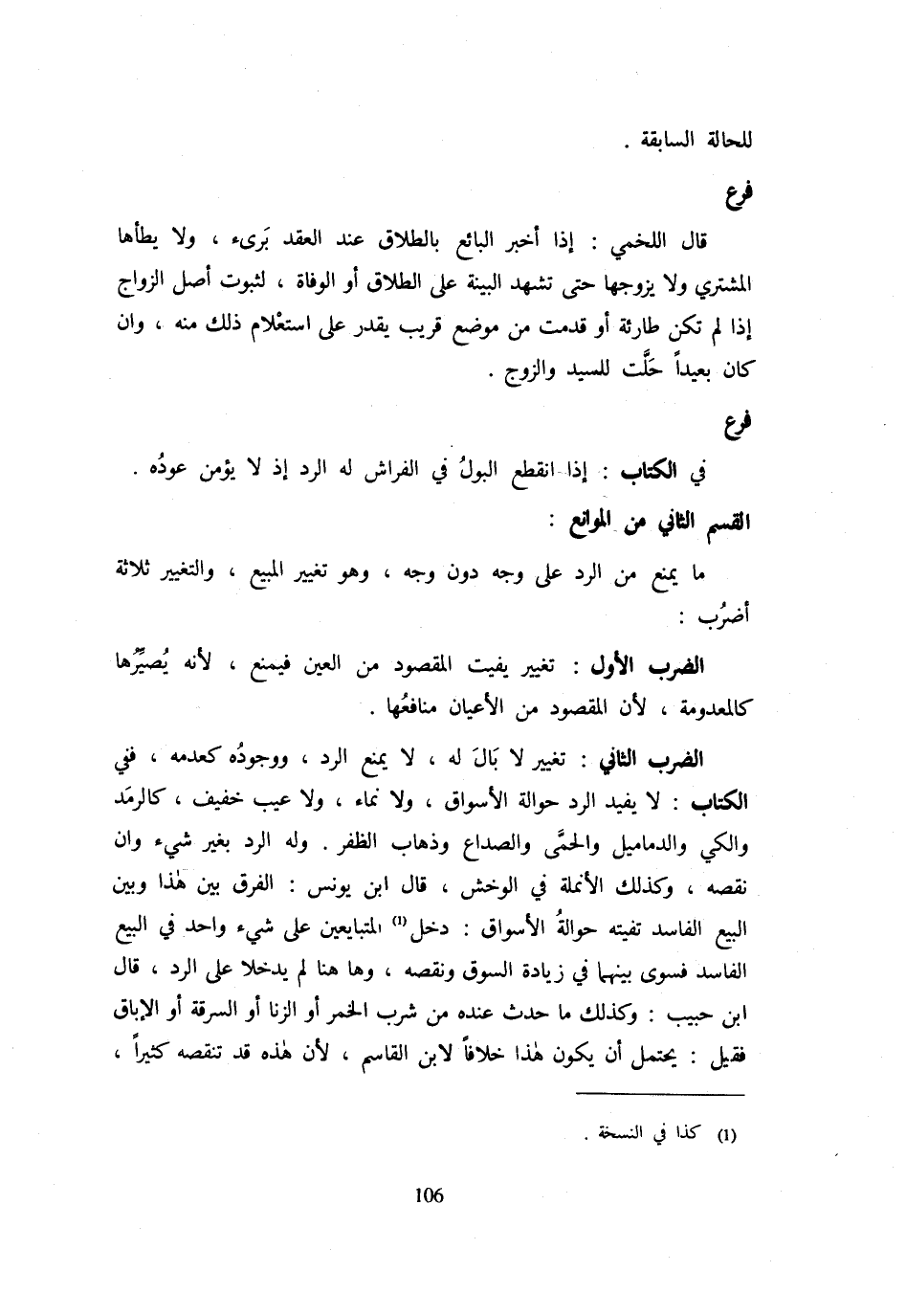 فَرْعٌ فِي الْكتاب: إِذا انْقَطع الول فِي الْفراش لَهُ الرَّد إِذْ لَا يُؤمن عوده الْقِسْمُ الثَّانِي مِنَ الْمَوَانِعِ مَا يَمْنَعُ مِنَ الرَّدِّ عَلَى وَجْهٍ دُونَ وَجْهٍ وَهُوَ تَغْيِيرُ الْمَبِيعِ وَالتَّغْيِيرُ ثَلَاثَةُ أَضْرُبٍ الضَّرْبُ الْأَوَّلُ تَغْيِيرٌ يُفِيتُ الْمَقْصُودَ مِنَ الْعَيْنِ فَيَمْنَعُ لِأَنَّهُ يُصَيِّرُهَا كَالْمَعْدُومَةِ لِأَنَّ الْمَقْصُودَ مِنَ الْأَعْيَانِ مَنَافِعُهَا الضَّرْبُ الثَّانِي: تَغْيِيرٌ لَا بَالَ لَهُ لَا يَمْنَعُ الرَّدَّ وَوُجُودُهُ كَعَدَمِهِ فَفِي الْكِتَابِ لَا يُفِيدُ الرَّدَّ حَوَالَةُ الْأَسْوَاقِ وَلَا نَمَاءٌ وَلَا عَيْبٌ خَفِيفٌ كَالرَّمَدِ وَالْكَيِّ وَالدَّمَامِيلِ وَالْحُمَّى وَالصُّدَاعِ وَذَهَابِ الظُّفْرِ وَلَهُ الرَّدُّ بِغَيْرِ شَيْءٍ وَإِنْ نَقَصَهُ وَكَذَلِكَ الْأُنْمُلَة فِي الْوَحْش قَالَ ابْنُ يُونُسَ: الْفَرْقُ بَيْنَ هَذَا وَبَيْنَ البيع الْفَاسِد تفيته حِوَالَة الْأَسْوَاق: دخل الْمُتَبَايِعَيْنِ عَلَى شَيْءٍ وَاحِدٍ فِي الْبَيْعِ الْفَاسِدِ فَسَوَّى بَيْنَهُمَا فِي زِيَادَةِ السُّوقِ وَنَقْصِهِ وَهَاهُنَا لَمْ يَدْخُلَا عَلَى الرَّدِّ قَالَ ابْنُ حَبِيبٍ وَكَذَلِكَ مَا حَدَثَ عِنْدَهُ مِنْ شُرْبِ الْخَمْرِ أَوِ الزِّنَا أَوِ السَّرِقَةِ أَوِ الْإِبَاقِ فَقِيلَ يُحْتَمَلُ أَنْ يَكُونَ هَذَا خِلَافًا لِابْنِ الْقَاسِمِ لِأَنَّ هَذِهِ قَدْ تَنْقُصُهُ كَثِيرًا