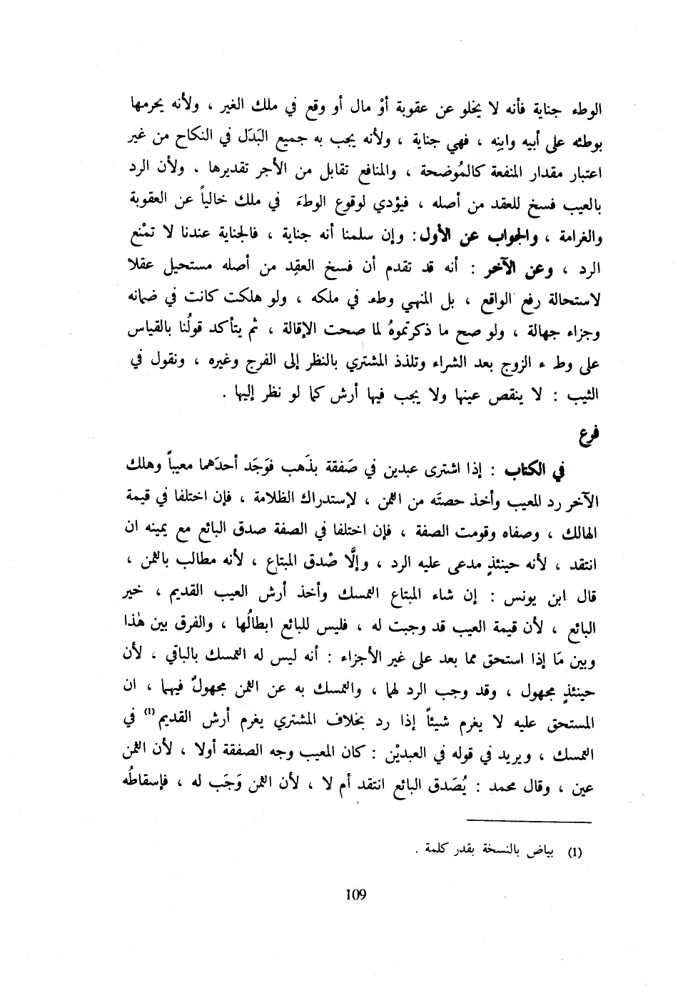 الْوَطْء جِنَايَة فَإِنَّهُ لَا يَخْلُو من عُقُوبَة أَو مَال أَو وَقْعٍ فِي مِلْكِ الْغَيْرِ وَلِأَنَّهُ يُحَرِّمُهَا بِوَطْئِهِ عَلَى أَبِيهِ وَابْنِهِ فَهِيَ جِنَايَةٌ وَلِأَنَّهُ يَجِبُ بِهِ جَمِيعُ الْبَدَلِ فِي النِّكَاحِ مِنْ غَيْرِ اعْتِبَارِ مِقْدَارِ الْمَنْفَعَةِ كَالْمُوضِحَةِ وَالْمَنَافِعُ تُقَابِلُ مِنَ الْأَجْرِ تَقْدِيرَهَا وَلِأَنَّ الرَّدَّ بِالْعَيْبِ فَسْخٌ لِلْعَقْدِ مِنْ أَصْلِهِ فَيُؤَدِّي لِوُقُوعِ الْوَطْءِ فِي مِلْكٍ خَالِيًا عَنِ الْعُقُوبَةِ وَالْغَرَامَةِ وَالْجَوَابُ عَنِ الْأَوَّلِ: وَإِنْ سَلَّمْنَا أَنَّهُ جِنَايَةٌ فَالْجِنَايَةُ عِنْدَنَا لَا تَمْنَعُ الرَّدَّ وَعَنِ الْآخَرِ: أَنَّهُ قَدْ تَقَدَّمَ أَنَّ فَسْخَ الْعَقْدِ مِنْ أَصْلِهِ مُسْتَحِيلٌ عَقْلًا لِاسْتِحَالَةِ رَفْعِ الْوَاقِعِ بَلِ الْمَنْهِيُّ وَطْءٌ فِي مِلْكِهِ وَلَوْ هَلَكَتْ كَانَتْ فِي ضَمَانِهِ وَجَزَاءُ جَهَالَةٍ وَلَوْ صَحَّ مَا ذَكَرْتُمُوهُ لَمَا صَحَّتِ الْإِقَالَةُ ثُمَّ يَتَأَكَّدُ قَوْلُنَا بِالْقِيَاسِ عَلَى وَطْءِ الزَّوْجِ بَعْدَ الشِّرَاءِ وَتَلَذُّذِ الْمُشْتَرِي بِالنَّظَرِ إِلَى الْفَرْجِ وَغَيْرِهِ وَنَقُولُ فِي الثَّيِّبِ: لَا يَنْقُصُ عَيْنُهَا وَلَا يَجِبُ فِيهَا أَرْشٌ كَمَا لَوْ نَظَرَ إِلَيْهَا