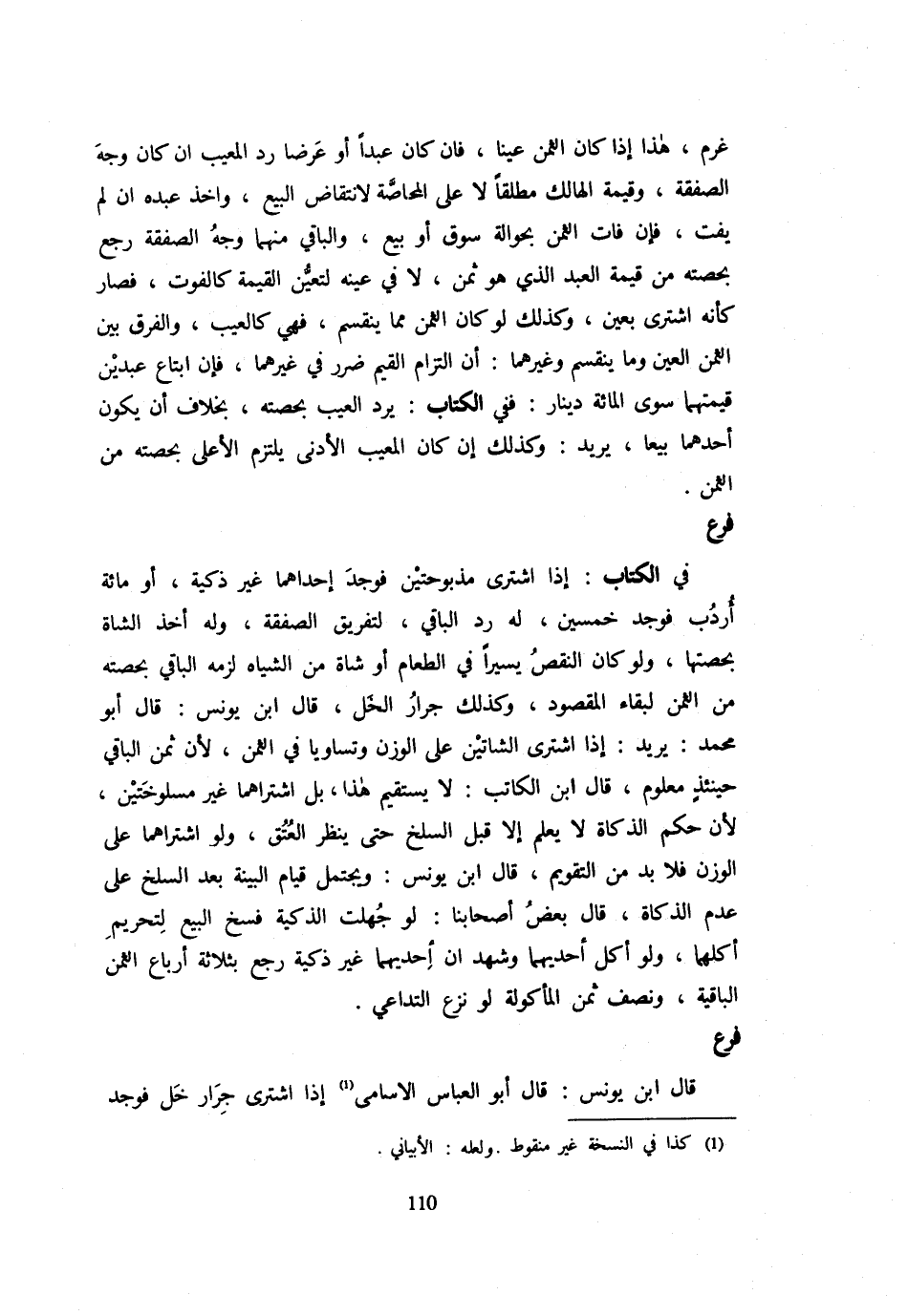 فَرْعٌ فِي الْكِتَابِ: إِذَا اشْتَرَى مَذْبُوحَتَيْنِ فَوَجَدَ إِحْدَاهُمَا غَيْرَ ذَكِيَّةٍ أَوْ مِائَةَ أُردب فَوَجَدَ خَمْسِينَ لَهُ رَدُّ الْبَاقِي لِتَفْرِيقِ الصَّفْقَةِ وَلَهُ أَخْذُ الشَّاةِ بِحِصَّتِهَا وَلَوْ كَانَ النَّقْصُ يَسِيرًا فِي الطَّعَامِ أَوْ شَاةٍ مِنَ الشِّيَاهِ لَزِمَهُ الْبَاقِي بِحِصَّتِهِ مِنَ الثَّمَنِ لِبَقَاءِ الْمَقْصُودِ وَكَذَلِكَ جِرَارُ الْخَلِّ قَالَ ابْنُ يُونُسَ: قَالَ أَبُو مُحَمَّدٍ: يُرِيد: إِذا اشْترى الشاتين على الْوَزْن وتساويا فِي الثَّمَنِ لِأَنَّ ثَمَنَ الْبَاقِي حِينَئِذٍ مَعْلُومٌ قَالَ ابْنُ الْكَاتِبِ: لَا يَسْتَقِيمُ هَذَا بَلِ اشْتَرَاهُمَا غَيْرَ مَسْلُوخَتَيْنِ لِأَنَّ حُكْمَ الذَّكَاةِ لَا يُعْلَمُ إِلَّا قَبْلَ السَّلْخِ حَتَّى يَنْظُرَ الْعُتُقَ وَلَوِ اشْتَرَاهُمَا عَلَى الْوَزْنِ فَلَا بُدَّ مِنَ التَّقْوِيمِ قَالَ ابْنُ يُونُسَ: وَيُحْتَمَلُ قِيَامُ الْبَيِّنَةِ بَعْدَ السَّلْخِ عَلَى عَدَمِ الذَّكَاةِ قَالَ بَعْضُ أَصْحَابِنَا: لَوْ جُهِلَتِ الذَّكِيَّةُ فُسِخَ الْبَيْعُ لِتَحْرِيمِ أكلهما وَلَو أكل أحديهما وَشَهِدَ أَنَّ إِحْدَيْهِمَا غَيْرَ ذَكِيَّةٍ رَجَعَ بِثَلَاثَةِ أَربَاع الثّمن الْبَاقِيَةِ وَنِصْفُ ثَمَنِ الْمَأْكُولَةِ لَوْ نَزَعَ التَّدَاعِيَ