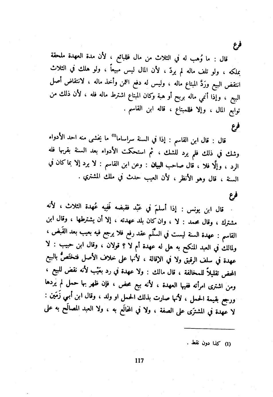 فَرْعٌ قَالَ ابْنُ يُونُسَ: إِذَا أَسْلَمَ فِي عَبْدٍ فَقَبَضَهُ فَفِيهِ عُهدة الثَّلَاثِ لِأَنَّهُ مُشْتَرَكٌ وَقَالَ مُحَمَّدٌ: لَا وَإِنْ كَانَ بَلَدُ عُهْدَتِهِ إِلَّا أَنْ يَشْتَرِطَهَا وَقَالَ ابْنُ الْقَاسِمِ: عُهْدَةُ السَّنَةِ لَيْسَتْ فِي السَّلَمِ عَقْدٌ رُفِعَ فَلَا يَرْجِعُ فِيهِ بِعَيْبٍ بَعْدَ الْقَبْضِ وَلِمَالِكٍ فِي الْعَبْدِ الْمُنْكَحِ بِهِ هَلْ لَهُ عُهْدَةٌ أَمْ لَا؟ قَوْلَانِ وَقَالَ ابْنُ حَبِيبٍ: لَا عُهْدَةَ فِي سَلَفِ الرَّقِيقِ وَلَا فِي الْإِقَالَةِ لِأَنَّهَا عَلَى خلاف الأَصْل فتختص بِالْبيعِ الْمَحْض تقليلاً لِلْمُخَالَفَةِ قَالَ مَالِكٌ: وَلَا عُهْدَةَ فِي رَدٍّ بِعَيْبٍ لِأَنَّهُ نَقْضٌ لِلْبَيْعِ وَمَنِ اشْتَرَى امْرَأَتَهُ فَفِيهَا الْعُهْدَةُ لِأَنَّهُ بَيْعٌ مَحْضٌ فَإِنْ ظَهَرَ بِهَا حَمْلٌ لَمْ يَرُدَّهَا وَرَجَعَ بِقِيمَةِ الْحَمْلِ لِأَنَّهَا صَارَت بذلك الْحمل أَو وَلَدٍ وَقَالَ ابْنُ أَبِي زَمَيْنٍ: لَا عُهْدَةَ فِي الْمُشْتَرَى عَلَى الصِّفَةِ وَلَا فِي الْمُخَالَعِ بِهِ وَلَا الْعَبْدِ الْمَصَالَحِ بِهِ عَلَى