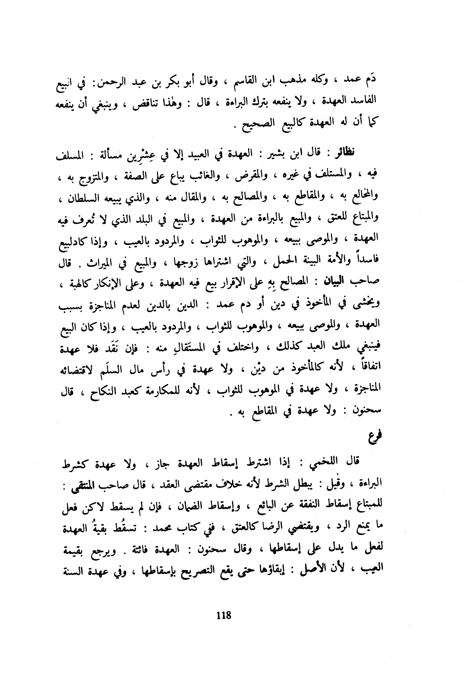 دَمٍ عَمْدٍ وَكُلُّهُ مَذْهَبُ ابْنِ الْقَاسِمِ وَقَالَ أَبُو بَكْرِ بْنُ عَبْدِ الرَّحْمَنِ: فِي الْبَيْعِ الْفَاسِدِ الْعُهْدَةُ وَلَا يَنْفَعُهُ بِتَرْكِ الْبَرَاءَةِ قَالَ: وَهَذَا تَنَاقُضٌ وَيَنْبَغِي أَنْ يَنْفَعَهُ كَمَا أَنَّ لَهُ الْعُهْدَةَ كَالْبَيْعِ الصَّحِيحِ نَظَائِرُ: قَالَ ابْنُ بَشِيرٍ: الْعُهْدَةُ فِي الْعَبِيدِ إِلَّا فِي عِشْرِينَ مَسْأَلَةً: الْمُسْلَفُ فِيهِ وَالْمُسْتَلَفُ فِي غَيْرِهِ وَالْمُقْرَضُ وَالْغَائِبُ يُبَاعُ عَلَى الصِّفَةِ وَالْمُتَزَوَّجُ بِهِ وَالْمُخَالَعُ بِهِ وَالْمُقَاطَعُ بِهِ وَالْمُصَالَحُ بِهِ وَالْمُقَالُ مِنْهُ وَالَّذِي يَبِيعهُ السُّلْطَان والمبتاع لِلْعِتْقِ وَالْمَبِيع بِالْبَرَاءَةِ مِنَ الْعُهْدَةِ وَالْمَبِيعُ فِي الْبَلَدِ الَّذِي لَا تُعرف فِيهِ الْعُهْدَةُ وَالْمُوصَى بِبَيْعِهِ وَالْمَوْهُوبُ لِلثَّوَابِ والمردود بِالْعَيْبِ وَإِذا كَاد لبيع فَاسِدا وَالْأَمَةُ الْبَيِّنَةُ الْحَمْلَ وَالَّتِي اشْتَرَاهَا زَوْجُهَا وَالْمَبِيعُ فِي الْمِيرَاثِ قَالَ صَاحِبُ الْبَيَانِ: الْمُصَالَحُ بِهِ عَلَى الْإِقْرَارِ بَيْعٌ فِيهِ الْعُهْدَةُ وَعَلَى الْإِنْكَارِ الْهِبَة وَيُخْشَى فِي الْمَأْخُوذِ فِي دَيْنٍ أَوْ دَمٍ عَمْدٍ: الدَّيْنُ بِالدَّيْنِ لِعَدَمِ الْمُنَاجَزَةِ بِسَبَبِ الْعُهْدَةِ وَالْمُوصَى بِبَيْعِهِ وَالْمَوْهُوبُ لِلثَّوَابِ وَالْمَرْدُودُ بِالْعَيْبِ وَإِذَا كَانَ البيع فَيَنْبَغِي مِلْكُ الْعَبْدِ كَذَلِكَ وَاخْتُلِفَ فِي الْمُسْتَقَالِ مِنْهُ: فَإِنْ نَقَدَ فَلَا عُهْدَةَ اتِّفَاقًا لِأَنَّهُ كَالْمَأْخُوذِ مِنْ دَيْنٍ وَلَا عُهْدَةَ فِي رَأْسِ مَالِ السَّلَمِ لِاقْتِضَائِهِ الْمُنَاجَزَةَ وَلَا عُهْدَةَ فِي الْمَوْهُوبِ لِلثَّوَابِ لِأَنَّهُ لِلْمُكَارَمَةِ كَعَبْدِ النِّكَاحِ قَالَ سَحْنُونٌ: وَلَا عُهْدَةَ فِي الْمُقَاطَعِ بِهِ