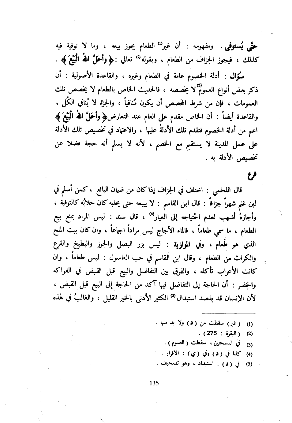 حَتَّى يُسْتَوْفَى وَمَفْهُومُهُ: أَنَّ غَيْرَ الطَّعَامِ يَجُوزُ بَيْعُهُ وَمَا لَا تَوْفِيَةَ فِيهِ كَذَلِكَ فَيَجُوزُ الْجِزَافُ مِنَ الطَّعَامِ وَبِقَوْلِهِ تَعَالَى {وَأَحَلَّ اللَّهُ البيع} سُؤَالٌ: أَدِلَّةُ الْخُصُومِ عَامَّةٌ فِي الطَّعَامِ وَغَيْرِهِ وَالْقَاعِدَةُ الْأُصُولِيَّةُ: أَنَّ ذِكْرَ بَعْضِ أَنْوَاعِ الْعُمُومِ لَا يُخَصِّصُهُ فَالْحَدِيثُ الْخَاصُّ بِالطَّعَامِ لَا يُخَصِّصُ تِلْكَ الْعُمُومَاتِ فَإِنَّ مِنْ شَرْطِ الْمُخَصَّصِ أَنْ يَكُونَ مُنَافِيًا وَالْجُزْءُ لَا يُنافي الْكُلَّ وَالْقَاعِدَةُ أَيْضًا: أَنَّ الْخَاصَّ مُقَدَّمٌ عَلَى الْعَامِّ عِنْدَ التَّعَارُض {وَأحل الله البيع} أَعَمُّ مِنْ أَدِلَّةِ الْخُصُومِ فَتُقَدَّمُ تِلْكَ الْأَدِلَّةُ عَلَيْهَا وَالِاعْتِمَادُ فِي تَخْصِيصِ تِلْكَ الْأَدِلَّةِ عَلَى عَمَلِ الْمَدِينَةِ لَا يَسْتَقِيمُ مَعَ الْخَصْمِ لِأَنَّهُ لَا يُسَلَّمُ أَنَّهُ حُجَّةٌ فَضْلًا عَنْ تَخْصِيصِ الْأَدِلَّةِ بِهِ
