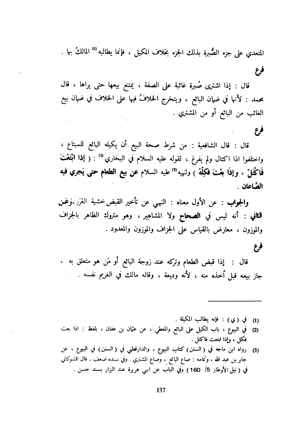 فَرْعٌ قَالَ قَالَ الشَّافِعِيَّةُ مِنْ شَرْطِ صِحَّةِ الْبَيْعِ أَنْ يَكِيلَهُ الْبَائِعُ لِلْمُبْتَاعِ وَاخْتَلَفُوا إِذَا اكْتَالَ وَلَمْ يُفْرِغْ لِقَوْلِهِ عَلَيْهِ السَّلَامُ فِي الْبُخَارِيِّ: (إِذَا ابْتَعْتَ فَاكْتَلْ وَإِذَا بِعْتَ فَكِلْهُ) وَلِنَهْيِهِ عَلَيْهِ السَّلَامُ عَنْ بَيْعِ الطَّعَامِ حَتَّى يَجْرِيَ فِيهِ الصَّاعَانِ وَالْجَوَابُ: عَنِ الأول مَعْنَاهُ: النَّهْيُ عَنْ تَأْخِيرِ الْقَبْضِ خَشْيَةَ الْغَرَرِ وَعَنِ الثَّانِي أَنَّهُ لَيْسَ فِي الصِّحَاحِ وَلَا الْمَشَاهِيرِ وَهُوَ مَتْرُوكُ الظَّاهِرِ بِالْجِزَافِ وَالْمَوْزُونِ مُعَارَضٌ بِالْقِيَاسِ عَلَى الْجِزَافِ وَالْمَوْزُونِ وَالْمَعْدُودِ