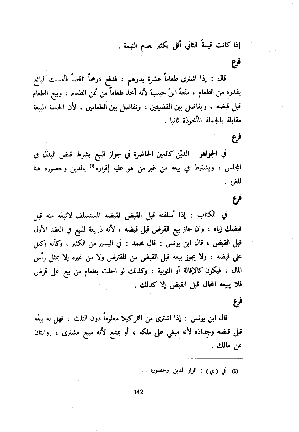 فَرْعٌ قَالَ: إِذَا اشْتَرَى طَعَامًا عَشَرَةً بِدِرْهَمٍ فَدَفَعَ دِرْهَمًا نَاقِصًا فَأَمْسَكَ الْبَائِعُ بِقَدْرِهِ مِنَ الطَّعَامِ مَنَعَهُ ابْنُ حَبِيبٍ لِأَنَّهُ أَخَذَ طَعَامًا مِنْ ثَمَنِ الطَّعَامِ وَبِيعَ الطَّعَامُ قَبْلَ قَبضه ويفاضل بَين القبضتين وَتَفَاضَلَ بَيْنَ الطَّعَامَيْنِ لِأَنَّ الْجُمْلَةَ الْمَبِيعَةَ مُقَابَلَةٌ بِالْجُمْلَةِ الْمَأْخُوذَةِ ثَانِيًا