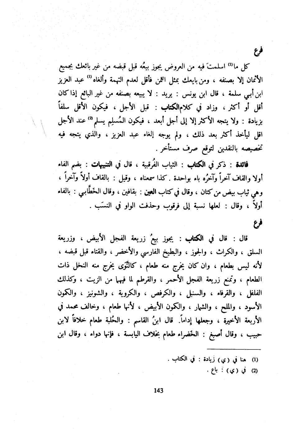 فَرْعٌ كُلُّ مَا أَسْلَمْتَ فِيهِ مِنَ الْعُرُوضِ يَجُوزُ بَيْعُهُ قَبْلَ قَبْضِهِ مِنْ غَيْرِ بَائِعِكَ بِجَمِيعِ الْأَثْمَانِ إِلَّا بِصِنْفِهِ وَمَنْ بَايَعَكَ بِمِثْلِ الثَّمَنِ فَأَقَلُّ لِعَدَمِ التُّهْمَةِ وَأَلْغَاهُ عَبْدُ الْعَزِيزِ ابْن أَبِي سَلَمَةَ قَالَ ابْنُ يُونُسَ: يُرِيدُ: لَا يَبِيعُهُ بِصِنْفِهِ مِنْ غَيْرِ الْبَائِعِ إِذَا كَانَ أَقَلَّ أَوْ أَكْثَرَ وَزَادَ فِي كَلَامِ الْكِتَابِ: قَبْلَ الْأَجَلِ فَيَكُونُ الْأَقَلُّ سَلَفًا بِزِيَادَةٍ وَلَا يَتَّجِهُ الْأَكْثَرُ إِلَّا إِلَى أَجَلٍ أَبْعَدَ فَيَكُونُ الْمُسْلِمُ يُسْلِمُ عِنْدَ الْأَجَلِ أَقَلَّ لِيَأْخُذَ أَكْثَرَ بَعْدَ ذَلِكَ وَلَمْ يُوَجَّهْ إِلْغَاءُ عَبْدِ الْعَزِيزِ وَالَّذِي يَتَّجِهُ فِيهِ تَخْصِيصُهُ بِالنَّقْدَيْنِ لِتَوَقُّعِ صَرْفٍ مُسْتَأْخِرٍ فَائِدَةٌ: ذُكِرَ فِي الْكِتَابِ: الثِّيَابُ الْفُرْقُبِيَّةُ قَالَ فِي التَّنْبِيهَاتِ: بِضَمِّ الْفَاءِ أَوَّلًا وَالْقَافِ آخِرًا وَآخِرُهُ بَاءٌ بِوَاحِدَةٍ كَذَا سَمِعْنَاهُ وَقِيلَ بِالْقَافِ أَوَّلًا وَآخِرًا وَهِيَ ثِيَابٌ بِيضٌ مِنْ كَتَّانٍ وَقَالَ فِي كِتَابِ الْعَيْنِ: بِقَافَيْنِ وَقَالَ الْخَطَّابِيُّ: بِالْفَاءِ أَوَّلًا وَقَالَ: لَعَلَّهَا نِسْبَةٌ إِلَى فُرْقُوبَ وَحُذِفَتِ الْوَاوُ فِي النَّسَبِ
