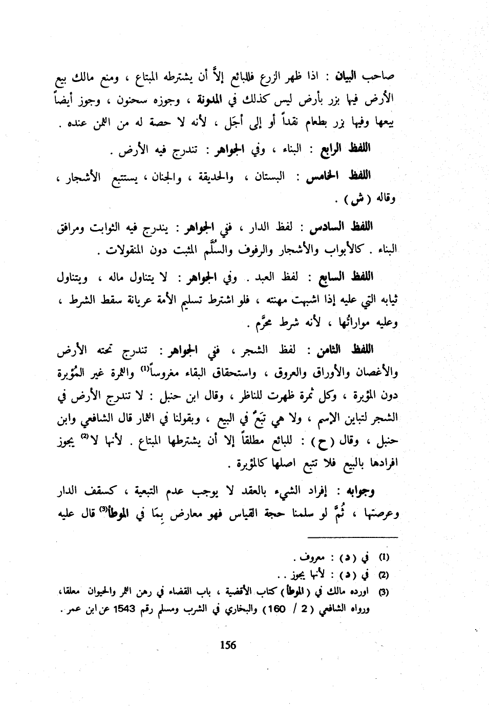 اللَّفْظُ الرَّابِعُ: الْبِنَاءُ وَفِي الْجَوَاهِرِ: تَنْدَرِجُ فِيهِ الْأَرْضُ اللَّفْظُ الْخَامِسُ: الْبُسْتَانُ وَالْحَدِيقَةُ وَالْجِنَانُ يَسْتَتْبِعُ الْأَشْجَارَ وَقَالَهُ (ش) اللَّفْظُ السَّادِسُ: لَفْظُ الدَّارِ فَفِي الْجَوَاهِرِ: يَنْدَرِجُ فِيهِ الثَّوَابِتُ وَمَرَافِقُ الْبِنَاءِ كَالْأَبْوَابِ وَالْأَشْجَارِ وَالرُّفُوفِ وَالسُّلَّمِ الْمُثَبَّتِ دُونَ الْمَنْقُولَاتِ اللَّفْظُ السَّابِعُ: لَفْظُ الْعَبْدِ وَفِي الْجَوَاهِرِ: لَا يَتَنَاوَلُ مَالَهُ وَيَتَنَاوَلُ ثِيَابَهُ عَلَيْهِ إِذَا أَشْبَهَتْ مِهْنَتَهُ فَلَوِ اشْتَرَطَ تَسْلِيمَ الْأَمَةِ عُرْيَانَةً سَقَطَ الشَّرْطُ وَعَلَيْهِ مُوَارَاتُهَا لِأَنَّهُ شَرْطٌ مُحَرَّمٌ اللَّفْظُ الثَّامِنُ: لَفْظُ الشَّجَرِ فَفِي الْجَوَاهِرِ: تَنْدَرِجُ تَحْتَهُ الْأَرْضُ وَالْأَغْصَانُ وَالْأَوْرَاقُ وَالْعُرُوقُ وَاسْتِحْقَاقُ الْبَقَاءِ مَغْرُوسًا وَالثَّمَرَةُ غَيْرُ الْمُؤَبَّرَةِ دُونَ الْمُؤَبَّرَةِ وَكُلُّ ثَمَرَةٍ ظَهَرَتْ لِلنَّاظِرِ وَقَالَ ابْنُ حَنْبَلٍ: لَا تَنْدَرِجُ الْأَرْضُ فِي الشَّجَرِ لِتَبَايُنِ الِاسْمِ وَلَا هِيَ تَبَعٌ فِي الْبَيْعِ وَبِقَوْلِنَا فِي الثِّمَارِ قَالَ الشَّافِعِي وَابْنُ حَنْبَلٍ وَقَالَ (ح) : لِلْبَائِعِ مُطْلَقًا إِلَّا أَنْ يَشْتَرِطَهَا الْمُبْتَاعُ لِأَنَّهَا لَا يَجُوزُ إِفْرَادُهَا بِالْبَيْعِ فَلَا تَتْبَعُ أَصْلَهَا كَالْمُؤَبَّرَةِ وَجَوَابُهُ: إِفْرَادُ الشَّيْءِ بِالْعَقْدِ لَا يُوجِبُ عَدَمَ التَّبَعِيَّةِ كَسَقْفِ الدَّارِ وَعَرْصَتِهَا ثُمَّ لَوْ سَلَّمْنَا حُجَّةَ الْقِيَاسِ فَهُوَ معَارض بِمَا فِي الْمُوَطَّأ قَالَ