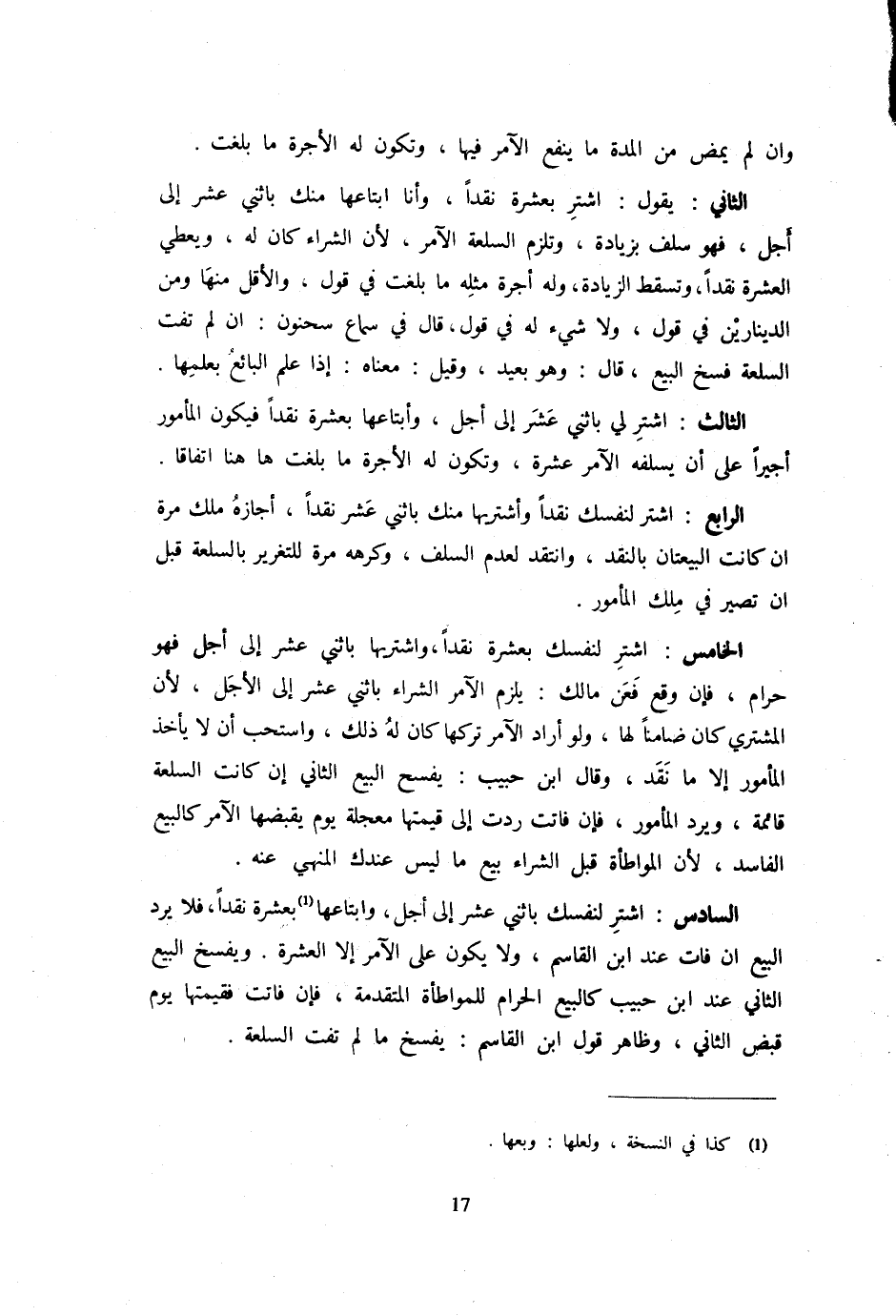 وان لم يمض من الْمدَّة مَا ينفع الْآمِرُ فِيهَا وَتَكُونُ لَهُ الْأُجْرَةُ مَا بَلَغَتْ الثَّانِي يَقُولُ اشْتَرِ بِعَشَرَةٍ نَقْدًا وَأَنَا أَبْتَاعُهَا مِنْكَ بِاثْنَيْ عَشَرَ إِلَى أَجَلٍ فَهُوَ سَلَفٌ بِزِيَادَةٍ وَتَلْزَمُ السِّلْعَةُ الْآمِرَ لِأَنَّ الشِّرَاءَ كَانَ لَهُ وَيُعْطِي الْعَشَرَةَ نَقْدًا وَتَسْقُطُ الزِّيَادَةُ وَلَهُ أُجْرَةُ مِثْلِهِ مَا بَلَغَتْ فِي قَوْلٍ وَالْأَقَلُّ مِنْهَا وَمِنَ الدِّينَارَيْنِ فِي قَوْلٍ وَلَا شَيْءَ لَهُ فِي قَوْلٍ قَالَ فِي سَمَاعِ سَحْنُونٍ إِنْ لَمْ تَفُتِ السِّلْعَةُ فُسِخَ الْبَيْعُ قَالَ وَهُوَ بَعِيدٌ وَقِيلَ مَعْنَاهُ إِذَا عَلِمَ الْبَائِعُ بِعِلْمِهَا الثَّالِثُ اشْتَرِ لِي بِاثْنَيْ عَشَرَ إِلَى أَجَلٍ وَأَبْتَاعُهَا بِعَشَرَةٍ نَقْدًا فَيَكُونُ الْمَأْمُورُ أَجِيرًا عَلَى أَنْ يُسْلِفَهُ الْآمِرُ عَشَرَةً وَتَكُونُ لَهُ الْأُجْرَة مَا بلغت هَا هُنَا اتِّفَاقًا الرَّابِعُ اشْتَرِ لِنَفْسِكَ نَقْدًا وَأَشْتَرِيهَا مِنْكَ بِاثْنَيْ عَشَرَ إِلَى أَجَلٍ فَهُوَ حَرَامٌ فَإِنْ وَقَعَ فَعَنْ مَالِكٍ يَلْزَمُ الْآمِرُ الشِّرَاءَ بِاثْنَيْ عَشَرَ إِلَى الْأَجَلِ لِأَنَّ الْمُشْتَرِيَ كَانَ ضَامِنًا لَهَا وَلَوْ أَرَادَ الْآمِرُ تَرْكَهَا كَانَ لَهُ ذَلِكَ وَاسْتَحَبَّ أَنْ لَا يَأْخُذَ الْمَأْمُورُ إِلَّا مَا نقد وَقَالَ ابْن حبيب يفسح الْبَيْعُ الثَّانِي إِنْ كَانَتِ السِّلْعَةُ قَائِمَةً وَيَرُدُّ الْمَأْمُورُ فَإِنْ فَاتَتْ رُدَّتْ إِلَى قِيمَتِهَا مُعَجَّلَةً يَوْمَ يَقْبِضُهَا الْآمِرُ كَالْبَيْعِ الْفَاسِدِ لِأَنَّ الْمُوَاطَأَةَ قَبْلَ الشِّرَاءِ بَيْعُ مَا لَيْسَ عِنْدَكَ الْمَنْهِيُّ عَنْهُ السَّادِسُ اشْتَرِ لِنَفْسِكَ بِاثْنَيْ عَشَرَ إِلَى أَجَلٍ وَأَبْتَاعُهَا بِعَشَرَةٍ نَقْدًا فَلَا يُرَدُّ الْبَيْعُ إِنْ فَاتَ عِنْدَ ابْنِ الْقَاسِمِ وَلَا يَكُونُ عَلَى الْآمِرِ إِلَّا الْعَشَرَةُ وَيُفْسَخُ الْبَيْعُ الثَّانِيَ عِنْدَ ابْنِ حَبِيبٍ كَالْبَيْعِ الْحَرَامِ لِلْمُوَاطَأَةِ الْمُتَقَدِّمَةِ فَإِنْ فَاتَتْ فَقِيمَتُهَا يَوْمَ قَبْضِ الثَّانِي وَظَاهِرُ قَوْلِ ابْنِ الْقَاسِمِ يُفْسَخُ مَا لَمْ تَفُتِ السّلْعَة