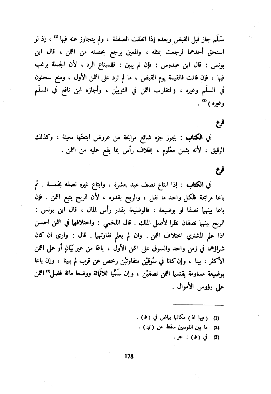 سَلَمٍ جَازَ قَبْلَ الْقَبْضِ وَبَعْدَهُ إِذَا اتَّفَقَتِ الصَّفْقَةُ وَلَمْ يَتَجَاوَزْ عَنْهُ فِيهَا إِذْ لَوِ اسْتَحَقَّ أَحْدُهُمَا لَرَجَعَتْ بِمِثْلِهِ وَالْمُعَيَّنُ يَرْجِعُ بِحِصَّتِهِ مِنَ الثَّمَنِ قَالَ ابْنُ يُونُسَ: قَالَ ابْنُ عَبْدُوسٍ: فَإِنْ لَمْ يُبَيِّنْ: فَلِلْمُبْتَاعِ الرَّدُّ لِأَنَّ الْجُمْلَةَ يَرْغَبُ فِيهَا فَإِنْ فَاتَتْ فَالْقِيمَةُ يَوْمَ الْقَبْضِ مَا لَمْ تُرَدَّ عَلَى الثَّمَنِ الْأَوَّلِ وَمَنَعَ سَحْنُونٌ فِي السَّلَمِ وَغَيْرِهِ (لِتَقَارُبِ الثَّمَنِ فِي الثَّوْبَيْنِ وَأَجَازَهُ ابْن نَافِع فِي السم وَغَيْرِهِ)