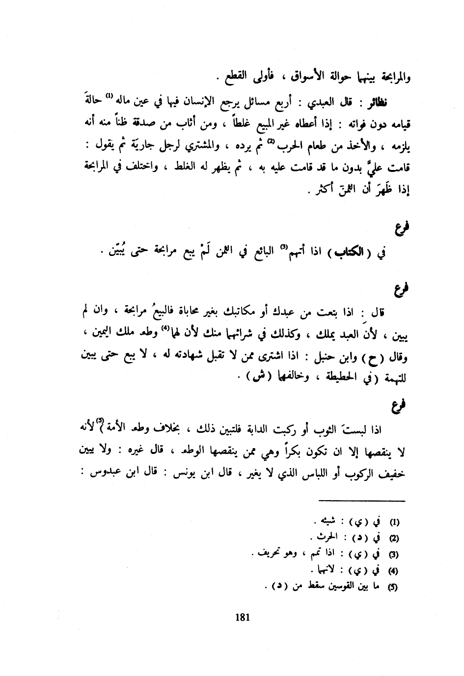 وَالْمُرَابَحَةُ بَيْنَهُمَا حَوَالَةُ الْأَسْوَاقِ فَأَوْلَى الْقَطْعُ نَظَائِرُ: قَالَ الْعَبْدِيُّ: أَرْبَعُ مَسَائِلَ يَرْجِعُ الْإِنْسَانُ فِيهَا فِي عَيْنِ مَالِهِ حَالَةَ قِيَامِهِ دُونَ فَوَاتِهِ: إِذَا أَعْطَاهُ غَيْرَ الْمَبِيعِ غَلَطًا وَمَنْ أَثَابَ مِنْ صَدَقَةٍ ظَنًّا مِنْهُ أَنَّهُ يَلْزَمُهُ الْأَخْذ مِنْ طَعَامِ الْحَرْبِ ثُمَّ يَرُدُّهُ وَالْمُشْتَرِي لِرِجْلٍ جَارِيَةً ثُمَّ يَقُولُ: قَامَتْ عليَّ بِدُونِ مَا قَامَتْ عَلَيْهِ بِهِ ثُمَّ يَظْهَرُ لَهُ الْغَلَطُ وَاخْتُلِفَ فِي الْمُرَابَحَةِ إِذَا ظَهَرَ أَنَّ الثَّمَنَ أَكْثَرُ