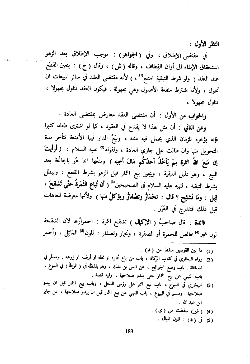 النَّظَرُ الْأَوَّلُ: فِي مُقْتَضَى الْإِطْلَاقِ وَفِي (الْجَوَاهِرِ) : مُوجَبُ الْإِطْلَاقِ بَعْدَ الزَّهْوِ اسْتِحْقَاقُ الْإِبْقَاءِ إِلَى أَوَانِ الْقِطَافِ وَقَالَهُ (ش) وَقَالَ (ح) : يَتَعَيَّنُ الْقَطْعُ عِنْدَ الْعَقْدِ (وَلَوْ شَرَطَ التَّبْقِيَةَ امْتَنَعَ) لِأَنَّهُ مُقْتَضَى الْعَقْدِ فِي سَائِرِ الْمَبِيعَاتِ أَنْ تَحَوَّلَ وَلِأَنَّهُ اشْتَرَطَ مَنْفَعَةَ الْأُصُولِ وَهِيَ مَجْهُولَةٌ فَيكون العقد تنَاول مَجْهُولا تَنَاوَلَ مَجْهُولًا وَالْجَوَابُ عَنِ الْأَوَّلِ: أَنَّ مُقْتَضَى الْعَقْدِ مُعَارَضٌ بِمُقْتَضَى الْعَادَةِ وَعَنِ الثَّانِي أَنَّ مِثْلَ هَذَا لَا يَقْدَحُ فِي الْعُقُودِ كَمَا لواشترى طَعَامًا كَثِيرًا فَإِنَّهُ يُؤَخِّرُهُ لِلزَّمَانِ الَّذِي يُحْمَلُ فِيهِ مِثْلُهُ وَبَيْعُ الدَّارِ فِيهَا الْأَمْتِعَةُ تَتَأَخَّرُ مُدَّةُ التَّحْوِيلِ مِنْهَا وَإِنْ طَالَتْ عَلَى جَارِي الْعَادة لقَوْله - صَلَّى اللَّهُ عَلَيْهِ وَسَلَّم َ - (أَرَأَيْتَ إِنْ مَنَعَ اللَّهُ الثَّمَرَةَ بِمَ يَأْخُذُ أَحَدُكُمْ مَالَ أَخِيهِ) وَمَنْعُهَا إِنَّمَا هُوَ بِالْجَائِحَةِ بَعْدَ الْبَيْعِ وَهُوَ دَلِيلُ التَّبْقِيَةِ وَيَجُوزُ بَيْعُ الثِّمَارِ قَبْلَ الزَّهْوِ بِشَرْطِ الْقَطْعِ وَيَبْطُلُ بِشَرْطِ التبقية لنَهْيه - صَلَّى اللَّهُ عَلَيْهِ وَسَلَّم َ - فِي الصَّحِيحَيْنِ (أَنْ تُبَاعَ الثَّمَرَةُ حَتَّى تُشقح قِيلَ: وَمَا تُشقح؟ قَالَ: تَحْمَارُّ وَتَصْفَارُّ وَيُؤْكَلُ مِنْهَا) وَلِأَنَّهَا مُعَرَّضَةٌ لِلْعَاهَاتِ قَبْلَ ذَلِكَ فَتَنْدَرِجُ فِي الْغَرَرِ فَائِدَةٌ: قَالَ صَاحِبُ (الْإِكْمَالِ) تَشَقُّحُ الثَّمَرَةِ: احْمِرَارُهَا لِأَنَّ الشَّقْحَةَ لَوْنٌ غَيْرُ خَالِصٍ لِلْحُمْرَةِ أَوِ الصُّفْرَةِ وَتَحْمَارُّ وَتَصْفَارُّ لِلَّوْنِ الْمَائِلِ وأحمر