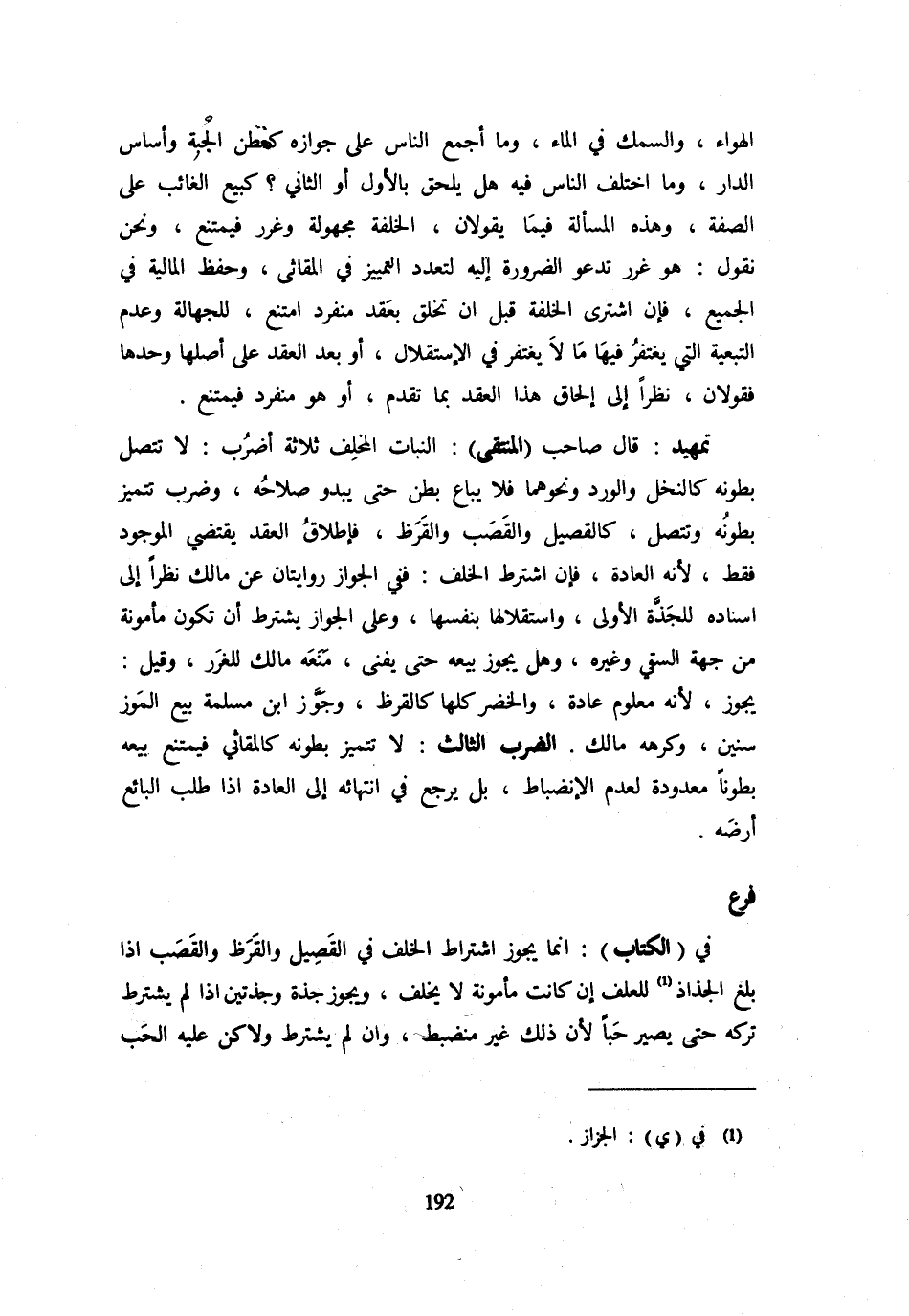 الْهَوَاءِ وَالسَّمَكِ فِي الْمَاءِ وَمَا أَجْمَعَ النَّاسُ على جَوَازه كطعن الْحبَّة وأسا الدَّارِ وَمَا اخْتَلَفَ النَّاسُ فِيهِ هَلْ يَلْحَقُ بِالْأَوَّلِ أَوِ الثَّانِي؟ كَبَيْعِ الْغَائِبِ عَلَى الصِّفَةِ وَهَذِه الْمَسْأَلَة فِيمَا يَقُولَانِ الْخِلْفَةُ مَجْهُولَةٌ وَغَرَرٌ فَيَمْتَنِعُ وَنَحْنُ نَقُولُ: هُوَ غَرَرٌ تَدْعُو الضَّرُورَةُ إِلَيْهِ لِتَعَدُّدِ التَّمْيِيزِ فِي المقائي وَحِفْظِ الْمَالِيَّةِ فِي الْجَمِيعِ فَإِنِ اشْتَرَى الْخِلْفَةَ قَبْلَ أَنْ تُخَلَّقَ بِعَقْدٍ مُنْفَرِدٍ امْتَنَعَ لِلْجَهَالَةِ وَعَدَمِ التَّبَعِيَّةِ الَّتِي يُغْتَفَرُ فِيهَا مَا لَا يُغْتَفَرُ فِي الِاسْتِقْلَالِ أَوْ بَعْدَ الْعَقْدِ عَلَى أَصْلِهَا وَحْدَهَا فَقَوْلَانِ نَظَرًا إِلَى إِلْحَاقِ هَذَا الْعَقْدِ بِمَا تَقَدَّمَ أَوْ هُوَ مُنْفَرِدٌ فَيَمْتَنِعُ تَمْهِيدٌ: قَالَ صَاحِبُ (الْمُنْتَقَى) : النَّبَاتُ الْمُخَلَّفُ ثَلَاثَةُ أَضْرُبٍ: لَا تَتَّصِلُ بُطُونُهُ كَالنَّخْلِ وَالْوَرْدِ وَنَحْوِهِمَا فَلَا يُبَاعُ بَطْنٌ حَتَّى يَبْدُوَ صَلَاحُهُ وَضَرْبٌ تَتَمَيَّزُ بُطُونُهُ وَتَتَّصِلُ كَالْقَصِيلِ وَالْقَصَبِ وَالْقَرَظِ فَإِطْلَاقُ الْعَقْدِ يَقْتَضِي الْمَوْجُودَ فَقَطْ لِأَنَّهُ الْعَادَةُ فَإِنِ اشْتَرَطَ الْخَلَفَ: فَفِي الْجَوَازِ رِوَايَتَانِ عَنْ مَالِكٍ نَظَرًا إِلَى إِسْنَادِهِ لِلِجَذَّةِ الْأُولَى وَاسْتِقْلَالِهَا بِنَفْسِهَا وَعَلَى الْجَوَازِ يُشْتَرَطُ أَنْ تَكُونَ مَأْمُونَةً مِنْ جِهَةِ السَّقْيِ وَغَيْرِهِ وَهَلْ يَجُوزُ بَيْعُهُ حَتَّى يَفْنَى مَنَعَهُ مَالِكٌ لِلْغَرَرِ وَقِيلَ: يَجُوزُ لِأَنَّهُ مَعْلُومٌ عَادَةً وَالْخُضْرُ كُلُّهَا كَالْقَرَظِ وَجَوَّزَ ابْنُ مَسْلَمَةَ بَيْعَ الْمَوْزِ سِنِينَ وَكَرِهَهُ مَالِكٌ الضَّرْبُ الثَّالِث: لَا تتَمَيَّز بطونه كالقاثي فَيَمْتَنِعُ بَيْعُهُ بُطُونًا مَعْدُودَةً لِعَدَمِ الِانْضِبَاطِ بَلْ يَرْجِعُ فِي انْتِهَائِهِ إِلَى الْعَادَةِ إِذَا طَلَبَ الْبَائِعُ أَرْضَهُ