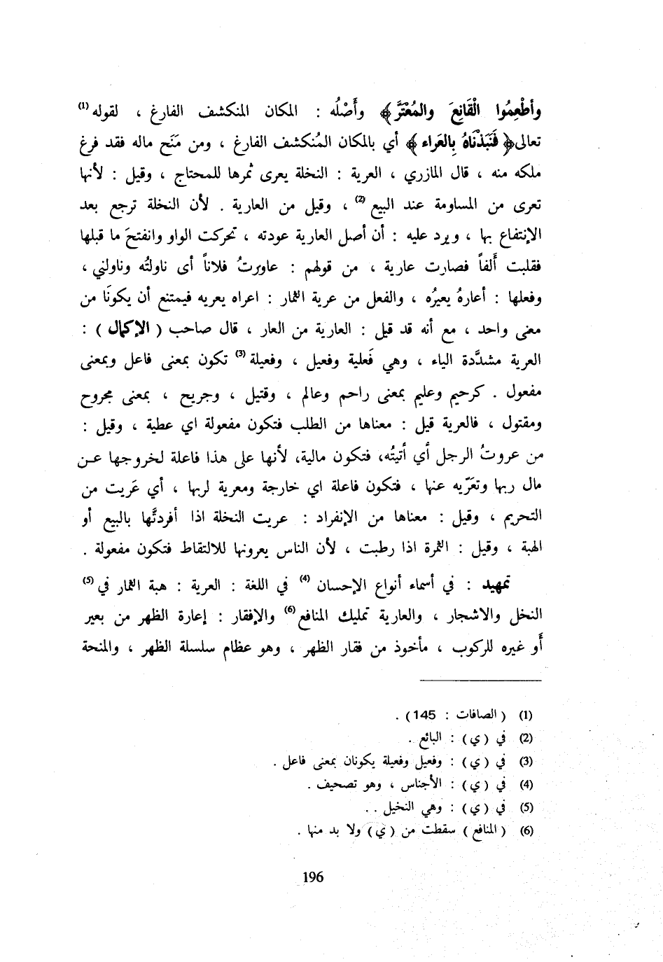 وأطعموا القانع والمعتر} وَأَصْلُهُ: الْمَكَانُ الْمُنْكَشِفُ الْفَارِغُ لِقَوْلِهِ تَعَالَى {فَنَبَذْنَاهُ بالعراء} أَيْ بِالْمَكَانِ الْمُنْكَشِفِ الْفَارِغِ وَمَنْ مَنَحَ مَالَهُ فَقَدْ فَرَغَ مِلْكُهُ مِنْهُ قَالَ الْمَازِرِيُّ الْعَرِيَّةُ: النَّخْلَةُ يُعَرَّى ثَمَرُهَا لِلْمُحْتَاجِ وَقِيلَ: لِأَنَّهَا تُعَرَّى مِنَ الْمُسَاوَمَةِ عِنْدَ الْبَيْعِ وَقِيلَ مِنَ الْعَارِيَةِ لِأَنَّ النَّخْلَةَ تَرْجِعُ بَعْدَ الِانْتِفَاعِ بِهَا وَيَرُدُّ عَلَيْهِ: أَن أصل الْعَارِية عودته تَحَرَّكَتِ الْوَاوُ وَانْفَتَحَ مَا قَبْلَهَا فَقُلِبَتْ أَلِفًا فَصَارَتْ عَارِيَةً مِنْ قَوْلِهِمْ: عَاوَرْتُ فُلَانًا أَيْ نَاوَلْتُهُ وَنَاوَلَنِي وَفِعْلُهَا: أَعَارَهُ يُعِيرُهُ وَالْفِعْلُ مِنْ عَرِيَّةِ الثِّمَارِ: أَعْرَاهُ يُعْرِيهِ فَيَمْتَنِعُ أَنْ يَكُونَا مِنْ مَعْنًى وَاحِدٍ مَعَ أَنَّهُ قَدْ قِيلَ: الْعِرَايَةُ مِنَ الْعَارِ قَالَ صَاحِبُ (الْإِكْمَالِ) : الْعَرِيَّةُ مُشَدَّدَةُ الْيَاءِ وَهِيَ فِعْلِيَّةٌ وَفَعِيلٌ وَفَعِيلَةٌ تَكُونُ بِمَعْنَى فَاعِلٍ وَبِمَعْنَى مَفْعُولٍ كَرَحِيمٍ وَعَلِيمٍ بِمَعْنَى رَاحِمٍ وَعَالِمٍ وَقَتِيلٍ وَجَرِيحٍ بِمَعْنَى مَجْرُوحٍ وَمَقْتُولٍ فَالْعَرِيَّةُ قِيلَ: مَعْنَاهَا مِنَ الطَّلَبِ فَتَكُونُ مَفْعُولَةً أَيْ عَطِيَّةٌ وَقِيلَ: مِنْ عَرَوْتُ الرَّجُلَ أَيْ أَتَيْتُهُ فَتَكُونُ مَالِيَّةً لِأَنَّهَا عَلَى هَذَا فَاعِلَةٌ لخروجها عَن مَال رَبِّهَا وَتَعَرِّيهِ عَنْهَا فَتَكُونُ فَاعِلَةً أَيْ خَارِجَةً وَمُعَرِّيَةً لِرَبِّهَا أَيْ عَرِيَتْ مِنَ التَّحْرِيمِ وَقِيلَ: مَعْنَاهَا مِنَ الِانْفِرَادِ: عَرَّيْتُ النَّخْلَةَ إِذَا أَفْرَدَتَهَا بِالْبَيْعِ أَوِ الْهِبَةِ وَقِيلَ: الثَّمَرَةُ إِذَا رَطُبَتْ لِأَنَّ النَّاسَ يُعَرُّونَهَا لِلِالْتِقَاطِ فَتَكُونُ مَفْعُولَةً تَمْهِيدٌ: فِي أَسْمَاءِ أَنْوَاعِ الْإِحْسَانِ فِي اللُّغَةِ: الْعَرِيَّةُ: هِبَةُ الثِّمَارِ فِي النَّخْلِ وَالْأَشْجَارِ وَالْعَارِيَةُ تَمْلِيكُ الْمَنَافِعِ وَالْإِفْقَارُ: إِعَارَةُ الظَّهْرِ مِنْ بَعِيرٍ أَوْ غَيْرِهِ لِلرُّكُوبِ مَأْخُوذٌ مِنْ فَقَارِ الظَّهْرِ وَهُوَ عِظَامُ سِلْسِلَةِ الظَّهْرِ وَالْمِنْحَةُ