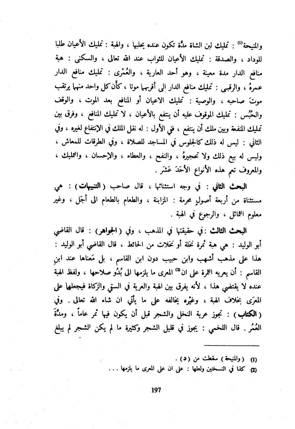 وَالْمَنِيحَةُ: تَمْلِيكُ لَبَنِ الشَّاةِ مُدَّةً تَكُونُ عِنْدَهُ يَحْلِبُهَا وَالْهِبَةُ: تَمْلِيكُ الْأَعْيَانِ طَلَبًا لِلْوِدَادِ وَالصَّدَقَةُ: تَمْلِيكُ الْأَعْيَانِ لِلثَّوَابِ عِنْدَ اللَّهِ تَعَالَى وَالسُّكْنَى: هِبَةُ مَنَافِعِ الدَّارِ مُدَّةً مُعَيَّنَةً وَهُوَ أَحَدُ الْعَارِيَةِ وَالْعُمْرَى: تَمْلِيكُ مَنَافِعِ الدَّارِ عُمْرَهُ وَالرُّقْبَى: تَمْلِيكُ مَنَافِعِ الدَّارِ إِلَى أَقْرَبِهِمَا مَوْتًا كَأَنَّ كُلَّ وَاحِدٍ مِنْهُمَا يَرْتَقِبُ مَوْتَ صَاحِبِهِ وَالْوَصِيَّةُ: تَمْلِيكُ الْأَعْيَانِ أَوِ الْمَنَافِعِ بَعْدَ الْمَوْتِ وَالْوَقْفُ وَالْحَبْسِ: تَمْلِيكُ الْمَوْقُوفِ عَلَيْهِ أَنْ يَنْتَفِعَ بِالْأَعْيَانِ لَا تَمْلِيكَ الْمَنَافِعِ وَفَرْقٌ بَيْنَ تَمْلِيكِ الْمَنْفَعَةِ وَبَيْنَ مِلْكٍ أَنْ يَنْتَفِعَ فَفِي الْأَوَّلِ: لَهُ نَقْلُ الْمِلْكِ فِي الِانْتِفَاعِ لِغَيْرِهِ وَفِي الثَّانِي: لَيْسَ لَهُ ذَلِكَ كَالْجُلُوسِ فِي الْمَسَاجِدِ لِلصَّلَاةِ وَفِي الطُّرُقَاتِ لِلْمَعَاشِ وَلَيْسَ لَهُ بَيْعُ ذَلِكَ وَلَا تَحْجِيرُهُ وَالنَّفْحُ وَالْعَطَاءُ وَالْإِحْسَانُ وَالتَّمْلِيكُ وَالْمَعْرُوفُ تَعُمُّ هَذِهِ الْأَنْوَاعُ الْأَحَدَ عَشَرَ. الْبَحْثُ الثَّانِي: فِي وَجْهِ اسْتِثْنَائِهَا قَالَ صَاحِبُ (التَّنْبِيهَاتِ) : هِيَ مُسْتَثْنَاةٌ مِنْ أَرْبَعَةِ أُصُولٍ مُحَرَّمَةٍ: الْمُزَابَنَةُ وَالطَّعَامُ بِالطَّعَامِ إِلَى أَجَلٍ وَغَيْرُ مَعْلُومِ التَّمَاثُلُ وَالرُّجُوعُ فِي الْهِبَةِ. الْبَحْثُ الثَّالِثُ: فِي حَقِيقَتِهَا فِي الْمَذْهَبِ وَفِي (الْجَوَاهِرِ) : قَالَ الْقَاضِي أَبُو الْوَلِيدِ: هِيَ هِبَةُ ثَمَرَةِ نَخْلَةٍ أَوْ نَخَلَاتٍ مِنَ الْحَائِطِ قَالَ الْقَاضِي أَبُو الْوَلِيدِ: هَذَا عَلَى مَذْهَبِ أَشْهَبَ وَابْنِ حَبِيبٍ دُونَ ابْنِ الْقَاسِمِ بَلْ مَعْنَاهَا عِنْدَ ابْنِ الْقَاسِمِ: أَنْ يُعْرِيَهُ الثَّمَرَة على أَن المعرى مَا يَلْزَمُهَا إِلَى بُدُوِّ صَلَاحِهَا وَلَفْظُ الْهِبَةِ عِنْدَهُ لَا يَقْتَضِي هَذَا لِأَنَّهُ يُفَرِّقُ بَيْنَ الْهِبَةِ وَالْعَرِيَّةِ فِي السَّقْيِ وَالزَّكَاةِ فَيَجْعَلُهَا عَلَى الْمُعْرَى بِخِلَافِ الْهِبَةِ وَغَيْرُهُ يُخَالِفُهُ عَلَى مَا يَأْتِي إِنْ شَاءَ اللَّهُ تَعَالَى وَفِي (الْكِتَابِ) : تَجُوزُ عَرِيَّةُ النَّخْلِ وَالشَّجَرِ قَبْلَ أَنْ يَكُونَ فِيهَا ثَمَرٌ عَامًّا وَمُدَّةُ الْعُمُرِ. قَالَ اللَّخْمِيُّ: يَجُوزُ فِي قَلِيلِ الشَّجَرِ وَكَثِيرِهِ مَا لَمْ يَكُنِ الشَّجَرُ لَمْ يَبْلُغِ
