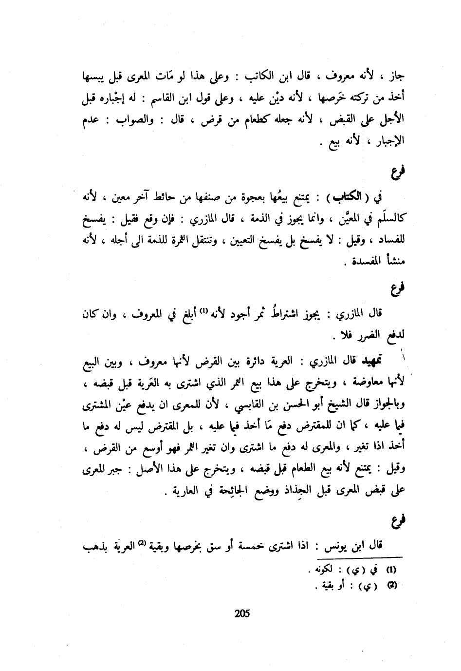 فَرْعٌ قَالَ الْمَازِرِيُّ: يَجُوزُ اشْتِرَاطُ ثَمَرٍ أَجْوَدَ لِأَنَّهُ أَبْلَغُ فِي الْمَعْرُوفِ وَإِنْ كَانَ لِدَفْعِ الضَّرَرِ فَلَا تَمْهِيدٌ قَالَ الْمَازِرِيُّ: الْعَرِيَّةُ دَائِرَةٌ بَيْنَ الْقَرْضِ لِأَنَّهَا مَعْرُوفٌ وَبَيْنَ الْبَيْعِ لِأَنَّهَا مُعَاوَضَةٌ وَيَتَخَرَّجُ عَلَى هَذَا بَيْعُ التَّمْرِ الَّذِي اشْتَرَى بِهِ الْعَرِيَّةَ قَبْلَ قَبْضِهِ وَبِالْجَوَازِ قَالَ الشَّيْخُ أَبُو الْحَسَنِ بْنُ الْقَابِسِيِّ: لِأَنَّ لِلْمُعْرَى أَنْ يَدْفَعَ عَيْنَ الْمُشْتَرَى فِيمَا عَلَيْهِ كَمَا أَنَّ لِلْمُقْتَرِضِ دَفْعَ مَا أَخَذَ فِيمَا عَلَيْهِ بَلِ الْمُقْتَرِضُ لَيْسَ لَهُ دَفْعُ مَا أَخَذَ إِذَا تَغَيَّرَ وَالْمُعْرَى لَهُ دَفْعُ مَا اشْتَرَى وَإِنْ، تَغَيَّرَ الثَّمر فَهُوَ أَوْسَعُ مِنَ الْقَرْضِ وَقِيلَ: يَمْتَنِعُ لِأَنَّهُ بِيعُ الطَّعَامِ قَبْلَ قَبْضِهِ وَيَتَخَرَّجُ عَلَى هَذَا الْأَصْلِ: جَبْرُ الْمُعْرَى عَلَى قَبْضِ الْمُعْرَى قَبْلَ الْجِذَاذِ وَوَضْعُ الْجَائِحَةِ فِي الْعَارِيَةِ