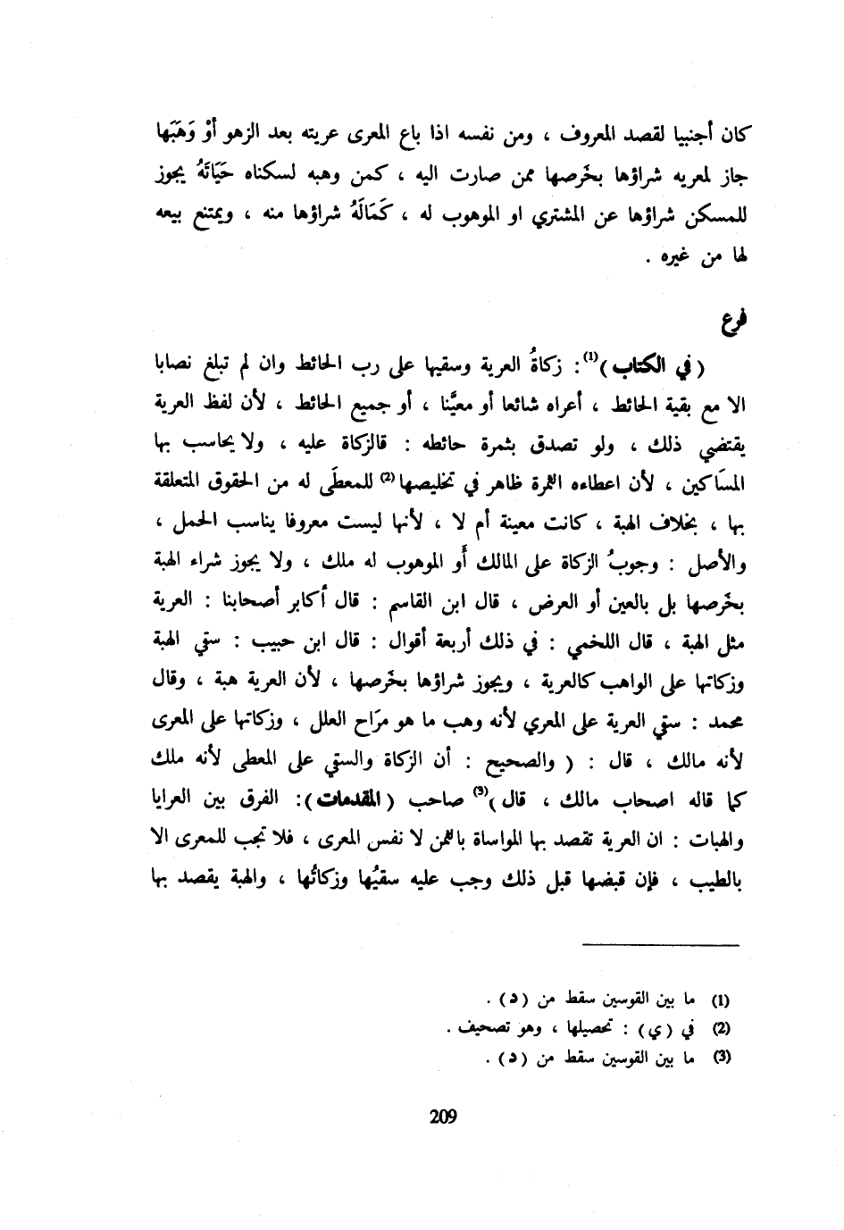 فَرْعٌ فِي الْكِتَابِ) : زَكَاةُ الْعَرِيَّةِ وَسَقْيُهَا عَلَى رَبِّ الْحَائِطِ وَإِنْ لَمْ تَبْلُغْ نِصَابًا إِلَّا مَعَ بَقِيَّة الحائظ أَعْرَاهُ شَائِعًا أَوْ مُعَيَّنًا أَوْ جَمِيعَ الْحَائِطِ لِأَنَّ لَفْظَ الْعَرِيَّةِ يَقْتَضِي ذَلِكَ وَلَوْ تَصَدَّقَ بِثَمَرَةِ حَائِطِهِ: فَالزَّكَاةُ عَلَيْهِ وَلَا يُحَاسَبُ بِهَا الْمَسَاكِينُ لِأَنَّ إِعْطَاءَهُ الثَّمَرَةَ ظَاهِرٌ فِي تَخْلِيصِهَا للمعطى لَهُ من الْحُقُوق الْمُتَعَلّق بِهَا بِخِلَافِ الْهِبَةِ كَانَتْ مُعَيَّنَةً أَمْ لَا لِأَنَّهَا لَيْسَتْ مَعْرُوفًا يُنَاسِبُ الْحَمْلَ وَالْأَصْلُ: وُجُوبُ الزَّكَاةِ عَلَى الْمَالِكِ أَوِ الْمَوْهُوبِ لَهُ مِلْكٌ وَلَا يَجُوزُ شِرَاءُ الْهِبَةِ بِخَرْصِهَا بَلْ بِالْعَيْنِ أَوِ الْعَرْضِ قَالَ ابْنُ الْقَاسِمِ: قَالَ أَكَابِرُ أَصْحَابِنَا: الْعَرِيَّةُ مِثْلُ الْهِبَةِ قَالَ اللَّخْمِيُّ: فِي ذَلِكَ أَرْبَعَةُ أَقْوَالٍ: قَالَ ابْنُ حَبِيبٍ: سَقْيُ الْهِبَةِ وَزَكَاتُهَا عَلَى الْوَاهِبِ كَالْعَرِيَّةِ وَيَجُوزُ شِرَاؤُهَا بِخَرْصِهَا لِأَنَّ الْعَرِيَّةَ هِبَةٌ وَقَالَ مُحَمَّدٌ: سَقْيُ الْعَرِيَّةِ عَلَى الْمُعْرَى لِأَنَّهُ وُهِبَ مَا هُوَ مَرَاحُ الْعِلَلِ وَزَكَاتُهَا عَلَى الْمُعْرِي لِأَنَّهُ مَالِكٌ قَالَ: (وَالصَّحِيحُ: أَنَّ الزَّكَاةَ وَالسَّقْيَ عَلَى الْمُعْطَى لِأَنَّهُ مَلَكَ كَمَا قَالَهُ أَصْحَابُ مَالِكٍ قَالَ) صَاحِبُ (الْمُقَدِّمَاتِ) : الْفَرْقُ بَيْنَ الْعَرَايَا وَالْهِبَاتِ: أَنَّ الْعرية تقصد بِهَا الْمُوَاسَاةُ بِالثَّمَنِ لَا نَفْسَ الْمُعْرَى فَلَا تَجِبُ لِلْمُعْرَى إِلَّا بِالطِّيبِ فَإِنْ قَبَضَهَا قَبْلَ ذَلِكَ وَجَبَ عَلَيْهِ سقيُها وَزَكَاتُهَا وَالْهِبَةُ يُقْصَدُ بهَا