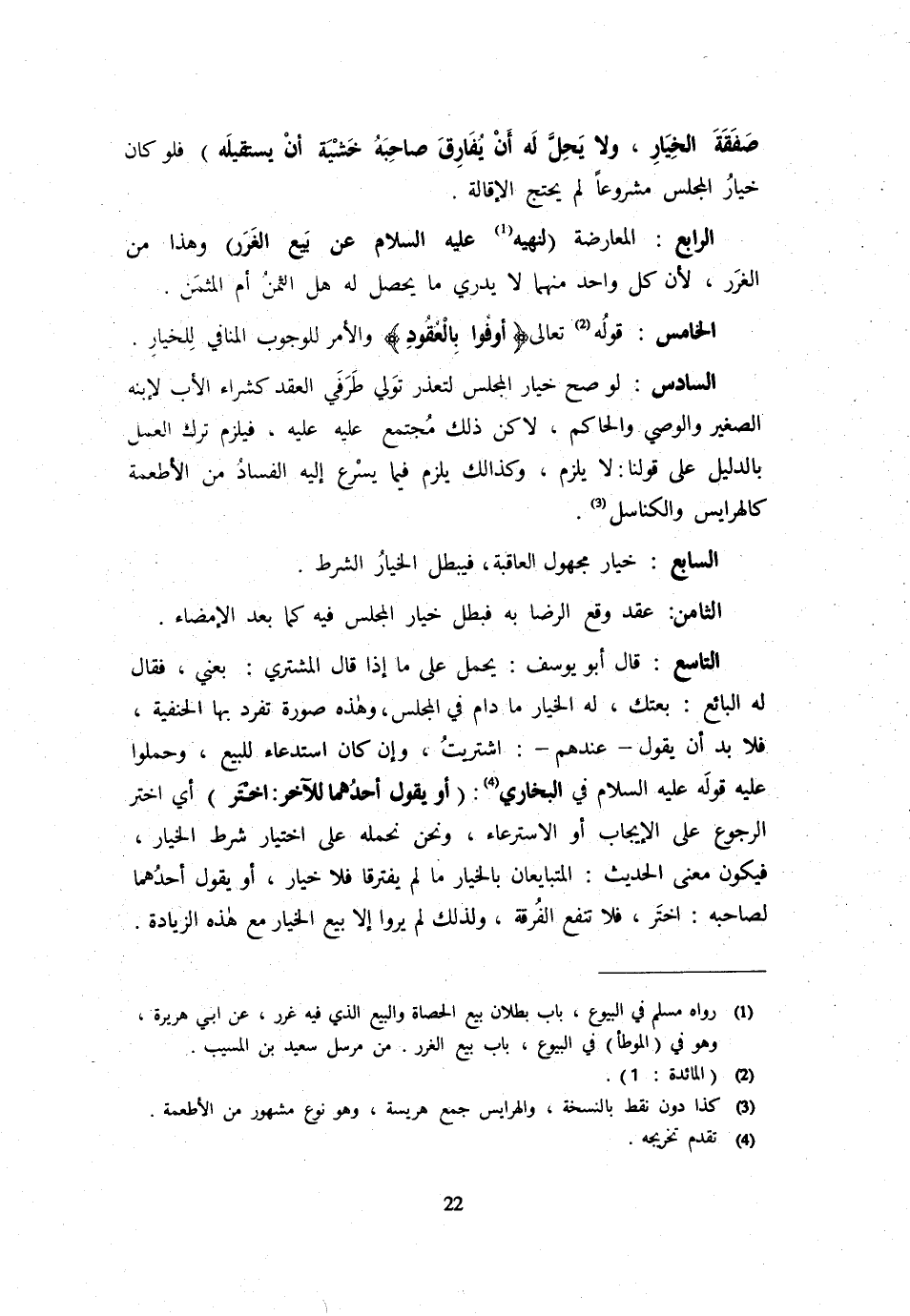 صَفْقَةَ الْخِيَارِ وَلَا يَحِلُّ لَهُ أَنْ يُفَارِقَ صَاحِبَهُ خَشْيَةَ أَنْ يَسْتَقِيلَهُ فَلَوْ كَانَ خِيَارُ الْمَجْلِسِ مَشْرُوعًا لَمْ يَحْتَجِ الْإِقَالَةَ الرَّابِعُ الْمُعَارَضَةُ لنَهْيه عَلَيْهِ السَّلَام عَن يَبِيع الْغَرَرِ وَهَذَا مِنَ الْغَرَرِ لِأَنَّ كُلَّ وَاحِدٍ مِنْهُمَا لَا يَدْرِي مَا يَحْصُلُ لَهُ هَلِ الثَّمَنُ أَمِ الْمُثَمَّنُ الْخَامِسُ قَوْله تَعَالَى {أَوْفُوا بِالْعُقُودِ} وَالْأَمْرُ لِلْوُجُوبِ الْمُنَافِي لِلْخِيَارِ السَّادِسُ لَوْ صَحَّ خِيَارُ الْمَجْلِسِ لَتَعَذَّرَ تَوَلِّي طَرَفَيِ الْعَقْدِ كَشِرَاءِ الْأَب لإبنه الصَّغِير وَالْوَصِيّ وَالْحَاكِم لاكن ذَلِك مُجْتَمع عَلَيْهِ عَلَيْهِ فَيَلْزَمُ تَرْكَ الْعَمَلِ بِالدَّلِيلِ عَلَى قَوْلِنَا لَا يلْزم وكذالك يَلْزَمُ فِيمَا يُسْرِعُ إِلَيْهِ الْفَسَادُ مِنَ الْأَطْعِمَةِ كالهرايس والكناسل السَّابِعُ خِيَارٌ مَجْهُولُ الْعَاقِبَةِ فَيُبْطِلُ الْخِيَارُ الشَّرْطَ الثَّامِنُ عَقْدٌ وَقَعَ الرِّضَا بِهِ فَبَطَلَ خِيَارُ الْمَجْلِسِ فِيهِ كَمَا بَعُدَ الْإِمْضَاءُ التَّاسِعُ قَالَ أَبُو يُوسُفَ يُحْمَلُ عَلَى مَا إِذَا قَالَ الْمُشْتَرِي بِعْنِي فَقَالَ لَهُ الْبَائِعُ بِعْتُكَ لَهُ الْخِيَارُ مَا دَامَ فِي الْمَجْلِسِ وَهَذِهِ صُورَةٌ تَفَرَّدَ بِهَا الْحَنَفِيَّةُ فَلَا بُدَ أَنْ يَقُولَ عِنْدَهُمْ اشْتَرَيْتُ وَإِنْ كَانَ اسْتِدْعَاءً لِلْبَيْعِ وَحَمَلُوا عَلَيْهِ قَوْلَهُ عَلَيْهِ السَّلَامُ فِي الْبُخَارِيِّ أَوْ يَقُولُ أَحَدُهُمَا لِلْآخَرِ اخْتَرْ أَيْ اخْتَرِ الرُّجُوعَ على الْإِيجَاب اَوْ الاسترعاء وَنَحْنُ نَحْمِلُهُ عَلَى اخْتِيَارِ شَرْطِ الْخِيَارِ فَيَكُونُ مَعْنَى الْحَدِيثِ الْمُتَبَايِعَانِ بِالْخِيَارِ مَا لَمْ يَفْتَرِقَا فَلَا خِيَارَ أَوْ يَقُولُ أَحَدُهُمَا لِصَاحِبِهِ اخْتَرْ فَلَا تَنْفَع الْفرْقَة وَلذَلِك لم يرَوا إِلَّا بَيْعَ الْخِيَارِ مَعَ هَذِهِ الزِّيَادَةِ