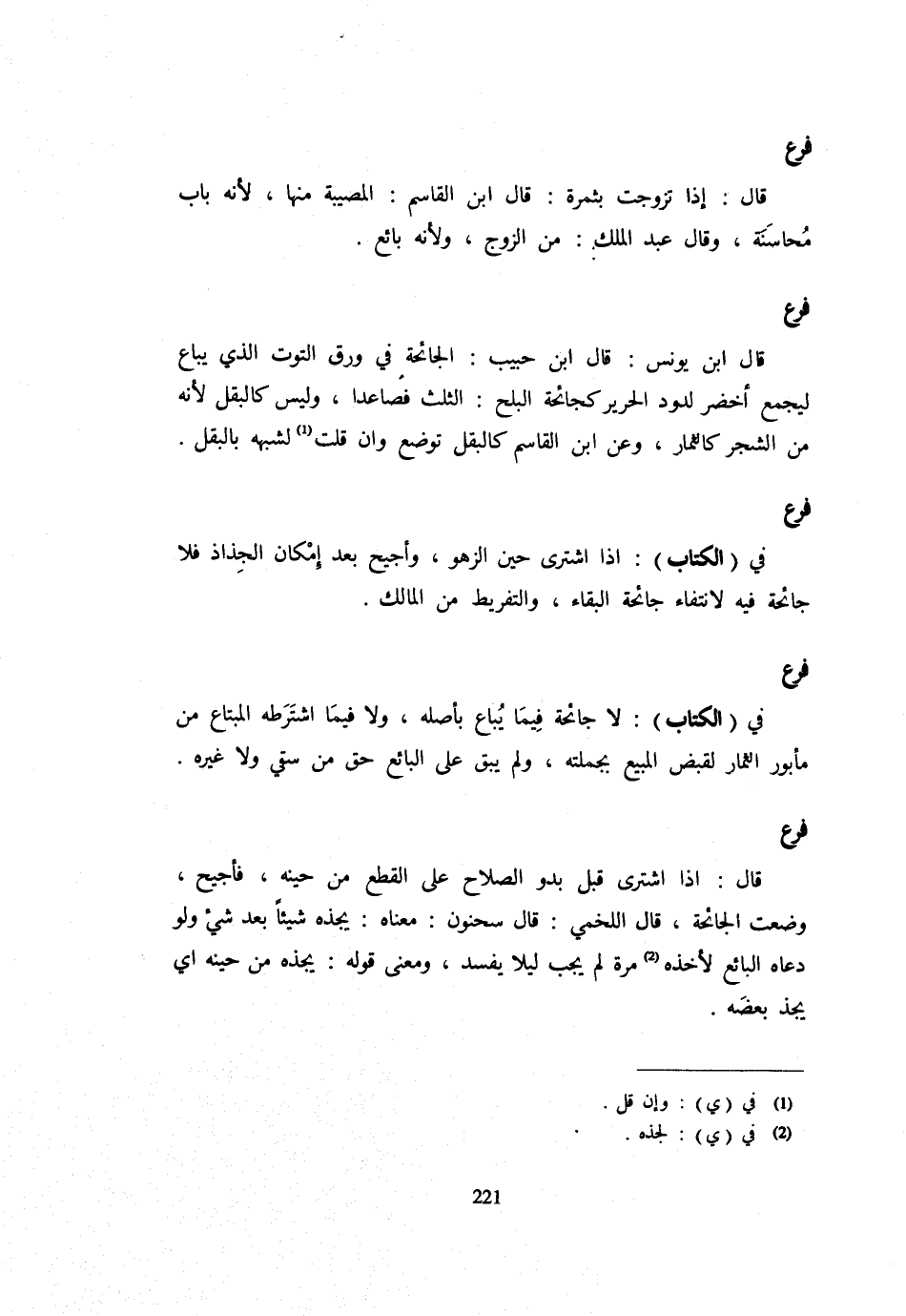 قَالَ: إِذَا تَزَوَّجَتْ بِثَمَرَةٍ: قَالَ ابْنُ الْقَاسِمِ: الْمُصِيبَةُ مِنْهَا لِأَنَّهُ بَابُ مُحَاسَنَةٍ وَقَالَ عَبْدُ الْمَلِكِ: مِنَ الزَّوْجِ وَلِأَنَّهُ بَائِعٌ