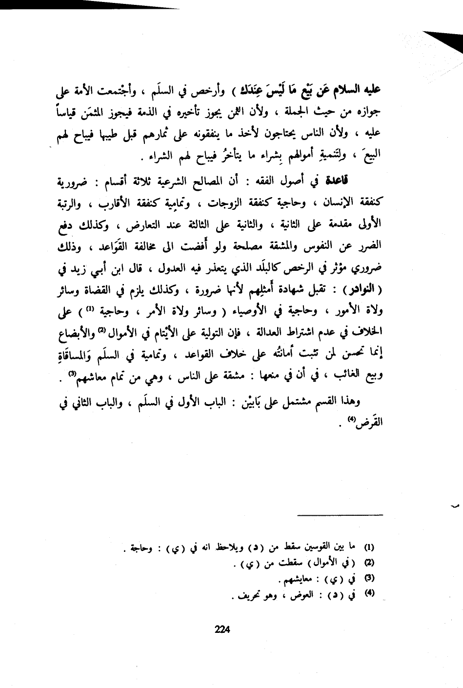 - صَلَّى اللَّهُ عَلَيْهِ وَسَلَّم َ - عَنْ بَيْعِ مَا لَيْسَ عِنْدَكَ) وَأَرْخَصَ فِي السَّلَمِ وَاجْتَمَعَتِ الْأُمَّةُ عَلَى جَوَازِهِ مِنْ حَيْثُ الْجُمْلَةُ وَلِأَنَّ الثَّمَنَ يَجُوزُ تَأْخِيرُهُ فِي الذِّمَّةِ فَيَجُوزُ الْمُثَمَّنُ قِيَاسًا عَلَيْهِ وَلِأَنَّ النَّاسَ يَحْتَاجُونَ لِأَخْذِ مَا يُنْفِقُونَهُ عَلَى ثِمَارِهِمْ قَبْلَ طِيبِهَا فَيُبَاحُ لَهُمُ الْبَيْعُ وَلِتَنْمِيَةِ أَمْوَالِهِمْ بِشِرَاءِ مَا يَتَأَخَّرُ فَيُبَاحُ لَهُمُ الشِّرَاءُ قَاعِدَةٌ فِي أُصُولِ الْفِقْهِ أَنَّ الْمَصَالِحَ الشَّرْعِيَّةَ ثَلَاثَةُ أَقْسَامٍ ضَرُورِيَّةٌ كَنَفَقَةِ الْإِنْسَانِ وَحَاجِيَّةٌ كَنَفَقَةِ الزَّوْجَاتِ وَتَمَامِيَّةٌ كَنَفَقَةِ الْأَقَارِبِ وَالرُّتْبَةُ الْأُولَى مُقَدَّمَةٌ عَلَى الثَّانِيَةِ وَالثَّانِيَةُ عَلَى الثَّالِثَةِ عِنْدَ التَّعَارُضِ وَكَذَلِكَ دَفْعُ الضَّرَرِ عَنِ النُّفُوسِ وَالْمَشَقَّةِ مَصْلَحَةٌ وَلَوْ أَفْضَتْ إِلَى مُخَالَفَةِ الْقَوَاعِدِ وَذَلِكَ ضَرُورِيٌّ مُؤَثِّرٌ فِي الرُّخَصِ كَالْبَلَدِ الَّذِي يَتَعَذَّرُ فِيهِ الْعُدُولُ قَالَ ابْنُ أَبِي زَيْدٍ فِي (النَّوَادِرِ تُقْبَلُ شَهَادَةُ أَمْثَلِهِمْ لِأَنَّهَا ضَرُورَةٌ وَكَذَلِكَ يَلْزَمُ فِي الْقُضَاةِ وَسَائِرِ وُلَاةِ الْأُمُورِ وَحَاجِيَّةٌ فِي الْأَوْصِيَاءِ (وَسَائِرِ وُلَاةِ الْأَمْرِ وَحَاجِيَّةٌ) عَلَى الْخِلَافِ فِي عَدَمِ اشْتِرَاطِ الْعَدَالَةِ فَإِنَّ التَّوْلِيَةَ عَلَى الْأَيْتَامِ فِي الْأَمْوَالِ وَالْأَبْضَاعِ إِنَّمَا تَحْسُنُ لِمَنْ تَثْبُتُ أَمَانَتُهُ عَلَى خِلَافِ الْقَوَاعِدِ وَتَمَامِيَّةٌ فِي السَّلَمِ وَالْمُسَاقَاةِ وَبَيْعِ الْغَائِبِ فِي أَنَّ فِي مَنْعِهَا مَشَقَّةً عَلَى النَّاسِ وَهِيَ مِنْ تَمَامِ مَعَاشِهِمْ وَهَذَا الْقِسْمُ مُشْتَمِلٌ عَلَى بَابَيْنِ الْبَابُ الْأَوَّلُ فِي السَّلَمِ وَالْبَابُ الثَّانِي فِي الْقَرْضِ