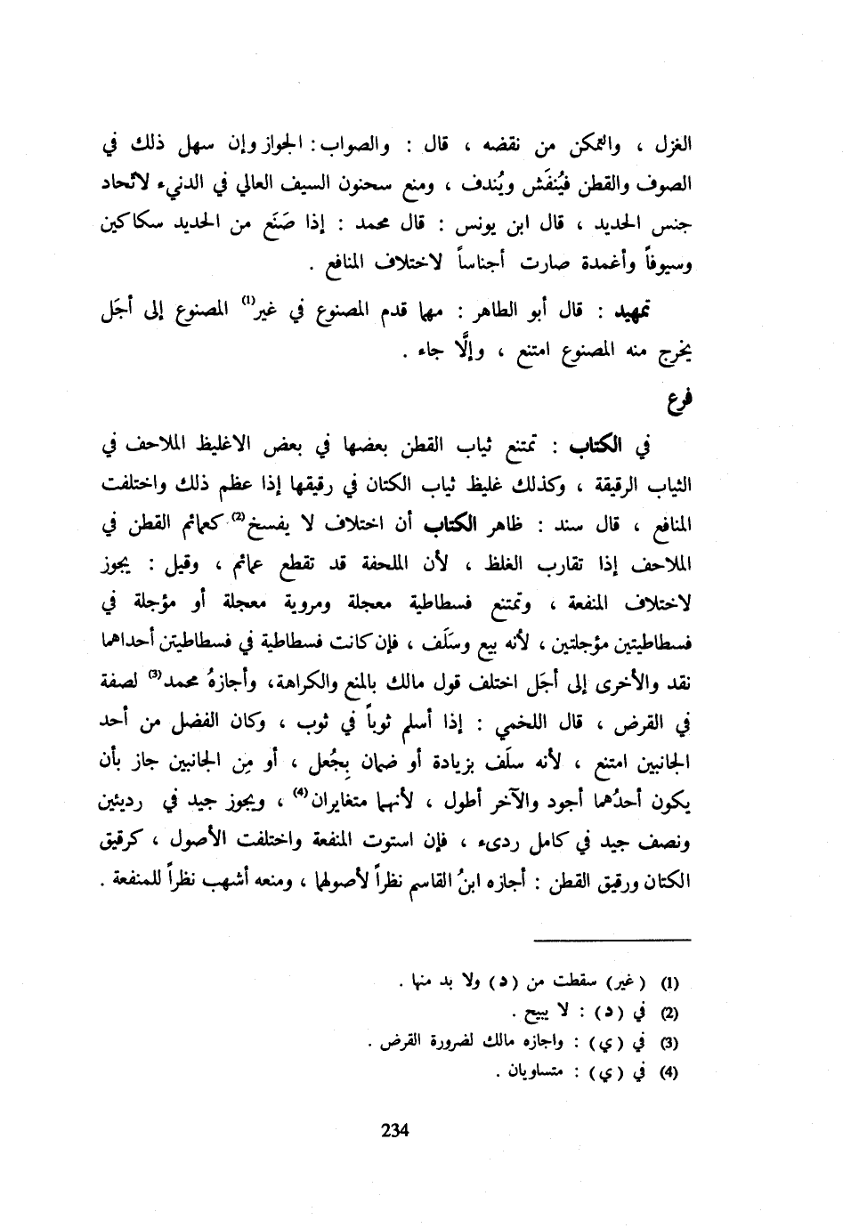 الْغَزْلِ وَالتَّمَكُّنِ مِنْ نَقْضِهِ قَالَ: وَالصَّوَابُ: الْجَوَازُ وَإِن سهل ذَلِك فِي الصُّوف والقطن فيُنقش وَيُنْدَفُ وَمَنَعَ سَحْنُونٌ السَّيْفَ الْعَالِي فِي الدَّنِيءِ لِاتِّحَادِ جِنْسِ الْحَدِيدِ قَالَ ابْنُ يُونُسَ: قَالَ مُحَمَّدٌ: إِذَا صَنَعَ مِنَ الْحَدِيدِ سَكَاكِينَ وَسُيُوفًا وَأَغْمِدَةً صَارَتْ أَجْنَاسًا لِاخْتِلَافِ الْمَنَافِعِ تَمْهِيدٌ: قَالَ أَبُو الطَّاهِرِ: مَهْمَا قَدُمَ الْمَصْنُوعُ فِي غَيْرِ الْمَصْنُوعِ إِلَى أَجَلٍ يَخْرُجُ مِنْهُ الْمَصْنُوعُ امْتَنَعَ وَإِلَّا جَاءَ