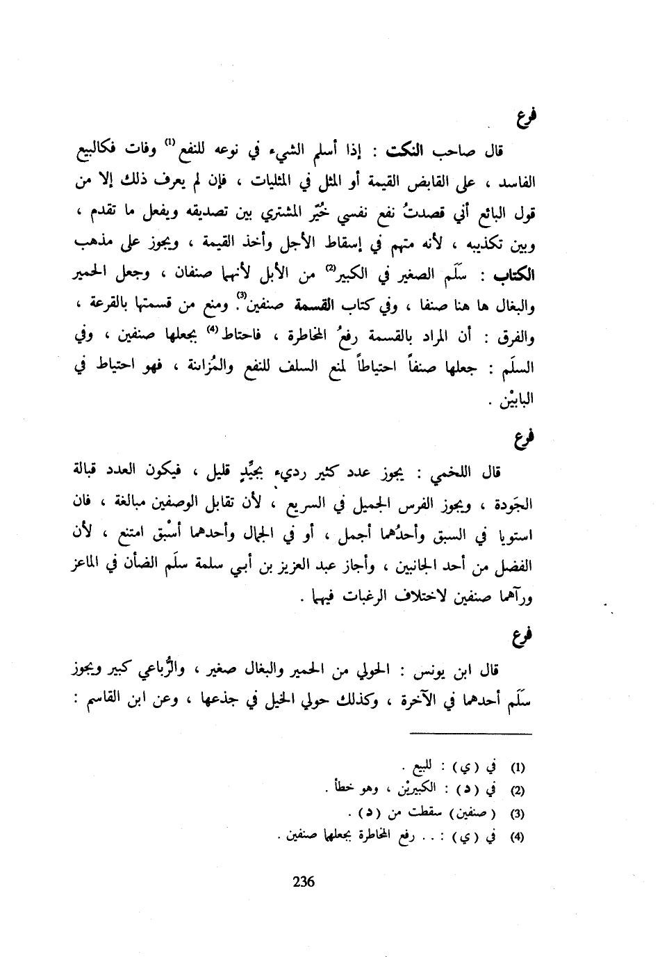 فَرْعٌ قَالَ صَاحِبُ النُّكَتِ: إِذَا أَسْلَمَ الشَّيْءَ فِي نَوْعِهِ لِلنَّفْعِ وَفَاتَ فَكَالْبَيْعِ الْفَاسِدِ عَلَى الْقَابِضِ الْقِيمَةُ أَوِ الْمِثْلُ فِي الْمِثْلِيَّاتِ فَإِنْ لَمْ يُعْرَفْ ذَلِكَ إِلَّا مِنْ قَوْلِ الْبَائِعِ إِنِّي قَصَدْتُ نَفْعَ نَفْسِي خُيِّرَ الْمُشْتَرِي بَيْنَ تَصْدِيقِهِ وَيَفْعَلُ مَا تَقَدَّمَ وَبَيْنَ تَكْذِيبِهِ لِأَنَّهُ مُتَّهَمٌ فِي إِسْقَاطِ الْأَجَلِ وَأَخْذِ الْقِيمَةِ وَيَجُوزُ عَلَى مَذْهَبِ الْكِتَابِ: سَلَمُ الصَّغِيرِ فِي الْكَبِيرِ مِنَ الْإِبِلِ لِأَنَّهُمَا صِنْفَانِ وَجَعَلَ الْحَمِيرَ وَالْبِغَالَ هَاهُنَا صِنْفًا وَفِي كِتَابِ الْقِسْمَةِ صِنْفَيْنِ وَمَنَعَ من قسمتهَا بالقرعى وَمَعَ مِنْ قِسْمَتِهَا بِالْقُرْعَةِ وَالْفَرْقُ أَنَّ الْمُرَادَ بِالْقِسْمَةِ رَفْعُ الْمُخَاطَرَةِ فَاحْتَاطَ بِجَعْلِهَا صِنْفَيْنِ وَفِي السَّلَمِ: جعلهَا صنفا احيتاطياً لمنع السّلف للنفع والمزابنة فَهُوَ أَحَق احْتِيَاطٌ فِي الْبَابَيْنِ