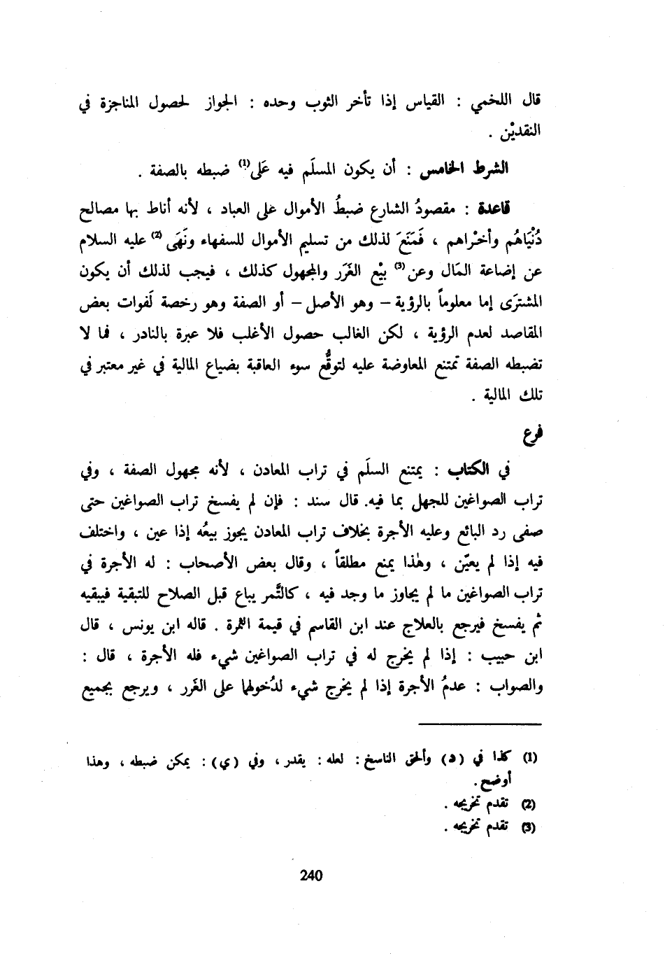 قَالَ اللَّخْمِيُّ: الْقِيَاسُ إِذَا تَأَخَّرَ الثَّوْبُ وَحْدَهُ: الْجَوَازُ لِحُصُولِ الْمُنَاجَزَةِ فِي النَّقْدَيْنِ الشَّرْطُ الْخَامِسُ: أَنْ يَكُونَ الْمُسْلَمُ فِيهِ عَلَى ضَبْطِهِ بِالصِّفَةِ قَاعِدَةٌ مَقْصُودُ الشَّارِعِ ضَبْطُ الْأَمْوَالِ عَلَى الْعِبَادِ لِأَنَّهُ أَنَاطَ بِهَا مَصَالِحَ دُنْيَاهُمْ وَأُخْرَاهُمْ فَمَنَعَ لذَلِك من تَسْلِيم الْأَمْوَال للسفهاء وَنهى - صَلَّى اللَّهُ عَلَيْهِ وَسَلَّم َ - عَن إِ ضاعة الْمَالِ وَعَنْ بَيْعِ الْغَرَرِ وَالْمَجْهُولِ كَذَلِكَ فَيَجِبُ لِذَلِكَ أَنْ يَكُونَ الْمُشْتَرَى إِمَّا مَعْلُومًا بِالرُّؤْيَةِ - وَهُوَ الْأَصْلُ - أَوِ الصِّفَةِ وَهُوَ رُخْصَةٌ لِفَوَاتِ بَعْضِ الْمَقَاصِدِ لِعَدَمِ الرُّؤْيَةِ لَكِنَّ الْغَالِبَ حُصُولُ الْأَغْلَبِ فَلَا عِبْرَةَ بِالنَّادِرِ فَمَا لَا تَضْبُطُهُ الصِّفَةُ تَمْتَنِعُ الْمُعَاوَضَةُ عَلَيْهِ لِتَوَقُّعِ سُوءِ الْعَاقِبَةِ بِضَيَاعِ الْمَالِيَّةِ فِي غَيْرِ مُعْتَبَرٍ فِي تِلْكَ الْمَالِيَّةِ