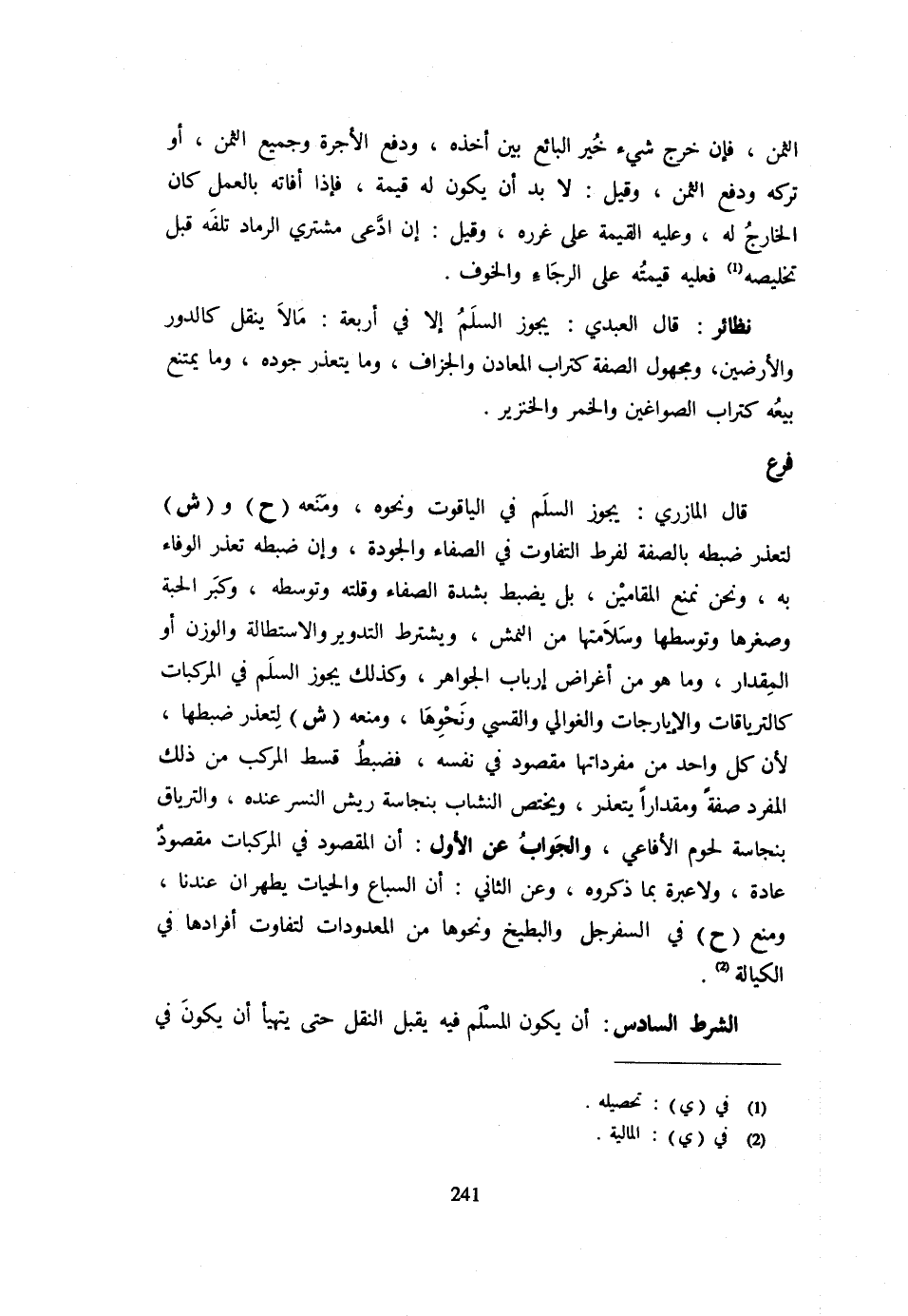 الثَّمَنِ فَإِنْ خَرَجَ شَيْءٌ خُير الْبَائِعُ بَيْنَ أَخْذِهِ وَدَفْعِ الْأُجْرَةِ وَجَمِيعِ الثَّمَنِ أَوْ تَرْكِهِ وَدَفْعِ الثَّمَنِ وَقِيلَ: لَا بُدَّ أَنْ يَكُونَ لَهُ قِيمَةٌ فَإِذَا أَفَاتَهُ بِالْعَمَلِ كَانَ الْخَارِجُ لَهُ وَعَلَيْهِ الْقِيمَةُ عَلَى غَرَرِهِ وَقِيلَ: إِنِ ادَّعَى مُشْتَرِي الرَّمَادِ تَلَفَهُ قَبْلَ تَخْلِيصِهِ فَعَلَيْهِ قِيمَتُهُ عَلَى الرَّجَاءِ وَالْخَوْفِ نَظَائِرُ: قَالَ الْعَبْدِيُّ: يجوز السّلم إِلَّا فِي أَرْبَعَة: مَالا يُنْقَلُ كَالدُّورِ وَالْأَرَضِينَ وَمَجْهُولُ الصِّفَةِ كَتُرَابِ الْمَعَادِنِ والجزاف وَمَا يتَعَذَّر جوده وَمَا يمْتَنع بَيْعُهُ كَتُرَابِ الصَّوَّاغِينَ وَالْخَمْرِ وَالْخِنْزِيرِ