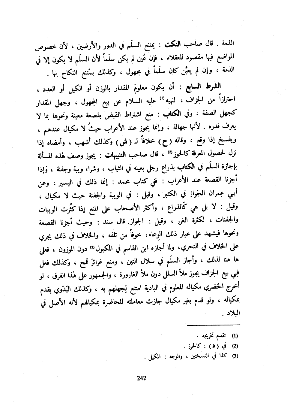 الذِّمَّةِ قَالَ صَاحِبُ النُّكَتِ: يَمْتَنِعُ السَّلَمُ فِي الدُّورِ وَالْأَرَضِينَ لِأَنَّ خُصُوصَ الْمَوَاضِعِ فِيهَا مَقْصُودٌ لِلْعُقَلَاءِ فَإِنْ عُيِّنَ لَمْ يَكُنْ سَلَمًا لِأَنَّ السَّلَمَ لَا يَكُونُ إِلَّا فِي الذِّمَّةِ وَإِنْ لَمْ يُعَيَّنْ كَانَ سَلَمًا فِي مَجْهُولٍ وَكَذَلِكَ يَمْتَنِعُ النِّكَاحُ بِهَا الشَّرْطُ السَّابِعُ: أَنْ يَكُونَ مَعْلُوم الْمِقْدَار بِالْوَزْنِ والكيل أَو الْعدَد احْتِرَازًا من الْجزَاف لنَهْيه - صَلَّى اللَّهُ عَلَيْهِ وَسَلَّم َ - عَن بيع الْمَجْهُول وَجعل الْمِقْدَارِ كَجَهْلِ الصِّفَةِ وَفِي الْكِتَابِ: مَنَعَ اشْتِرَاطَ الْقَبْضِ بِقَصْعَةٍ مُعَيَّنَةٍ وَنَحْوِهَا بِمَا لَا يَعْرِفُ قَدْرَهُ لِأَنَّهَا جَهَالَةٌ وَإِنَّمَا يَجُوزُ عِنْدَ الْأَعْرَابِ حَيْثُ لَا مِكْيَالَ عِنْدَهُمْ وَيَفْسَخُ إِذَا وَقَعَ وَقَالَهُ (ح) خِلَافًا لِ (ش) وَكَذَلِكَ أَشْهَبُ وَأَمْضَاهُ إِذَا نَزَلَ لِحُصُولِ الْمَعْرِفَةِ كَالْحَوْزِ قَالَ صَاحب التَّنْبِيهَات: يجوز وصف هَذَا الْمَسْأَلَةِ بِإِجَازَةِ السَّلَمِ فِي الْكِتَابِ بِذِرَاعِ رَجُلٍ بِعَيْنِهِ فِي الثِّيَابِ وَشِرَاءِ وَيْبَةٍ وَجَفْنَةٍ وَإِذَا أَجَزْنَا الْقَصْعَةَ عِنْدَ الْأَعْرَابِ: فَفِي كِتَابِ مُحَمَّدٍ: إِنَّمَا ذَلِكَ فِي الْيَسِيرِ وَعَنْ أَبِي عِمْرَانَ الْجَوَازُ فِي الْكَثِيرِ وَقِيلَ: فِي الْوَيْبَةِ وَالْجَفْنَةِ حَيْثُ لَا مِكْيَالَ وَقِيلَ: لَا بَلْ هِيَ كَالذِّرَاعِ وَأَكْثَرُ الْأَصْحَابِ عَلَى الْمَنْعِ إِذَا كَثُرَتِ الْوَيْبَاتُ وَالْجَفْنَاتُ لِكَثْرَةِ الْغَرَرِ وَقِيلَ: الْجَوَازُ قَالَ سَنَدٌ: وَحَيْثُ أَجَزْنَا الْقَصْعَةَ وَنَحْوَهَا فَيَشْهَدُ عَلَى عِيَارِ ذَلِكَ الْوِعَاءُ خَوْفًا مِنْ تَلَفِهِ وَالْخِلَافُ فِي ذَلِكَ يَجْرِي عَلَى الْخِلَافِ فِي التَّحَرِّي وَلما أجَازه ابْن الْقَاسِم فِي المكيول دُونَ الْمَوْزُونِ فَعَلَى هَاهُنَا لِذَلِكَ وَأَجَازَ السَّلَمَ فِي سلال التِّين وَمنع غرائز قَمح وَكَذَلِكَ فعل فِي بيع الْجزَاف يجوز مَلأ السلل دون مَلأ الغارورة وَالْجُمْهُور على هَذَا الْفرق لَو أخرج الخضري مِكْيَالَهُ الْمَعْلُومَ فِي الْبَادِيَةِ امْتَنَعَ لِجَهْلِهِمْ بِهِ وَكَذَلِكَ الْبَدَوِيُّ يَقْدَمُ بِمِكْيَالِهِ وَلَوْ قَدِمَ بِغَيْرِ مِكْيَالٍ جَازَتْ مُعَامَلَتُهُ لِلْحَاضِرَةِ بِمِكْيَالِهِمْ لِأَنَّهُ الْأَصْلُ فِي الْبِلَاد