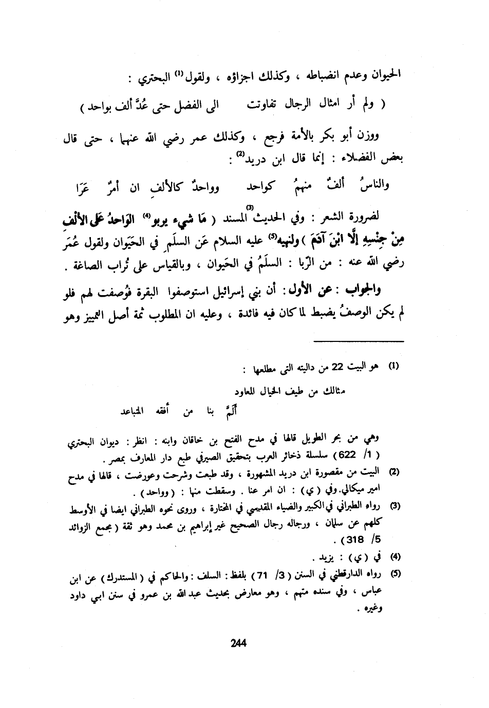 وَوُزِنَ أَبُو بَكْرٍ الْأمة فَرجع وَكَذَلِكَ عُمَرُ رَضِيَ اللَّهُ عَنْهُمَا حَتَّى قَالَ بَعْضُ الْفُضَلَاءِ إِنَّمَا قَالَ ابْنُ دُرَيْدٍ