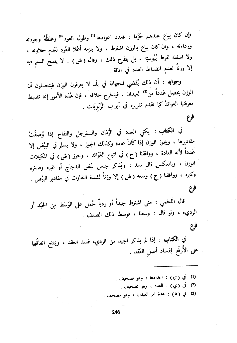 فَرْعٌ فِي الْكِتَابِ: يَكْفِي الْعَدَدُ فِي الرُّمَّانِ وَالسَّفَرْجَلِ وَالتُّفَّاحِ إِذَا وُصِفَتْ مَقَادِيرُهَا وَيَجُوزُ الْوَزْنُ إِذَا كَانَ عَادَةً وَكَذَلِكَ الْجَوْزُ وَلَا يُسْلِمُ فِي الْبَيْضِ إِلَّا عَدَدًا لِأَنَّهُ الْعَادَةُ وَوَافَقَنَا (ح) فِي اتِّبَاعِ الْعَوَائِدِ وَجَوَّزَ (ش) فِي الْمَكِيلَاتِ الْوَزْنَ وَبِالْعَكْسِ قَالَ سَنَدٌ: وَيُذْكَرُ جِنْسُ بَيْضِ الدَّجَاجِ أَوْ غَيْرِهِ وَصِغَرِهِ وَكِبَرِهِ وَوَافَقَنَا (ح) وَمَنَعَهُ (ش) إِلَّا وَزْنًا لِشِدَّةِ التَّفَاوُتِ فِي مَقَادِيرِ الْبَيْضِ