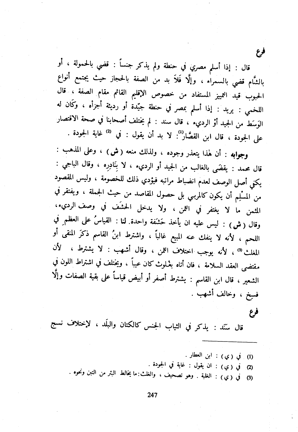 فَرْعٌ قَالَ: إِذَا أَسْلَمَ مِصْرِيٌّ فِي حِنْطَةٍ لَمْ يَذْكُرْ جِنْسًا: قُضِيَ بِالْحَمُولَةِ أَوْ بِالشَّامِ قُضِيَ بِالسَّمْرَاءِ وَإِلَّا فَلَا بُدَّ مِنَ الصِّفَةِ بالحجار حَيْثُ يجْتَمع أَنْوَاع الْحُبُوب قيد التَّمْيِيزُ الْمُسْتَفَادُ مِنْ خُصُوصِ الْإِقْلِيمِ الْقَائِمِ مَقَامَ الصِّفَةِ قَالَ اللَّخْمِيُّ: يُرِيدُ: إِذَا أَسْلَمَ بِمِصْرَ فِي حِنْطَةٍ جَيِّدَةٍ أَوْ رَدِيئَةٍ أَجْزَأَهُ وَكَانَ لَهُ الْوَسَطُ مِنَ الْجَيِّدِ أَوِ الرَّدِيءِ قَالَ سَنَدٌ: لَمْ يَخْتَلِفْ أَصْحَابُنَا فِي صِحَّةِ الِاقْتِصَارِ على الْجَوْدَة قَالَ ابْنُ الْقَصَّارِ: لَا بُدَّ أَنْ يَقُولَ: فِي غَايَةِ الْجَوْدَةِ وَجَوَابُهُ: أَنَّ هَذَا يَتَعَذَّرُ وُجُودُهُ وَلِذَلِكَ مَنَعَهُ (ش) وَعَلَى الْمَذْهَبِ: قَالَ مُحَمَّدٌ: يُقْضَى بِالْغَالِبِ مِنَ الْجَيِّدِ أَوِ الرَّدِيءِ لَا بِنَادِرِهِ وَقَالَ الْبَاجِيُّ: يَكْفِي أَصْلُ الْوَصْفِ لِعَدَمِ انْضِبَاطِ مَرَاتِبِهِ فَيُؤَدِّي ذَلِكَ لِلْخُصُومَةِ وَلَيْسَ الْمَقْصُودُ من الْمُسلم أَن يكون كالمربي بل حُصُول الْمَقَاصِد من حَيْثُ الْجُمْلَة ويفتقر فِي الْمُثَمَّنِ مَا لَا يُغْتَفَرُ فِي الثَّمَنِ وَلَا يَدْخُلُ الْحَشَفُ فِي وَصْفِ الرَّدِيءِ وَقَالَ (ش) : لَيْسَ عَلَيْهِ أَنْ يَأْخُذَ حَشَفَةً وَاحِدَةً لنا: الْقِيَاسَ عَلَى الْعَظْمِ فِي اللَّحْمِ لِأَنَّهُ لَا يَنْفَكُّ عَنْهُ الْمَبِيعُ غَالِبًا وَاشْتَرَطَ ابْنُ الْقَاسِمِ ذكر المنفى أَوِ الْمُغَلَّثِ لِأَنَّهُ يُوجِبُ اخْتِلَافَ الثَّمَنِ وَقَالَ أَشْهَبُ: لَا يُشْتَرَطُ لِأَنَّ مُقْتَضَى الْعَقْدِ السَّلَامَةُ فَإِنْ أَتَاهُ بَغَلُوثٍ كَانَ عَيْبًا وَيُخْتَلَفُ فِي اشْتِرَاطِ اللَّوْنِ فِي الشَّعِيرِ قَالَ ابْنُ الْقَاسِمِ: يَشْتَرِطُ أَصْفَرَ أَوْ أَبْيَضَ قِيَاسًا عَلَى بَقِيَّةِ الصِّفَاتِ وَإِلَّا فُسِخَ وَخَالَفَ أَشْهَبُ