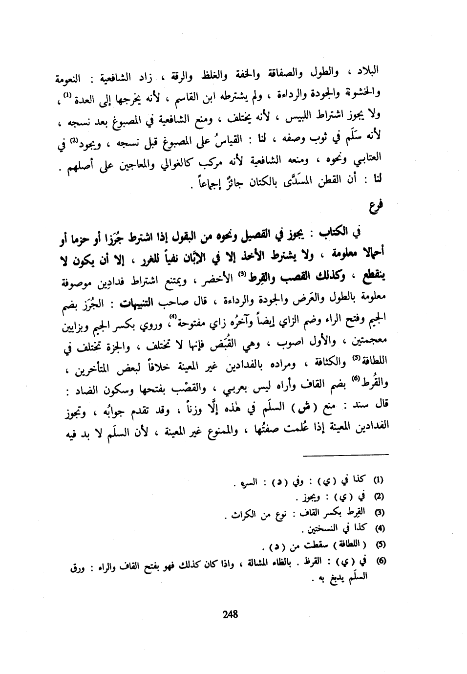 الْبِلَاد والطول الصفاقة وَالْخِفَّةَ وَالْغِلَظَ وَالرِّقَّةَ زَادَ الشَّافِعِيَّةُ: النُّعُومَةَ وَالْخُشُونَةَ والجودة والرداءة وَلم يشْتَرط ابْن الْقَاسِم لِأَنَّهُ يُخرجهَا إِلَى الْعدة وَلَا يَجُوزُ اشْتِرَاطُ اللَّبِيسِ لِأَنَّهُ يَخْتَلِفُ وَمَنَعَ الشَّافِعِيَّة فِي الصبوغ بَعْدَ نَسْجِهِ لِأَنَّهُ سَلَمٌ فِي ثَوْبٍ وَصِفَةٍ لَنَا: الْقِيَاسُ عَلَى الْمَصْبُوغِ قَبْلَ نَسْجِهِ وَيَجُودُ فِي الْعَتَّابِيِّ وَنَحْوِهِ وَمَنَعَهُ الشَّافِعِيَّةُ لِأَنَّهُ مُرَكَّبٌ كَالْغَوَالِي وَالْمَعَاجِينِ عَلَى أَصْلِهِمْ لَنَا: أَنَّ الْقُطْنَ الْمُسَدَّى بِالْكَتَّانِ جَائِزٌ إِجْمَاعًا