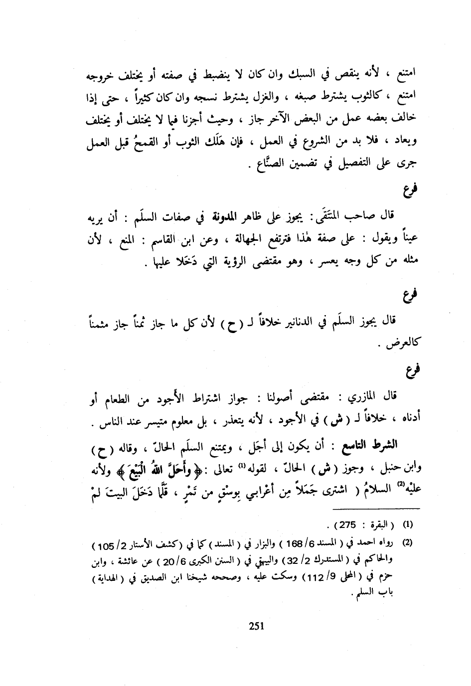 الشَّرْطُ التَّاسِعُ: أَنْ يكون إِلَى أجل وَيمْتَنع السّلم الْحَال وَقَالَهُ (ح) وَابْنُ حَنْبَلٍ وَجَوَّزَ (ش) الْحَالَّ لقَوْله تَعَالَى {وَأحل الله البيع} وَلِأَنَّهُ - صَلَّى اللَّهُ عَلَيْهِ وَسَلَّم َ - (اشْتَرَى جَمَلًا مِنْ أَعْرَابِيٍّ بوسقٍ مِنْ تمرٍ قَلما دخل الْبَيْت لم