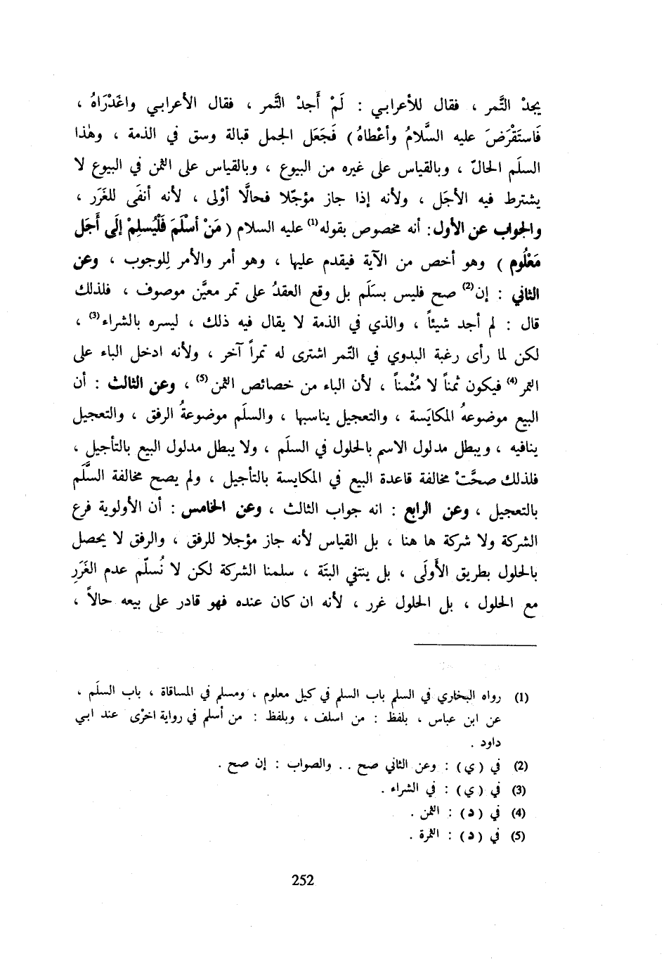 يجد التَّمْر فَقَالَ الْأَعرَابِي: لَمْ أَجِدِ التَّمْرَ فَقَالَ الْأَعْرَابِيُّ وَاغَدْرَاهُ فَاسْتَقْرَضَ - صَلَّى اللَّهُ عَلَيْهِ وَسَلَّم َ - صَلَّى اللَّهُ عَلَيْهِ وَسَلَّم َ - وَأَعْطَاهُ) فَجَعَلَ الْجَمَلَ قُبَالَةَ وَسْقٍ فِي الذِّمَّةِ وَهَذَا السَّلَمُ الْحَالُّ وَبِالْقِيَاسِ عَلَى غَيْرِهِ مِنَ الْبُيُوعِ وَبِالْقِيَاسِ عَلَى الثَّمَنِ فِي الْبُيُوعِ لَا يُشْتَرَطُ فِيهِ الْأَجَلُ وَلِأَنَّهُ إِذَا جَازَ مُؤَجَّلًا فَحَالًّا أَوْلَى لِأَنَّهُ أَنْفَى لِلْغَرَرِ وَالْجَوَابُ عَنِ الأول: أَنه مَخْصُوص بقوله - صَلَّى اللَّهُ عَلَيْهِ وَسَلَّم َ - (مَنْ أَسْلَمَ فَلْيُسْلِمْ إِلَى أَجَلٍ مَعْلُومٍ) وَهُوَ أَخَصُّ مِنَ الْآيَةِ فَيُقَدَّمُ عَلَيْهَا وَهُوَ أَمْرٌ وَالْأَمْرُ لِلْوُجُوبِ وَعَنِ الثَّانِي: إِنْ صَحَّ فَلَيْسَ بِسَلَمٍ بَلْ وَقَعَ الْعَقْدُ عَلَى تَمْرٍ مُعَيَّنٍ مَوْصُوفٍ فَلِذَلِكَ قَالَ: لَمْ أَجِدْ شَيْئًا وَالَّذِي فِي الذِّمَّةِ لَا يُقَالُ فِيهِ ذَلِكَ لِيُسْرِهِ بِالشِّرَاءِ لَكِنْ لَمَّا رَأَى رَغْبَةَ الْبَدَوِيِّ فِي التَّمْرِ اشْتَرَى لَهُ تَمْرًا آخَرَ وَلِأَنَّهُ أَدْخَلَ الْبَاءَ عَلَى التَّمْرِ فَيَكُونُ ثَمَنًا لَا مُثْمَنًا لِأَنَّ الْبَاءَ مِنْ خَصَائِصِ الثَّمَنِ وَعَنِ الثَّالِثِ: أَنَّ الْبَيْعَ مَوْضُوعُهُ الْمُكَايَسَةُ وَالتَّعْجِيلُ يُنَاسِبُهَا وَالسَّلَمَ مَوْضُوعُهُ الرِّفْقُ وَالتَّعْجِيلُ يُنَافِيهِ وَيَبْطُلُ مَدْلُولُ الِاسْمِ بِالْحُلُولِ فِي السَّلَمِ وَلَا يَبْطُلُ مَدْلُولُ الْبَيْعِ بِالتَّأْجِيلِ فَلِذَلِكَ صَحَّتْ مُخَالَفَةُ قَاعِدَةِ الْبَيْعُ فِي الْمُكَايَسَةِ بِالتَّأْجِيلِ وَلَمْ يَصِحَّ مُخَالَفَةُ السَّلَمِ بِالتَّعْجِيلِ وَعَنِ الرَّابِعِ: أَنَّهُ جَوَابُ الثَّالِثِ وَعَنِ الْخَامِسِ: أَنَّ الْأَوَّلَوِيَّةَ فَرْعُ الشَّرِكَةِ وَلَا شَرِكَةَ هَاهُنَا بَلِ الْقِيَاسُ لِأَنَّهُ جَازَ مُؤَجَّلًا لِلرِّفْقِ وَالرِّفْقُ لَا يَحْصُلُ بِالْحُلُولِ بِطَرِيقِ الْأَوْلَى بَلْ يَنْتَفِي أَلْبَتَّةَ سَلَّمْنَا الشَّرِكَةَ لَكَنْ لَا نُسلم عَدَمَ الْغَرَرِ مَعَ الْحُلُولِ بَلِ الْحُلُولُ غَرَرٌ لِأَنَّهُ إِنْ كَانَ عِنْدَهُ فَهُوَ قَادِرٌ عَلَى بَيْعِهِ حَالا