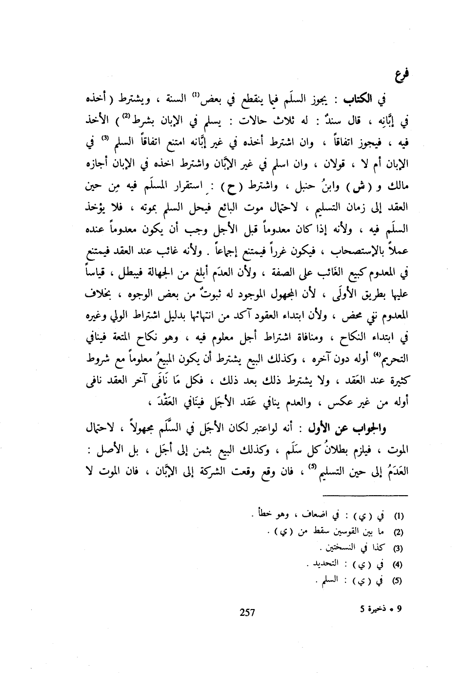 فَرْعٌ فِي الْكِتَابِ: يَجُوزُ السَّلَمُ فِيمَا يَنْقَطِعُ فِي بَعْضِ السَّنَةِ وَيُشْتَرَطُ (أَخْذُهُ فِي إِبَّانِهِ قَالَ سَنَدٌ: لَهُ ثَلَاثُ حَالَاتٍ: يُسَلَّمُ فِي الْإِبَّانِ بِشَرْطِ) الْأَخْذِ فِيهِ فَيَجُوزُ اتِّفَاقًا وَإِنِ اشْتَرَطَ أَخَذَهُ فِي غَيْرِ إِبَّانِهِ امْتَنَعَ اتِّفَاقًا السّلم فِي الإبان أم لَا قَولَانِ وَإِن أسلم فِي غير الإبان وَاشْتَرَطَ أَخْذَهُ فِي الْإِبَّانِ أَجَازَهُ مَالِكٌ و (ش) وَابْنُ حَنْبَلٍ وَاشْتَرَطَ (ح) : اسْتِقْرَارَ الْمُسْلَمِ فِيهِ مِنْ حِينِ الْعَقْدِ إِلَى زَمَانِ التَّسْلِيمِ لِاحْتِمَالِ مَوْتِ الْبَائِعِ فَيَحِلُّ السَّلَمُ بِمَوْتِهِ فَلَا يُؤْخَذ السّلم فِيهِ وَلِأَنَّهُ إِذَا كَانَ مَعْدُومًا قَبْلَ الْأَجَلِ وَجَبَ أَنْ يَكُونَ مَعْدُومًا عِنْدَهُ عَمَلًا بِالِاسْتِصْحَابِ فَيَكُونُ غَرَرًا فَيَمْتَنِعُ إِجْمَاعًا وَلِأَنَّهُ غَائِبٌ عِنْدَ الْعَقْدِ فَيَمْتَنِعُ فِي الْمَعْدُومِ كَبَيْعِ الْغَائِبِ عَلَى الصِّفَةِ وَلِأَنَّ الْعَدَمَ أَبْلَغُ مِنَ الْجَهَالَةِ فَيَبْطُلُ قِيَاسًا عَلَيْهَا بِطَرِيقِ الْأَوْلَى لِأَنَّ الْمَجْهُولَ الْمَوْجُودَ لَهُ ثُبُوتٌ مِنْ بَعْضِ الْوُجُوهِ بِخِلَافِ الْمَعْدُومِ نَفْيٌ مَحْضٌ وَلِأَنَّ ابْتِدَاءَ الْعُقُودِ آكَدُ مِنِ انْتِهَائِهَا بِدَلِيلِ اشْتِرَاطِ الْوَلِيِّ وَغَيْرِهِ فِي ابْتِدَاءِ النِّكَاحِ وَمُنَافَاةِ اشْتِرَاطِ أَجَلٍ مَعْلُومٍ فِيهِ وَهُوَ نِكَاحُ الْمُتْعَةِ فَيُنَافِي التَّحْرِيمَ أَوَّلُهُ دُونَ آخِرِهِ وَكَذَلِكَ الْبَيْعُ يُشْتَرَطُ أَنْ يَكُونَ الْمَبِيعُ مَعْلُومًا مَعَ شُرُوطٍ كَثِيرَةٍ عِنْدَ الْعَقْدِ وَلَا يُشْتَرَطُ ذَلِكَ بَعْدَ ذَلِكَ فَكُلُّ مَا نَافَى آخِرَ الْعَقْدِ نَافَى أَوَّلَهُ مِنْ غَيْرِ عَكْسٍ وَالْعَدَمُ يُنَافِي عَقْدَ الْأَجَلِ فَيُنَافِي الْعَقْدَ وَالْجَوَابُ عَنِ الْأَوَّلِ: أَنَّهُ لَوِ اعْتُبِرَ لَكَانَ الْأَجَلُ فِي السَّلَمِ مَجْهُولًا لِاحْتِمَالِ الْمَوْتِ فَيَلْزَمُ بُطْلَانُ كُلِّ سَلَمٍ وَكَذَلِكَ الْبَيْعُ بِثَمَنٍ إِلَى أَجَلٍ بَلِ الْأَصْلُ: الْعَدَمُ إِلَى حِينِ التَّسْلِيمِ فَإِنْ وَقَعَ وَقَعَتِ الشَّرِكَةُ إِلَى الْإِبَّانِ فَإِنَّ الْمَوْتَ لَا