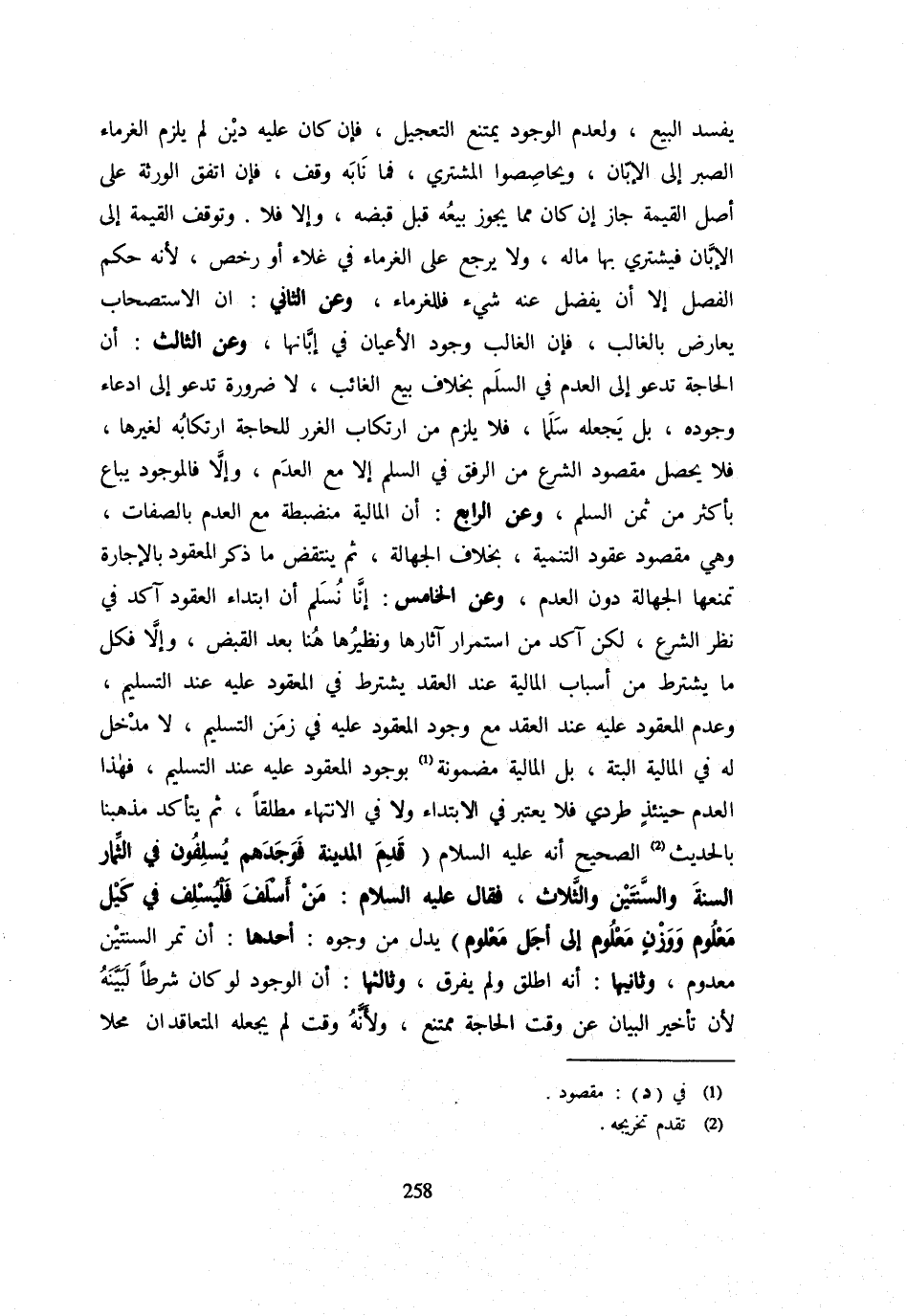 يُفْسِدُ الْبَيْعَ وَلِعَدَمِ الْوُجُودِ يَمْتَنِعُ التَّعْجِيلُ فَإِنْ كَانَ عَلَيْهِ دَيْنٌ لَمْ يَلْزَمِ الْغُرَمَاءَ الصَّبْرُ إِلَى الْإِبَّانِ وَيُحَاصِصُوا الْمُشْتَرِيَ فَمَا نَابَهُ وَقَفَ فَإِن اتّفق الْوَرَثَةِ عَلَى أَصْلِ الْقِيمَةِ جَازَ إِنْ كَانَ مِمَّا يَجُوزُ بَيْعُهُ قَبْلَ قَبْضِهِ وَإِلَّا فَلَا وَتُوقَفُ الْقِيمَةُ إِلَى الْإِبَّانِ فَيَشْتَرِي بِهَا مَالَهُ وَلَا يَرْجِعُ عَلَى الْغُرَمَاءِ فِي غَلَاءٍ أَوْ رُخْصٍ لِأَنَّهُ حُكْمُ الْفَصْلِ إِلَّا أَنْ يَفْضُلَ عَنْهُ شَيْءٌ فَلِلْغُرَمَاءِ وَعَنِ الثَّانِي: أَنَّ الِاسْتِصْحَابَ يُعَارَضُ بِالْغَالِبِ فَإِنَّ الْغَالِبَ وُجُودُ الْأَعْيَانِ فِي إِبَّانِهَا وَعَنِ الثَّالِثِ: أَنَّ الْحَاجَةَ تَدْعُو إِلَى الْعَدَمِ فِي السَّلَمِ بِخِلَافِ بَيْعِ الْغَائِبِ لَا ضَرُورَةَ تَدْعُو إِلَى ادِّعَاءِ وَجُودِهِ بَلْ يَجْعَلُهُ سَلَمًا فَلَا يَلْزَمُ مِنَ ارْتِكَابِ الْغَرَرِ لِلْحَاجَةِ ارْتِكَابُهُ لِغَيْرِهَا فَلَا يَحْصُلُ مَقْصُودُ الشَّرْعِ مِنَ الرِّفْقِ فِي السَّلَمِ إِلَّا مَعَ الْعَدَمِ وَإِلَّا فَالْمَوْجُودُ يُبَاعُ بِأَكْثَرَ مِنْ ثَمَنِ السَّلَمِ وَعَنِ الرَّابِعِ: أَنَّ الْمَالِيَّةَ مُنْضَبِطَةٌ مَعَ الْعَدَمِ بِالصِّفَاتِ وَهِيَ مَقْصُودُ عُقُودِ التَّنْمِيَةِ بِخِلَافِ الْجَهَالَةِ ثُمَّ ينْتَقض مَا ذكر الْمَعْقُود بِالْإِجَارَةِ تَمْنَعُهَا الْجَهَالَةُ دُونَ الْعَدَمِ وَعَنِ الْخَامِسِ: أَنَّا نُسَلِّمُ أَنَّ ابْتِدَاءَ الْعَقْدِ آكَدُ فِي نَظَرِ الشَّرْعِ لَكَنْ آكَدُ مِنَ اسْتِمْرَارِ آثَارِهَا وَنَظِيرُهَا هُنَا بَعْدَ الْقَبْضِ وَإِلَّا فَكُلُّ مَا يُشْتَرَطُ مِنْ أَسْبَابِ الْمَالِيَّةِ عِنْدَ الْعَقْدِ يُشْتَرَطُ فِي الْمَعْقُودِ عَلَيْهِ عِنْدَ التَّسْلِيمِ وَعَدَمُ الْمَعْقُودِ عَلَيْهِ عِنْدَ الْعَقْدِ مَعَ وُجُودِ الْمَعْقُودِ عَلَيْهِ فِي زَمَنِ التَّسْلِيمِ لَا مَدْخَلَ لَهُ فِي الْمَالِيَّةِ أَلْبَتَّةَ بَلِ الْمَالِيَّةُ مَضْمُونَةٌ بِوُجُودِ الْمَعْقُودِ عَلَيْهِ عِنْدَ التَّسَلُّمِ فَهَذَا الْعَدَمُ حينئذٍ طَرْدِيٌّ فَلَا يُعْتَبَرُ فِي الِابْتِدَاءِ وَلَا فِي الِانْتِهَاءِ مُطْلَقًا ثُمَّ يَتَأَكَّدُ مَذْهَبُنَا بِالْحَدِيثِ الصَّحِيحِ أَنَّهُ - صَلَّى اللَّهُ عَلَيْهِ وَسَلَّم َ - (قدِم الْمَدِينَةَ فَوَجَدَهُمْ يُسلفون فِي الثِّمَارِ السَّنَةَ والسنتين وَالثَّلَاث فَقَالَ - صَلَّى اللَّهُ عَلَيْهِ وَسَلَّم َ -: مَنْ أَسْلَفَ فَلْيُسْلِفْ فِي كَيْلٍ مَعْلُومٍ ووزنٍ مَعْلُومٍ إِلَى أَجَلٍ مَعْلُومٍ) يَدُلُّ مِنْ وُجُوهٍ: أَحدهَا: أَن تمر السَّنَتَيْنِ مَعْدُومٌ وَثَانِيهَا: أَنَّهُ أَطْلَقَ وَلَمْ يُفَرِّقْ وَثَالِثِهَا: أَنَّ الْوُجُودَ لَوْ كَانَ شَرْطًا لَبَيَّنَهُ لِأَنَّ تَأْخِيرَ الْبَيَانِ عَنْ وَقْتِ الْحَاجَةِ مُمْتَنِعٌ وَلِأَنَّهُ وَقْتٌ لَمْ يَجْعَلْهُ الْمُتَعَاقِدَانِ مَحَلًّا