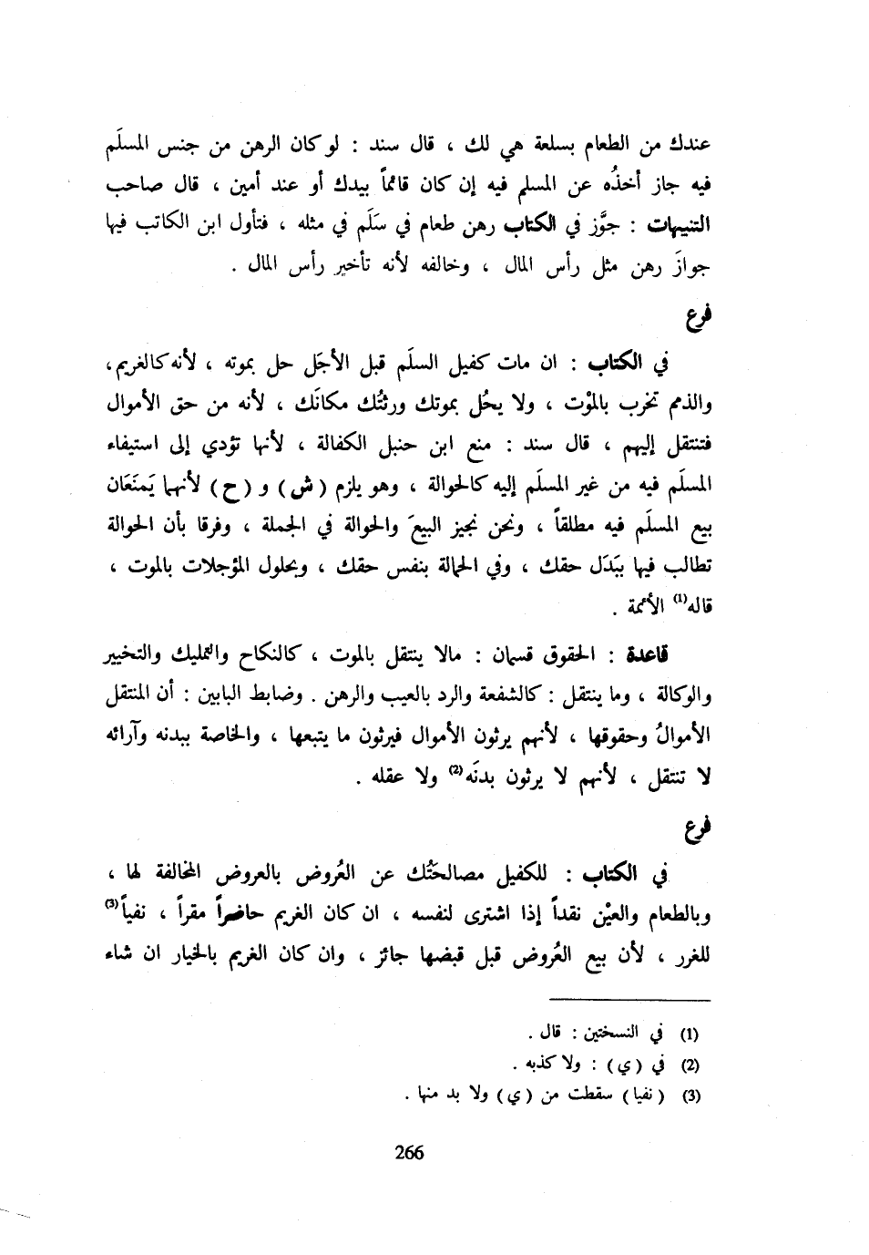 فَرْعٌ فِي الْكِتَابِ إِنْ مَاتَ كَفِيلُ السَّلَمِ قَبْلَ الْأَجَلِ حَلَّ بِمَوْتِهِ لِأَنَّهُ كَالْغَرِيمِ وَالذِّمَمُ تَخْرَبُ بِالْمَوْتِ وَلَا يَحُلُّ بِمَوْتِكَ وَرَثَتُكَ مَكَانَكَ لِأَنَّهُ مِنْ حَقِّ الْأَمْوَالِ فَتَنْتَقِلُ إِلَيْهِمْ قَالَ سَنَدٌ مَنَعَ ابْنُ حَنْبَلٍ الْكَفَالَةَ لِأَنَّهَا تُؤَدِّي إِلَى اسْتِيفَاءِ الْمُسْلَمِ فِيهِ مِنْ غَيْرِ الْمُسْلَمِ إِلَيْهِ كَالْحَوَالَةِ وَهُوَ يَلْزَمُ (ش) و (ح) لِأَنَّهُمَا يَمْنَعَانِ بَيْعَ الْمُسْلَمِ فِيهِ مُطْلَقًا وَنَحْنُ نُجِيزُ الْبَيْعَ وَالْحَوَالَةَ فِي الْجُمْلَةِ وَفَرَّقَا بِأَنَّ الْحَوَالَةَ تُطَالِبُ فِيهَا بِبَدَلِ حَقِّكَ وَفِي الْحِمَالَةِ بِنَفْسِ حَقِّكَ وَبِحُلُولِ الؤجلات بِالْمَوْتِ قَالَه الْأَئِمَّة قَاعِدَة الْحُقُوق قِسْمَانِ مَالا يَنْتَقِلُ بِالْمَوْتِ كَالنِّكَاحِ وَالتَّمْلِيكِ وَالتَّخْيِيرِ وَالْوَكَالَةِ وَمَا يَنْتَقِلُ كَالشُّفْعَةِ وَالرَّدِّ بِالْعَيْبِ وَالرَّهْنِ وَضَابِطُ الْبَابَيْنِ أَنَّ الْمُنْتَقِلَ الْأَمْوَالُ وَحُقُوقُهَا لِأَنَّهُمْ يَرِثُونَ الْأَمْوَالَ فيرثون مَا يتبعهَا والخاصة بِبدنِهِ وآرائه قَالَ لَا تَنْتَقِلُ لِأَنَّهُمْ لَا يَرِثُونَ بَدَنَهُ وَلَا عَقْلَهُ