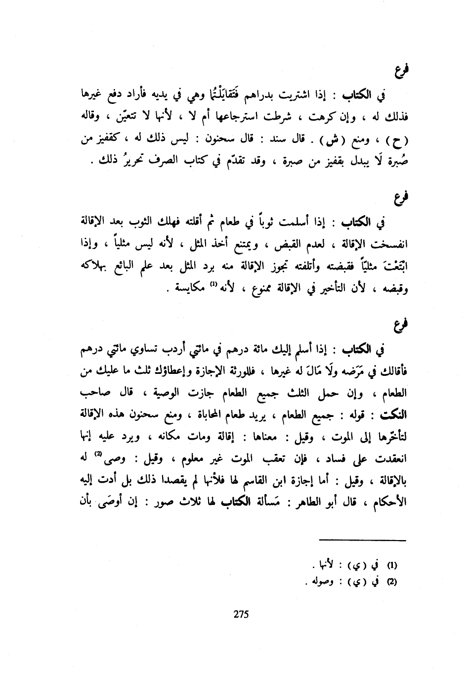 فَرْعٌ فِي الْكِتَابِ: إِذَا أَسْلَمَ إِلَيْكَ مِائَةَ دِرْهَمٍ فِي مِائَتَيْ إِرْدَبٍّ تُسَاوِي مِائَتَيْ دِرْهَمٍ فَأَقَالَكَ: فِي مَرَضِهِ وَلَا مَالَ لَهُ غَيْرُهَا فَلِلْوَرَثَةِ الْإِجَازَةُ وَإِعْطَاؤُكَ ثُلُثَ مَا عَلَيْكَ مِنَ الطَّعَامِ وَإِنْ حَمَلَ الثُّلُثُ جَمِيعَ الطَّعَامِ جَازَتِ الْوَصِيَّةُ قَالَ صَاحِبُ النُّكَتِ: قَوْلُهُ: جَمِيعُ الطَّعَامِ يُرِيدُ طَعَامَ الْمُحَابَاةِ وَمَنَعَ سَحْنُونٌ هَذِهِ الْإِقَالَةَ لِتَأَخُّرِهَا إِلَى الْمَوْتِ وَقِيلَ: مَعْنَاهَا: أَقَالَهُ وَمَاتَ مَكَانَهُ وَيُرَدُّ عَلَيْهِ أَنَّهَا انْعَقَدَتْ عَلَى فَسَاد فَإِن تعقب الْمَوْت غَيْرِ مَعْلُومٍ وَقِيلَ: وَصَّى لَهُ بِالْإِقَالَةِ وَقِيلَ: أما إجَازَة ابْن الْقَاسِم لَهَا فَلِأَنَّهَا لَمْ يَقْصِدَا ذَلِكَ بَلْ أَدَّتْ إِلَيْهِ الْأَحْكَامُ قَالَ أَبُو الطَّاهِرِ: مَسْأَلَةُ الْكِتَابِ لَهَا ثَلَاثُ صُوَرٍ: إِنْ أَوْصَى بِأَنْ