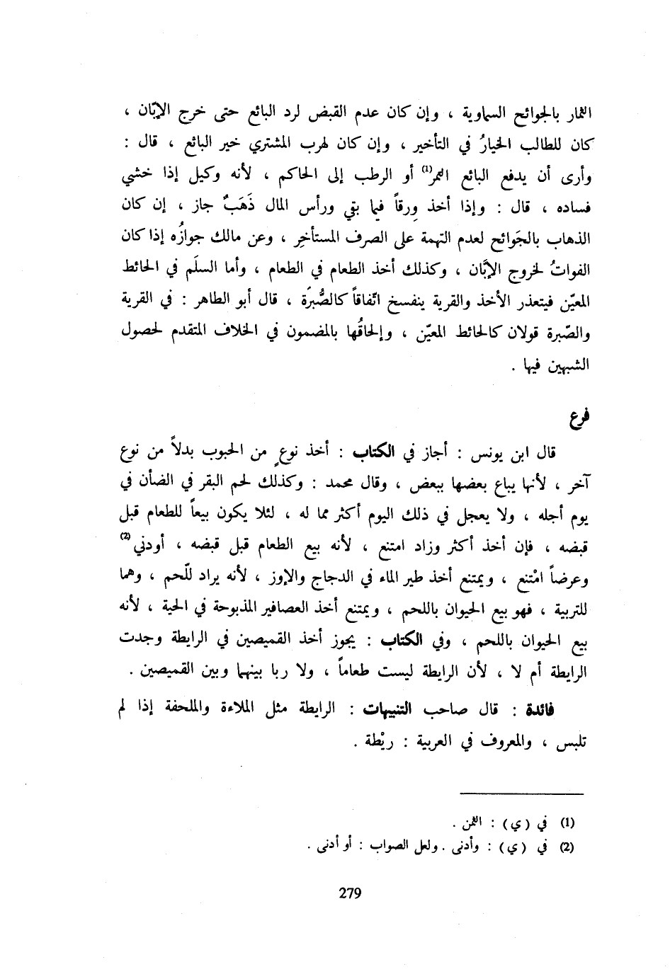 فَرْعٌ قَالَ ابْنُ يُونُسَ: أَجَازَ فِي الْكِتَابِ: أَخْذَ نَوْعٍ مِنَ الْحُبُوبِ بَدَلًا مِنْ نَوْعٍ آخَرَ لِأَنَّهَا يُبَاعُ بَعْضُهَا بِبَعْضٍ وَقَالَ مُحَمَّدٌ: وَكَذَلِكَ لَحَمُ الْبَقَرِ فِي الضَّأْنِ فِي يَوْمِ أَجْلِهِ وَلَا يعجل فِي ذَلِك الْيَوْم اكثر مَا لَهُ لِئَلَّا يَكُونَ بَيْعًا لِلطَّعَامِ قَبْلَ قَبْضِهِ فَإِنْ أَخَذَ أَكْثَرَ وَزَادَ امْتَنَعَ لِأَنَّهُ بَيْعُ الطَّعَام قبل قَبضه أَو دنى وَعَرْضًا امْتَنَعَ وَيَمْتَنِعُ أَخْذُ طَيْرِ الْمَاءِ فِي الدَّجَاجِ وَالْإِوَزِّ لِأَنَّهُ يُرَادُ لِلِّحْمِ وَهُمَا لِلتَّرْبِيَةِ فَهُوَ بيع الْحَيَوَان بِاللَّحْمِ وَيمْتَنع أَخذ الْعَصَافِيرَ الْمَذْبُوحَةَ فِي الْحَيَّةِ لِأَنَّهُ بَيْعُ الْحَيَوَانِ بِاللَّحْمِ وَفِي الْكِتَابِ: يَجُوزُ أَخْذُ الْقَمِيصَيْنِ فِي الرَّايِطَةِ وُجِدَتِ الرَّايِطَةُ أَمْ لَا لِأَنَّ الرَّايِطَةَ لَيست طَعَاما وَلَا رَبًّا بَينهمَا وَبَين القميصين فَائِدَة: قَالَ صَاحب التَّنْبِيهَات: الرابطة مِثْلَ الْمُلَاءَةِ وَالْمِلْحَفَةِ إِذَا لَمْ تُلْبَسْ وَالْمَعْرُوفُ فِي الْعَرَبيَّة: ريْطة