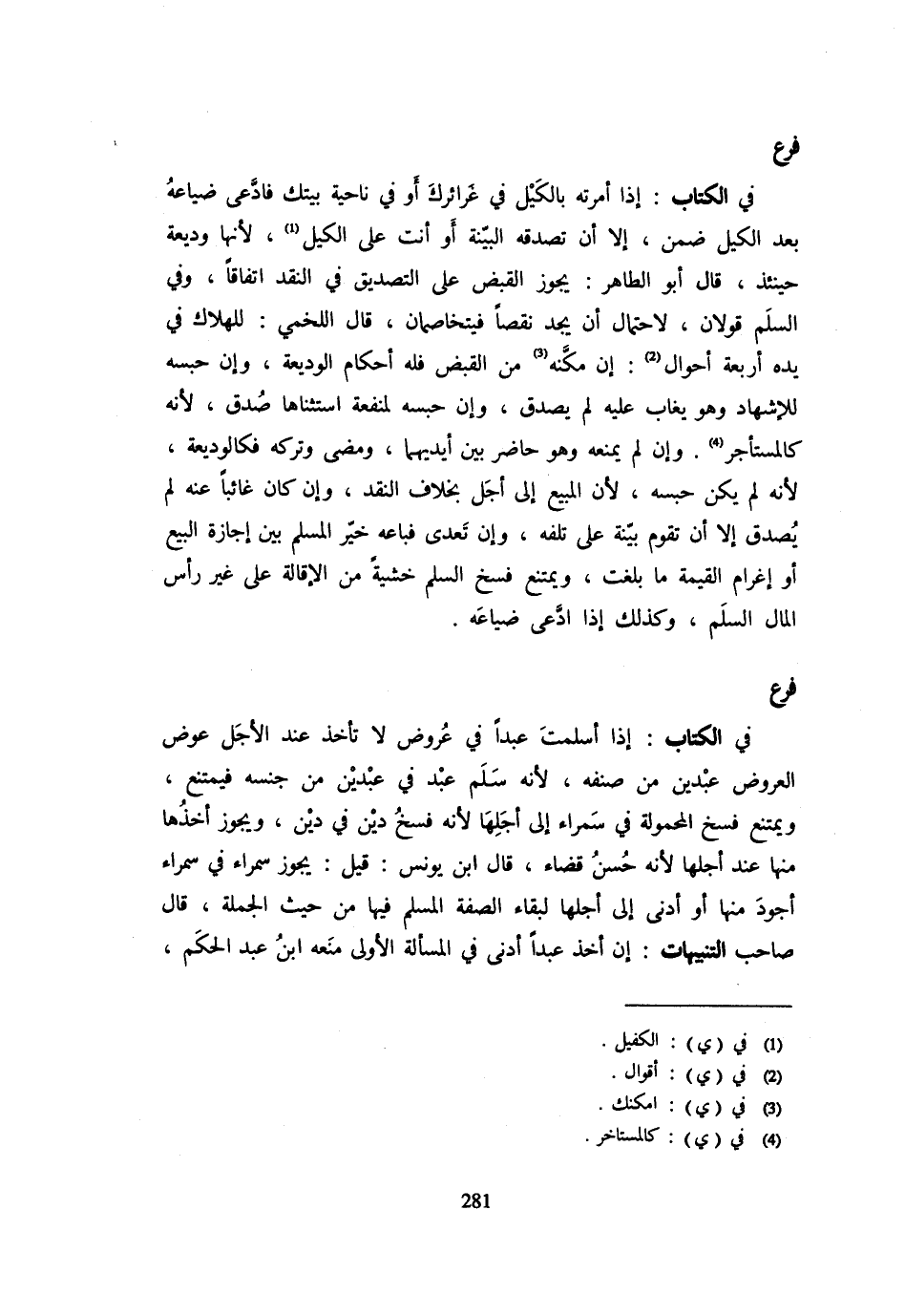 فَرْعٌ فِي الْكِتَابِ: إِذَا أَمَرْتَهُ بِالْكَيْلِ فِي غَرَائِرِكَ أَوْ فِي نَاحِيَةِ بَيْتِكَ فَادَّعَى ضَيَاعَهُ بَعْدَ الْكَيْلِ ضَمِنَ إِلَّا أَنْ تُصَدِّقَهُ الْبَيِّنَةُ أَوْ أَنْتَ عَلَى الْكَيْلِ لِأَنَّهَا وَدِيعَةٌ حِينَئِذٍ قَالَ أَبُو الطَّاهِرِ: يَجُوزُ الْقَبْضُ عَلَى التَّصْدِيقِ فِي النَّقْدِ اتِّفَاقًا وَفِي السَّلَمِ قَوْلَانِ لِاحْتِمَالِ أَنْ يَجِدَ نَقْصًا فَيَتَخَاصَمَانِ قَالَ اللَّخْمِيُّ: لِلْهَلَاكِ فِي يَدِهِ أَرْبَعَةُ أَحْوَالٍ: إِنْ مَكَّنَهُ مِنَ الْقَبْضِ فَلَهُ أَحْكَامُ الْوَدِيعَةِ وَإِنْ حَبَسَهُ لِلْإِشْهَادِ وَهُوَ يُغَابُ عَلَيْهِ لَمْ يُصَدَّقْ وَإِنْ حَبَسَهُ لِمَنْفَعَةٍ اسْتَثْنَاهَا صُدق لِأَنَّهُ كَالْمُسْتَأْجِرِ وَإِنْ لَمْ يَمْنَعْهُ وَهُوَ حَاضِرٌ بَيْنَ أَيْدِيهِمَا وَمَضَى وَتَرَكَهُ فالكالوديعة لِأَنَّهُ لم يكن حَبْسُهُ لِأَنَّ الْمَبِيعَ إِلَى أَجَلٍ بِخِلَافِ النَّقْدِ وَإِن كَانَ غَائِبا عَنهُ لَمْ يُصدق إِلَّا أَنْ تَقُومَ بَيِّنَةٌ عَلَى تَلَفِهِ وَإِنْ تَعَدَّى فَبَاعَهُ خُيِّرَ الْمُسْلَمُ بَيْنَ إِجَازَةِ الْبَيْعِ أَوْ إِغْرَامِ الْقِيمَةِ مَا بَلَغَتْ وَيَمْتَنِعُ فَسْخُ السَّلَمِ خَشْيَةً مِنَ الْإِقَالَةِ عَلَى غَيْرِ رَأْسِ الْمَالِ السَّلَمِ وَكَذَلِكَ إِذَا ادَّعَى ضَيَاعَهُ